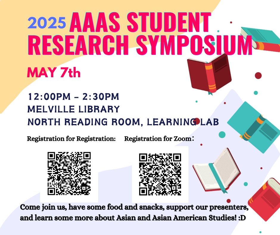 AAAS Student Research Symposium 2025 Wednesday, May 7, 2025 | 12:00-2:30 pm We welcome students exploring topics in Asian & Asian American Studies to share their research and ideas. Register to be a student presenter!