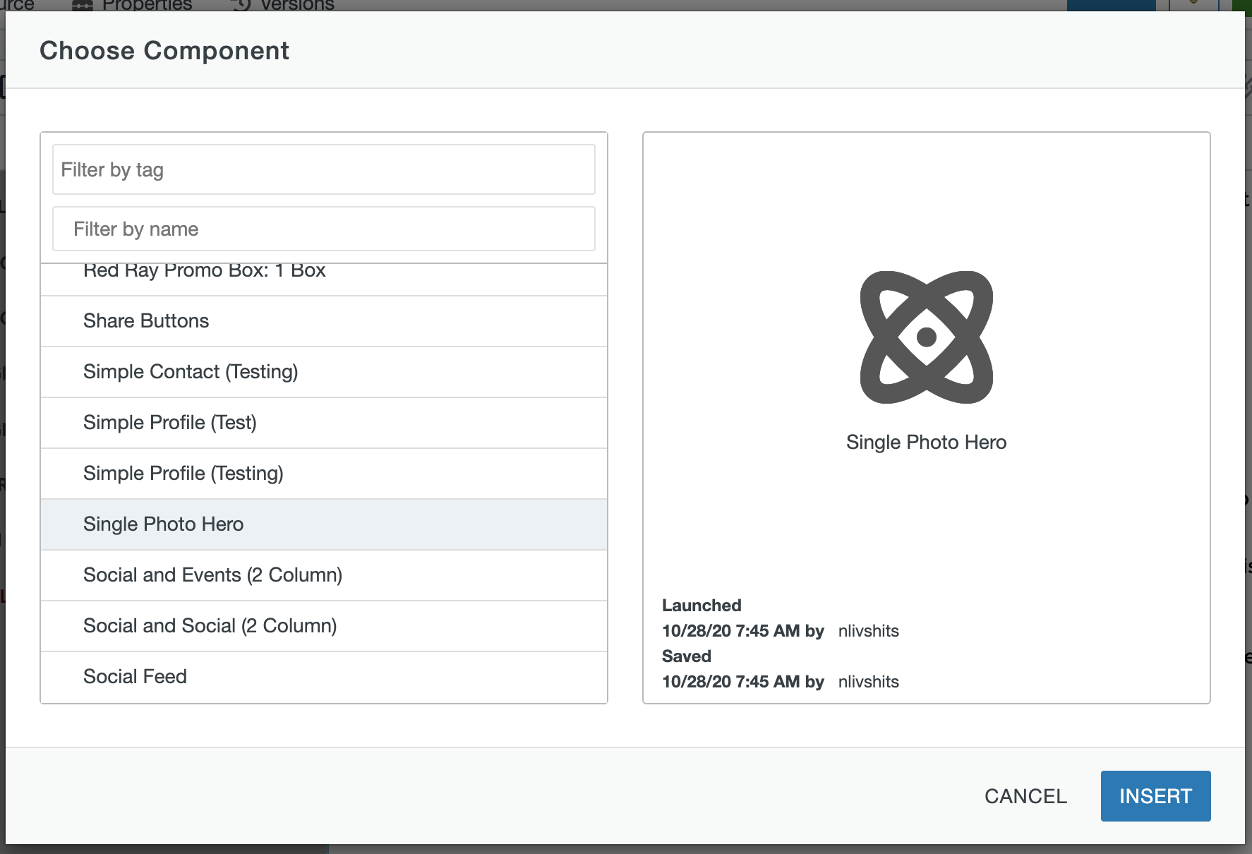 1) Click the "Insert Component" button as seen below, choose the "Single Photo Hero" component and click the Insert button.