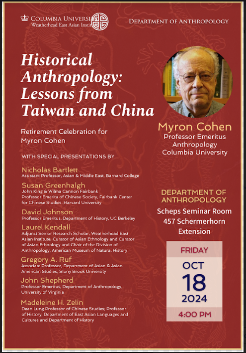 Talk by Greg Ruf " History in a Positive Light: The Ethnographic Empiricism of Myron L. Cohen" at Historical Anthropology: Lessons fromTaiwan and China at Columbia University, Oct. 18, 2024