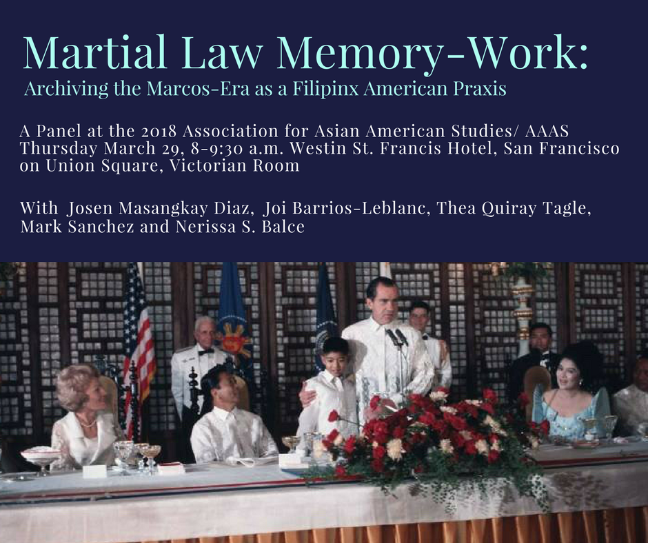 * Nerissa Balce presented her research on photography, memory and the Marcos regime for the panel " Martial Law Memory-Work" at the 2018 Association for Asian American Studies annual conference on March 29, Thursday, at the Westin St. Francis Hotel, San Francisco on Union Square (Victorian Room).