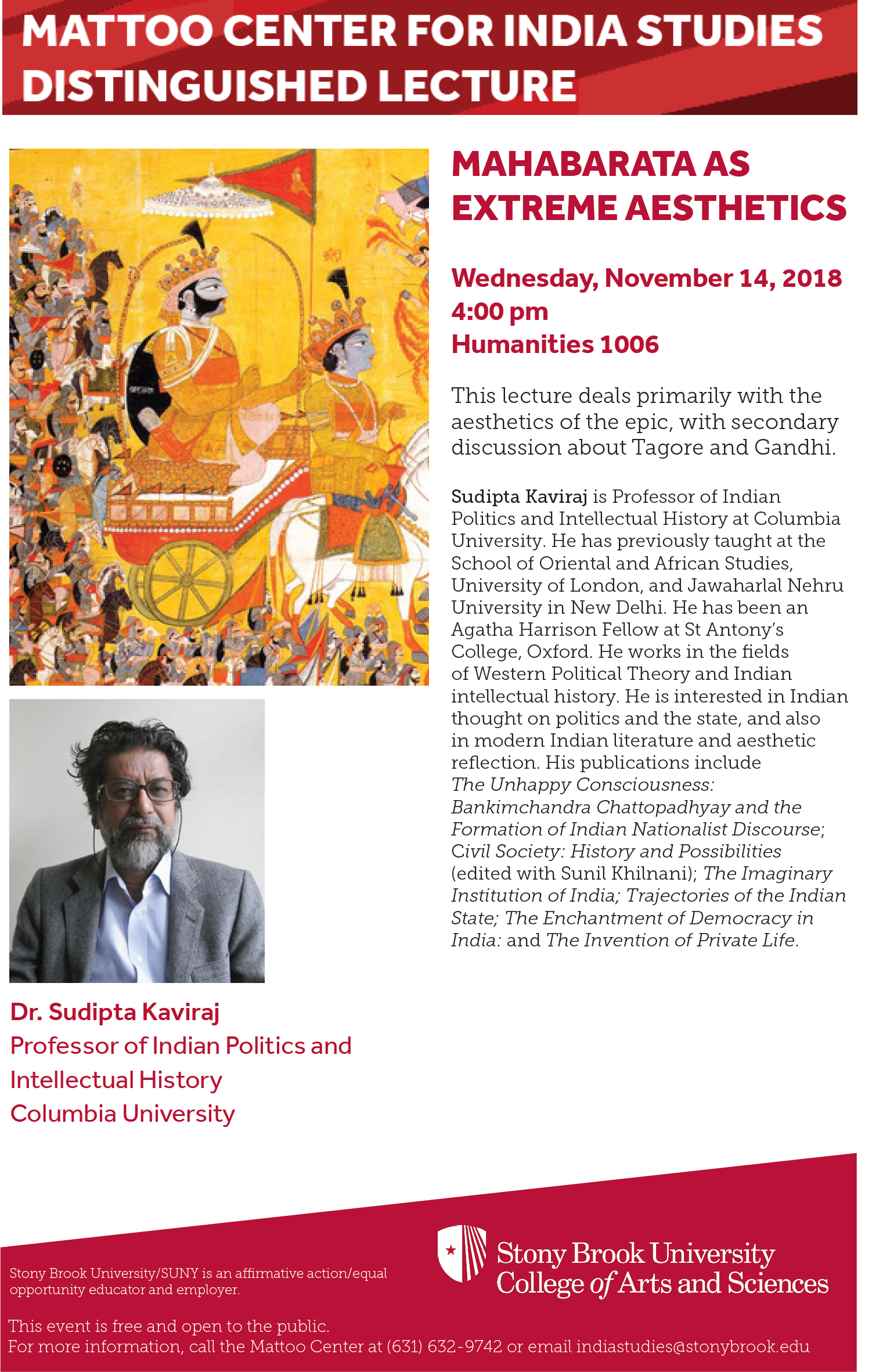 * The Mattoo Center for India Studies Distinguished Lecture, Mahabarata as Extreme Aesthetics on Wednesday, November 14, 2018, 4:00 pm in Humanities 1006.