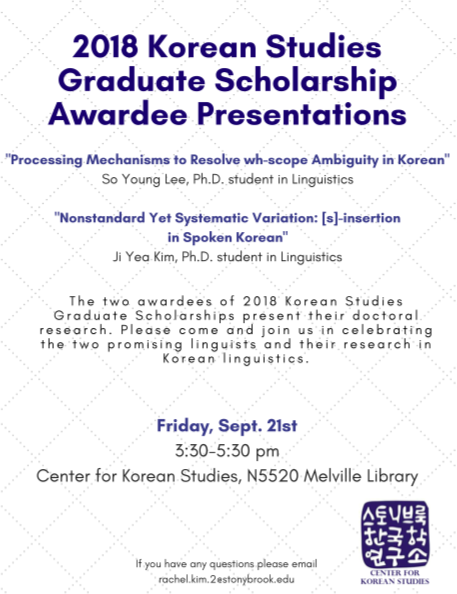 * The two graduate scholarship winners in Korean Studies for 2018 are presenting their research on Korean linguistics on Friday, September 21, 2018. Please come join us to celebrate their research.