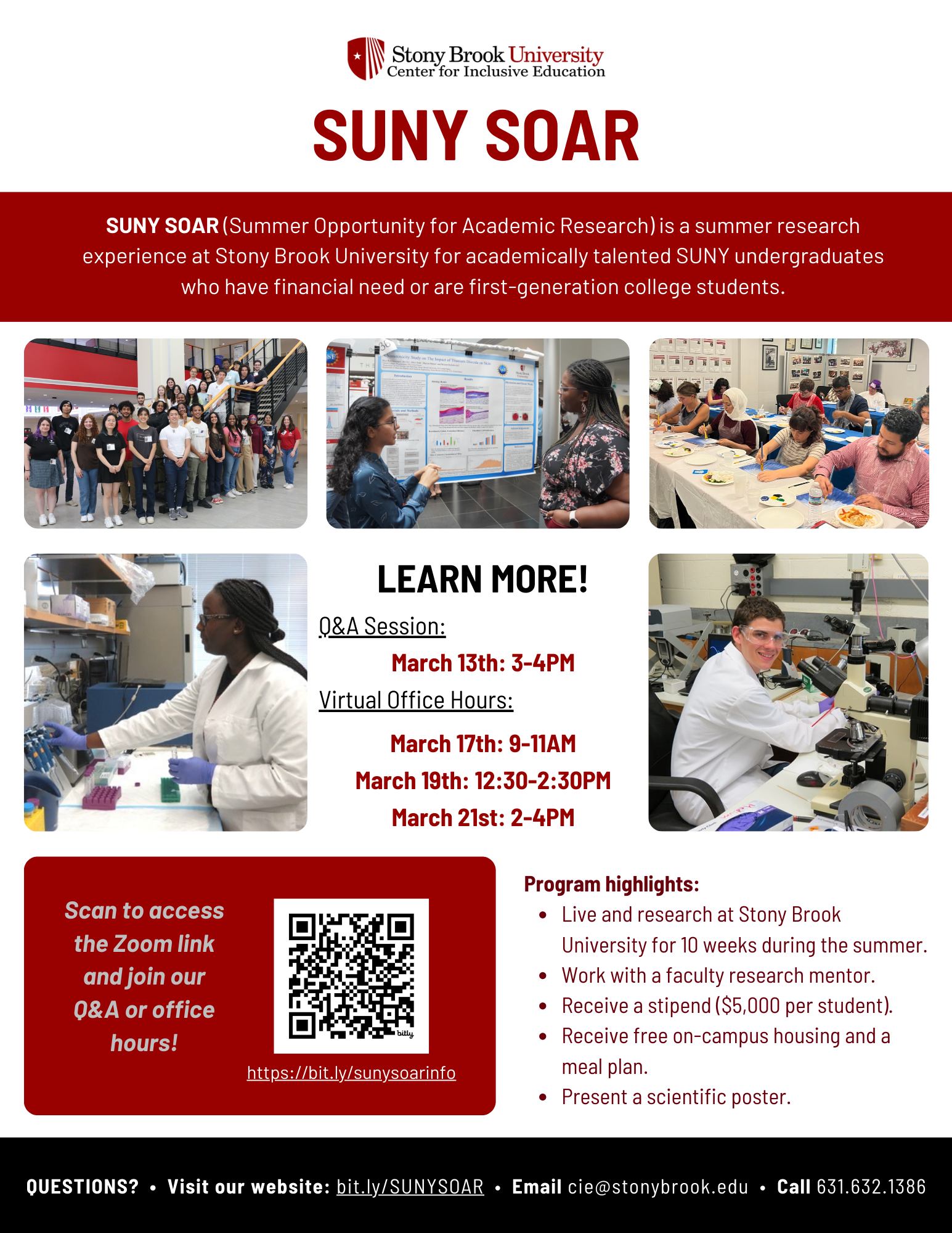 SUNY SOAR : Summer Opportunity for Academic Research is for qualified, academically talented, and motivated undergraduates seeking a summer research experience at Stony Brook University. SOAR students engage in intensive research experiences with leading researchers in the field.
