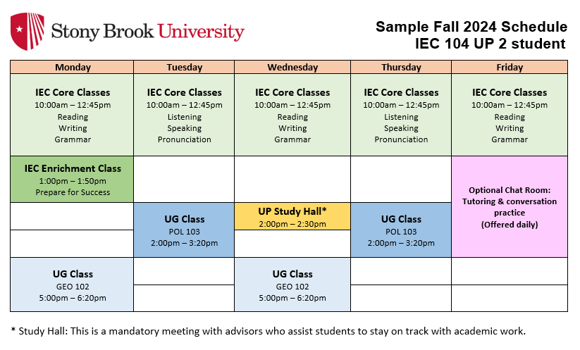 Click on the links below for examples of a weekly class schedule for an UP 1 or UP 2 student. Please note that undergraduate classes can be scheduled before or after IEC core classes.