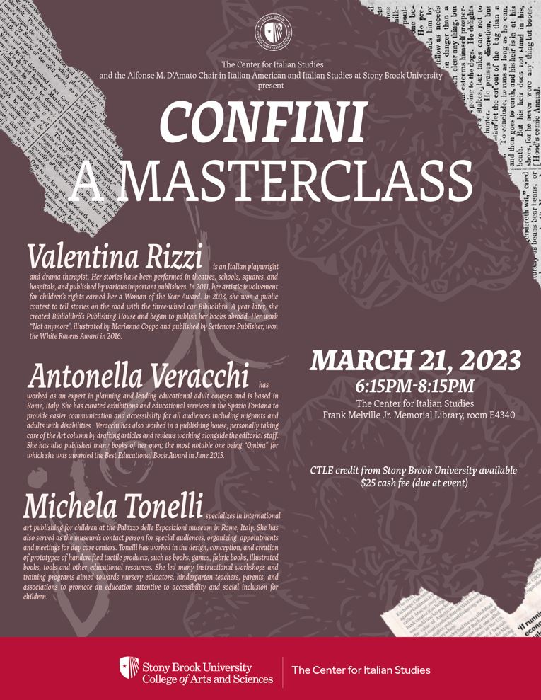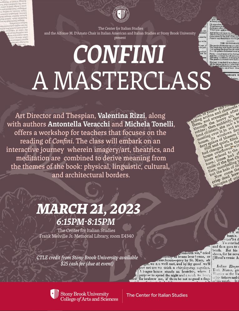 Art Director and Thespian, Valentina Rizzi, along with authors Antonella Veracchi and Michela Tonelli, offers a workshop for teachers that focuses on the reading of Confini. CTLE credit from SBU is available ($25 cash fee due at event).