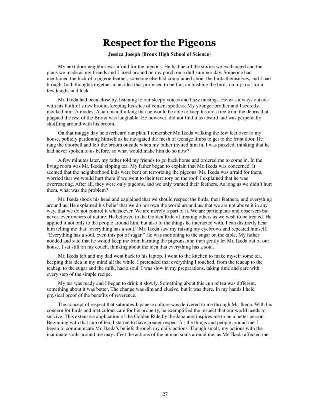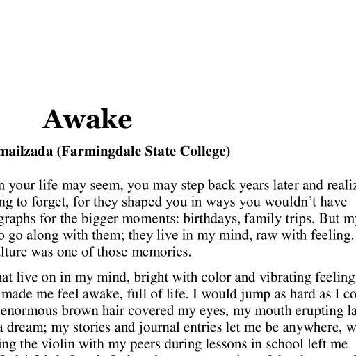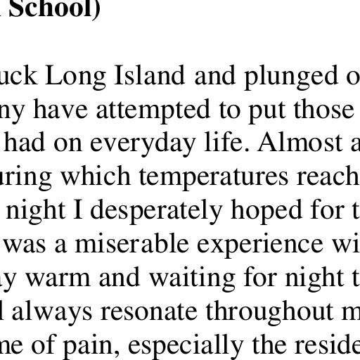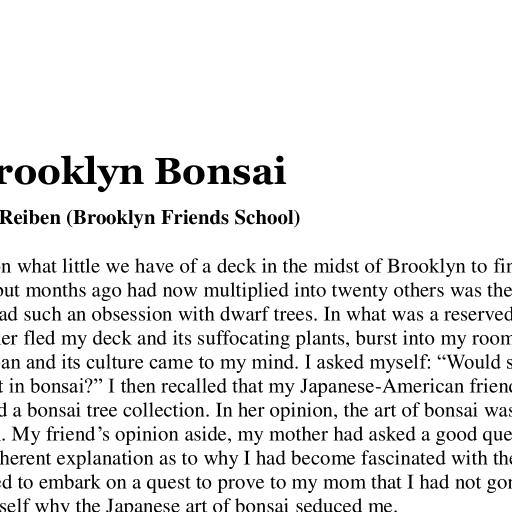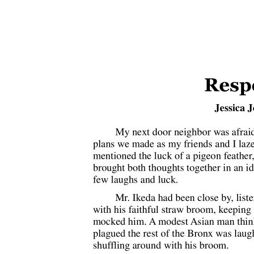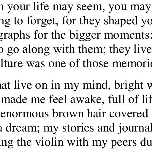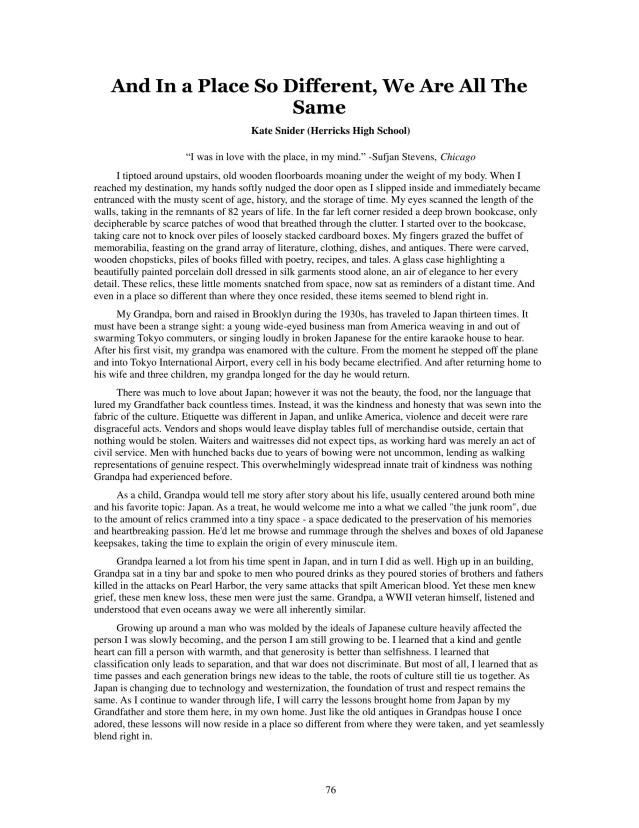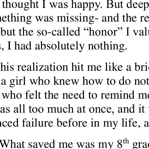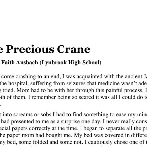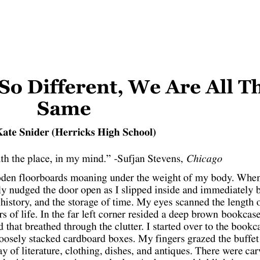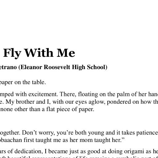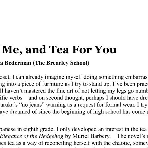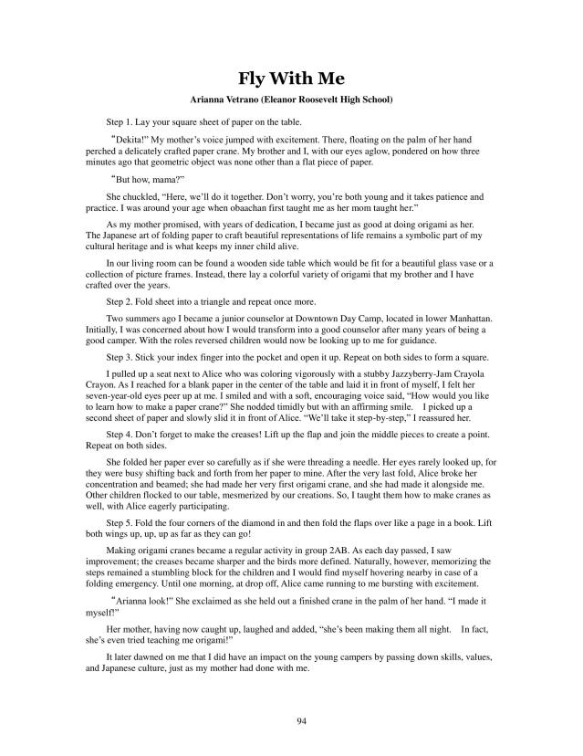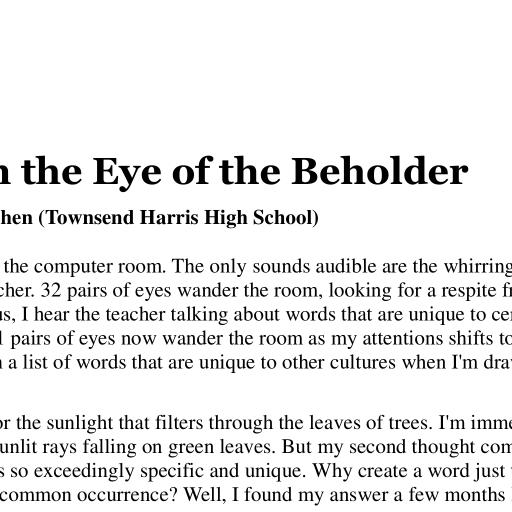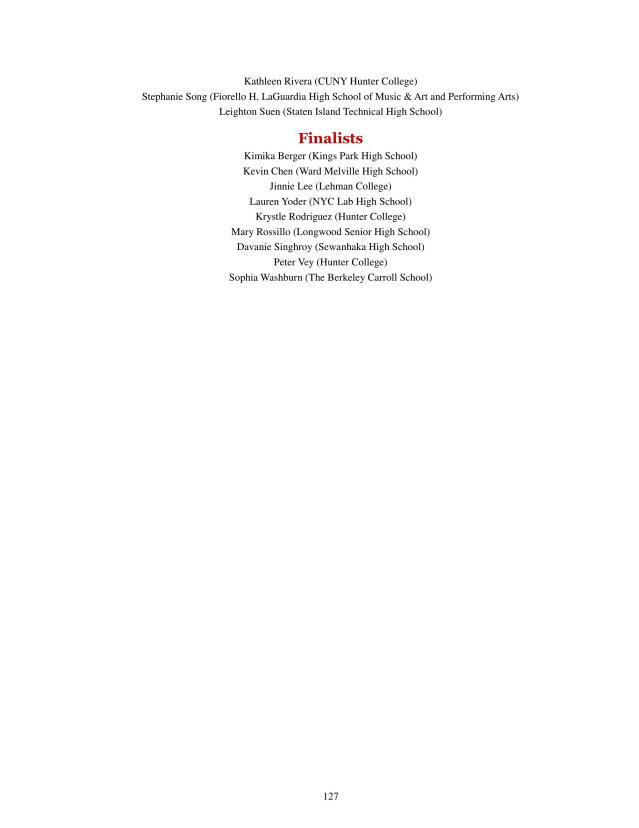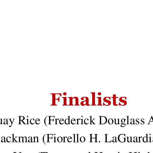 “A Remedy for Loneliness”Tia Culbreath (The Young Women’s Leadership School of Brooklyn)At a young age, I lost both of my parents. Of course, I was too young to fully understand what had happened to them, and why they stopped coming home after those fateful days. But a tiny, itty-bitty pit of loneliness began to form in me. I began to distance myself, making it harder to grow socially as I grew older. I didn't realize I was forming a barrier around myself, keeping people away when I needed them the most. That pit only grew more and more as I deserted my social needs and refused to socialize with other children. I lacked the tools I needed to express myself, to convey my feelings to the people around me. I was desperate for socialization, but allowed fear to keep my tongue still. No one could really understand me. In fact, I couldn't really understand myself at all.