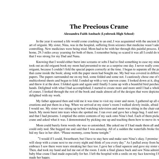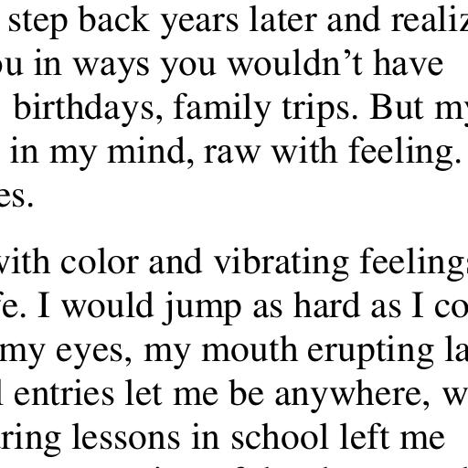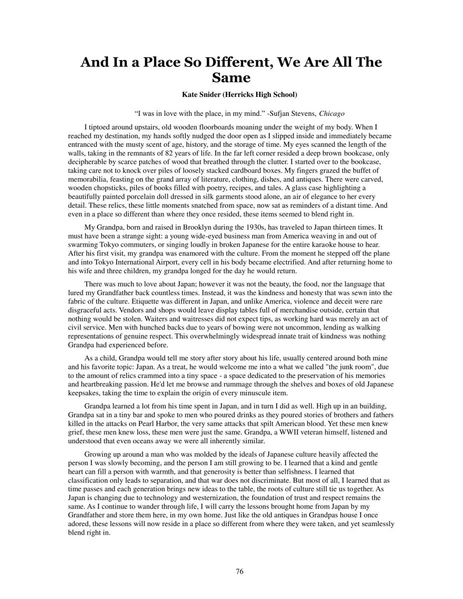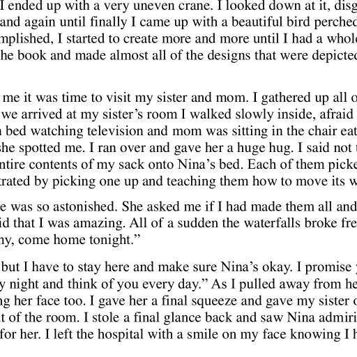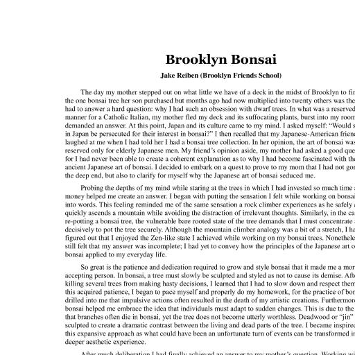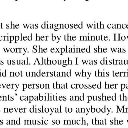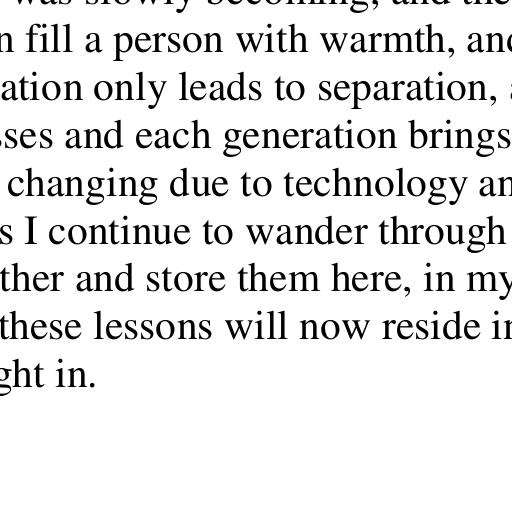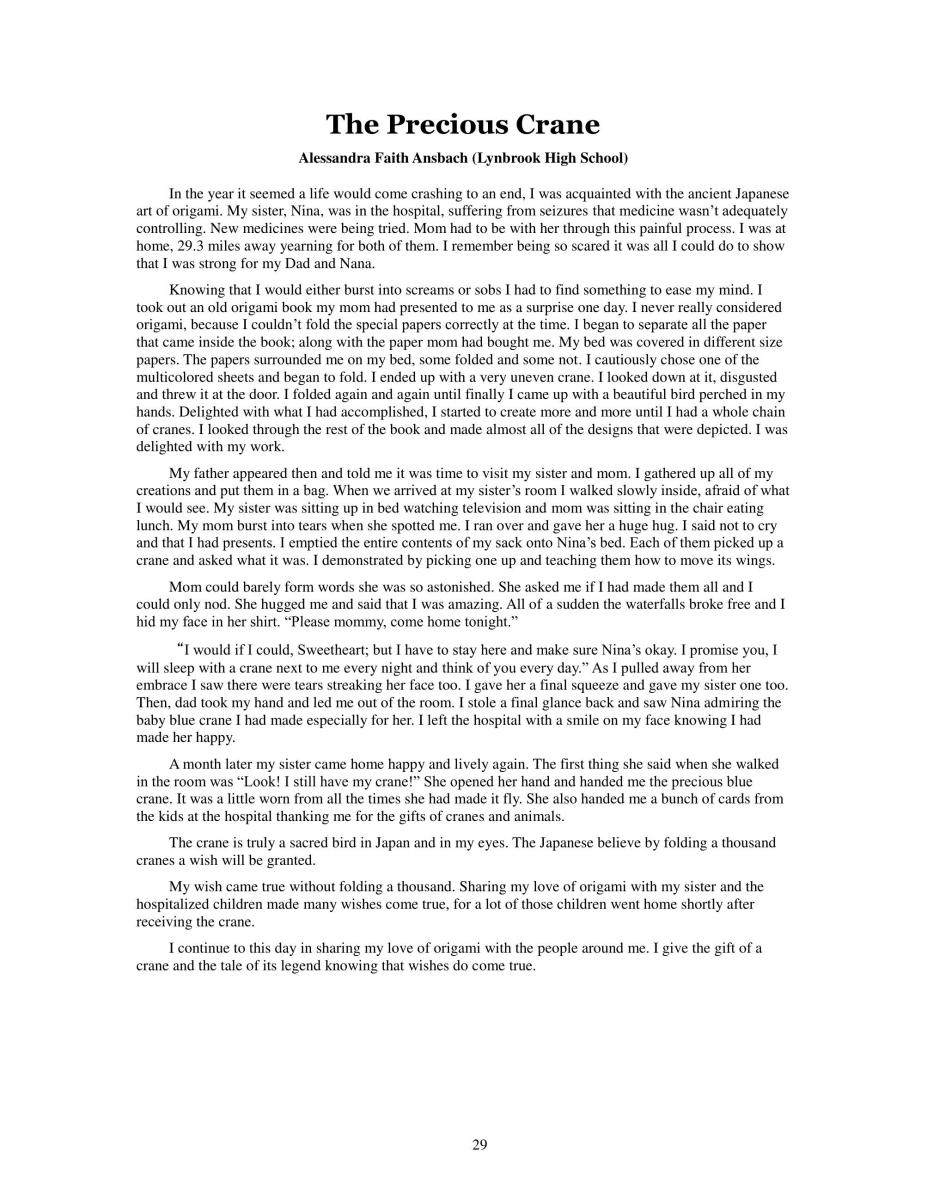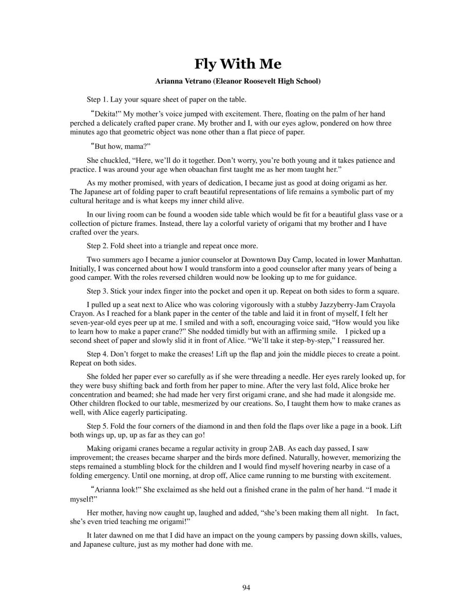 “A Remedy for Loneliness”Tia Culbreath (The Young Women’s Leadership School of Brooklyn)At a young age, I lost both of my parents. Of course, I was too young to fully understand what had happened to them, and why they stopped coming home after those fateful days. But a tiny, itty-bitty pit of loneliness began to form in me. I began to distance myself, making it harder to grow socially as I grew older. I didn't realize I was forming a barrier around myself, keeping people away when I needed them the most. That pit only grew more and more as I deserted my social needs and refused to socialize with other children. I lacked the tools I needed to express myself, to convey my feelings to the people around me. I was desperate for socialization, but allowed fear to keep my tongue still. No one could really understand me. In fact, I couldn't really understand myself at all.
