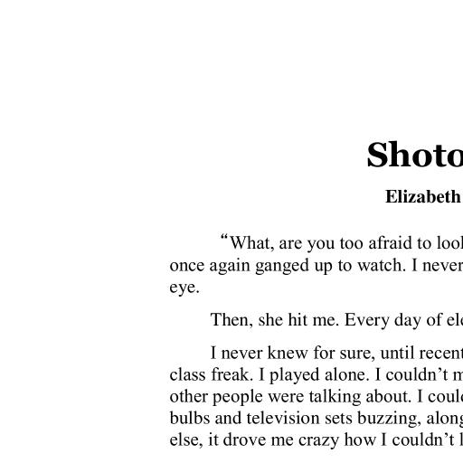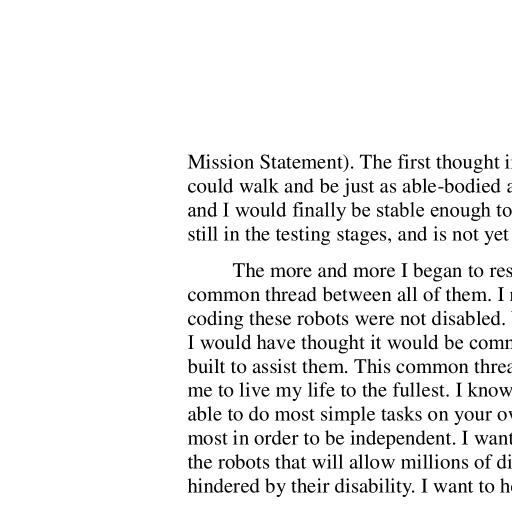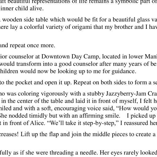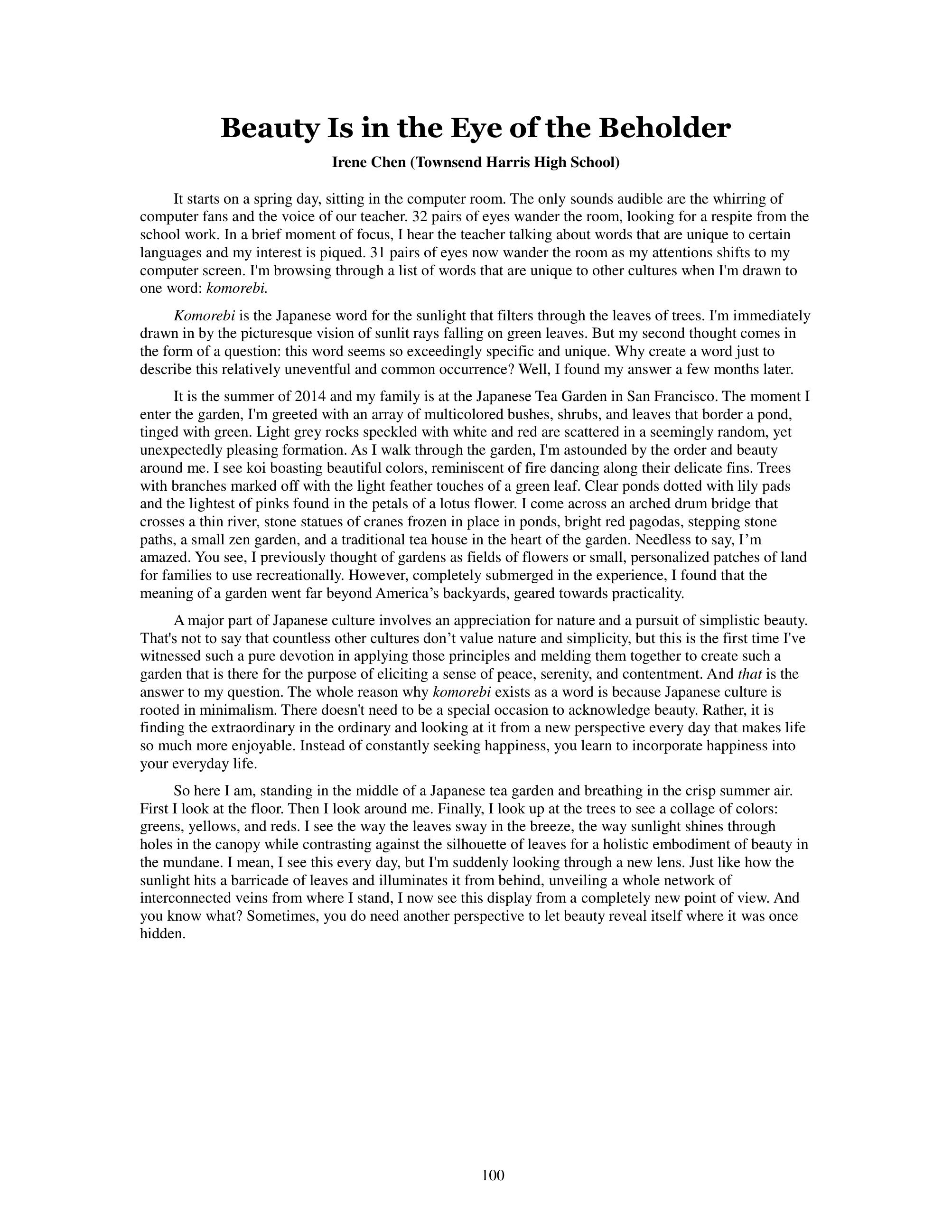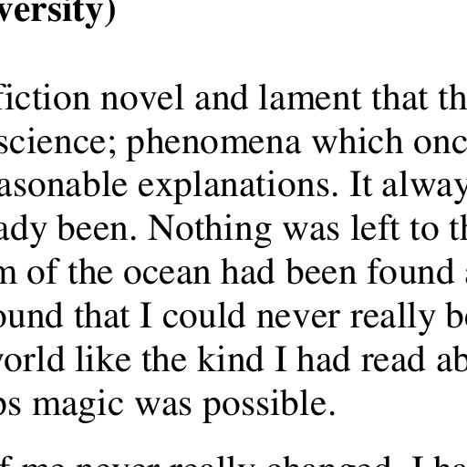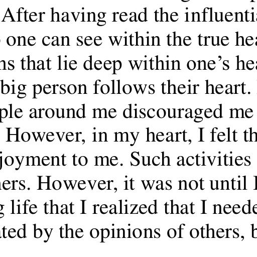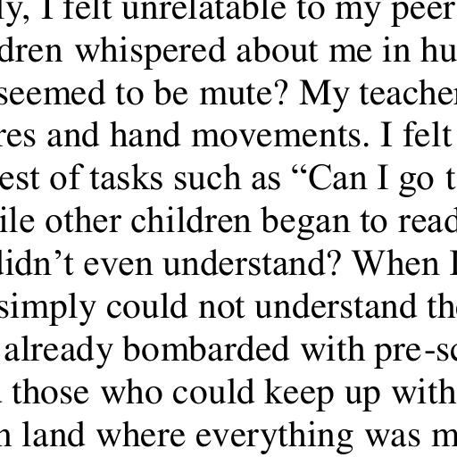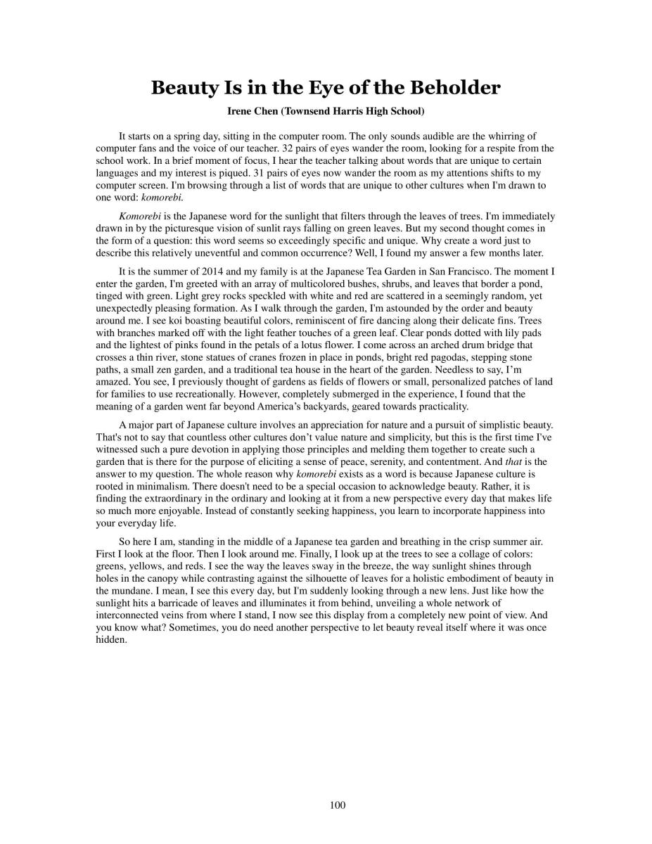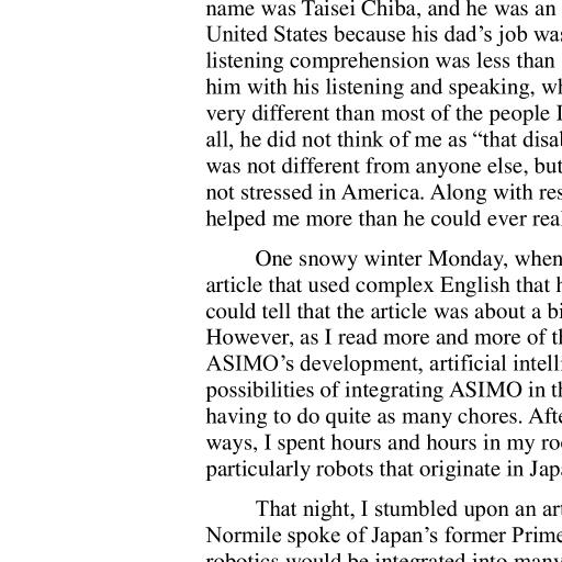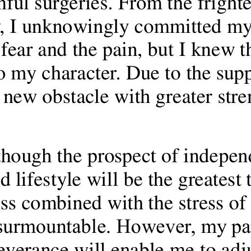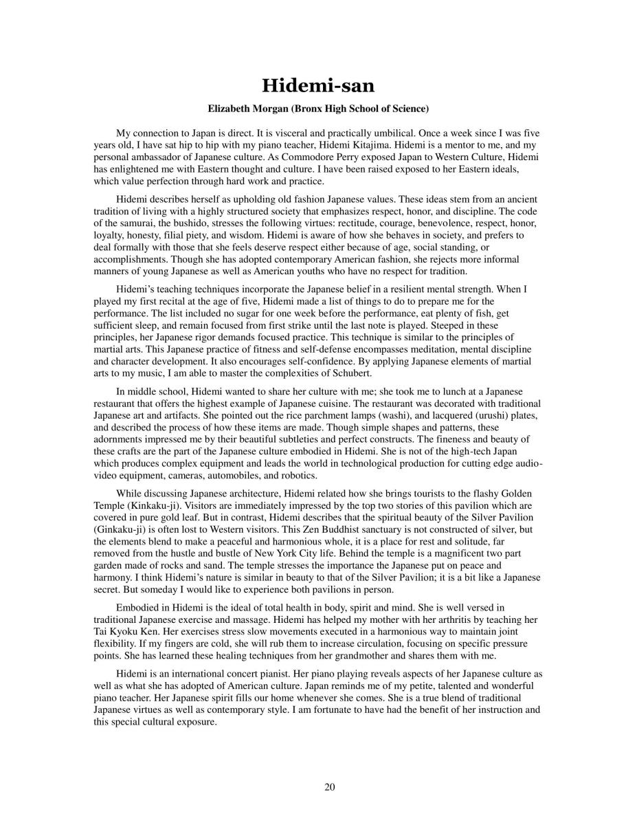 “A Remedy for Loneliness”Tia Culbreath (The Young Women’s Leadership School of Brooklyn)At a young age, I lost both of my parents. Of course, I was too young to fully understand what had happened to them, and why they stopped coming home after those fateful days. But a tiny, itty-bitty pit of loneliness began to form in me. I began to distance myself, making it harder to grow socially as I grew older. I didn't realize I was forming a barrier around myself, keeping people away when I needed them the most. That pit only grew more and more as I deserted my social needs and refused to socialize with other children. I lacked the tools I needed to express myself, to convey my feelings to the people around me. I was desperate for socialization, but allowed fear to keep my tongue still. No one could really understand me. In fact, I couldn't really understand myself at all.