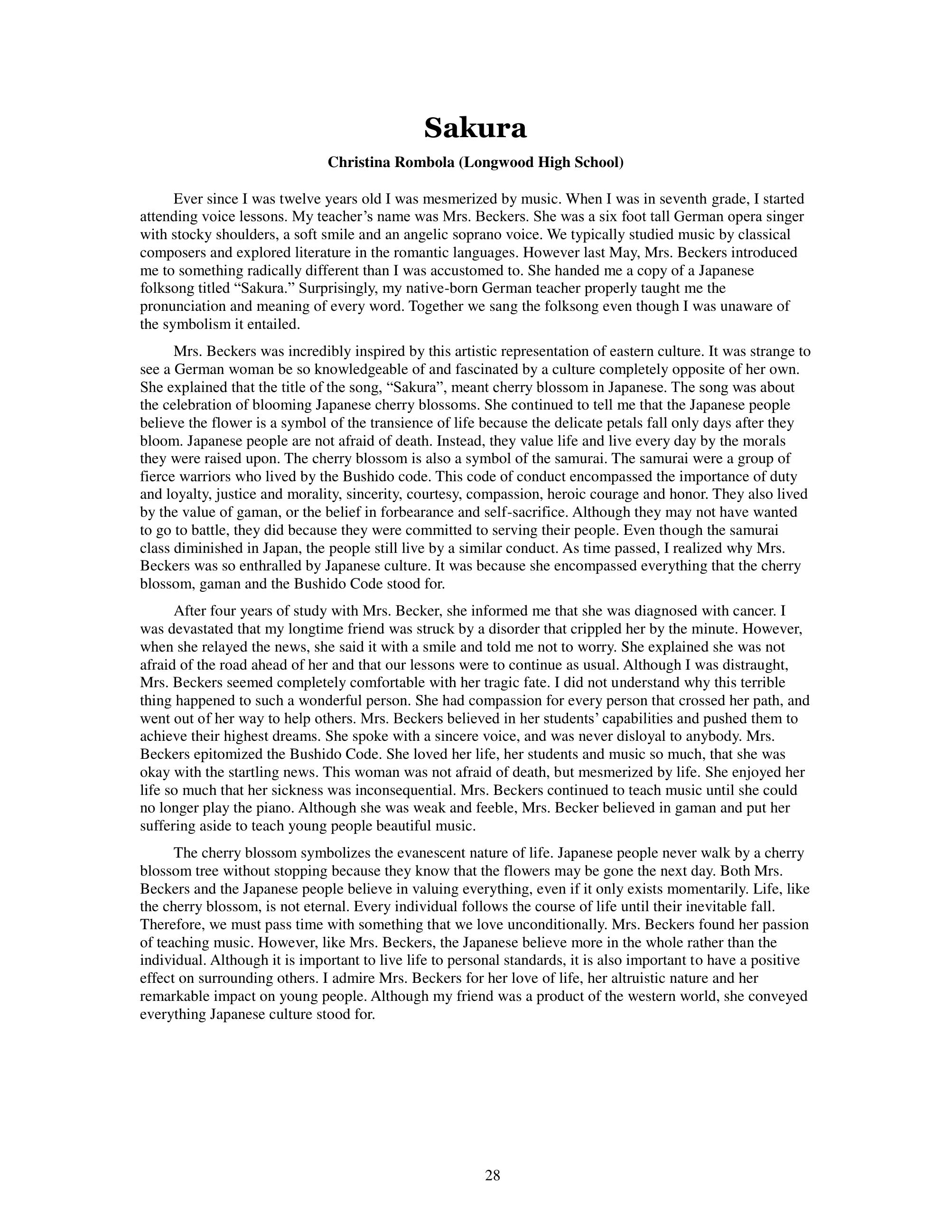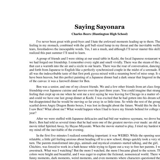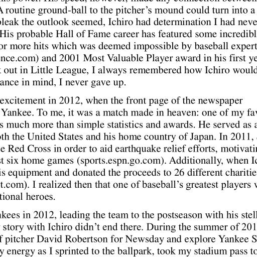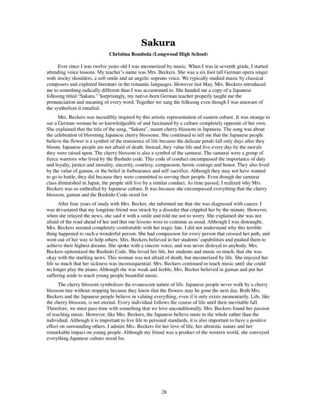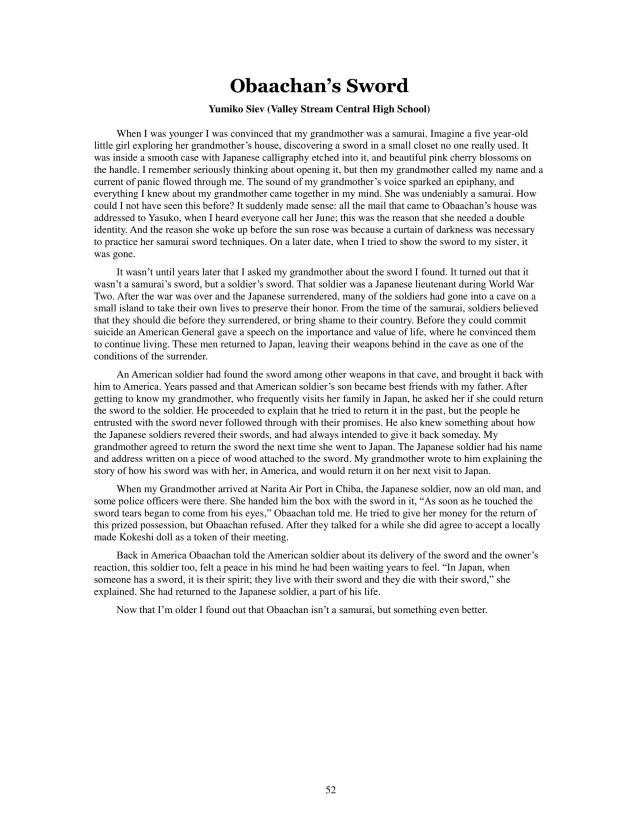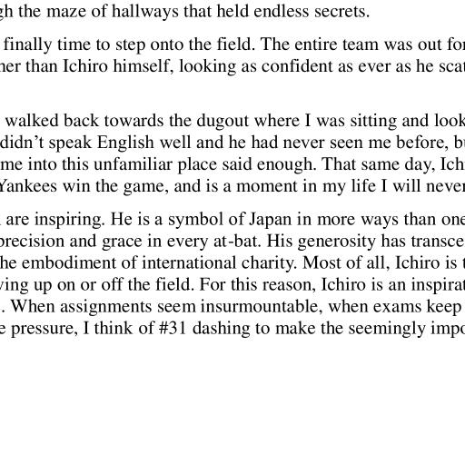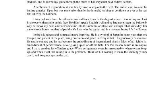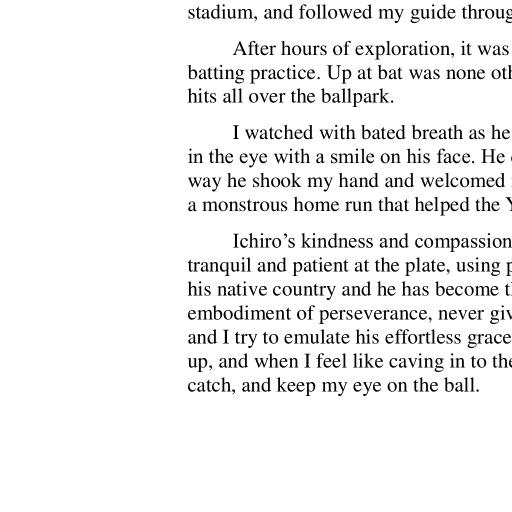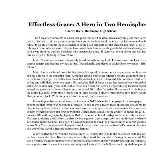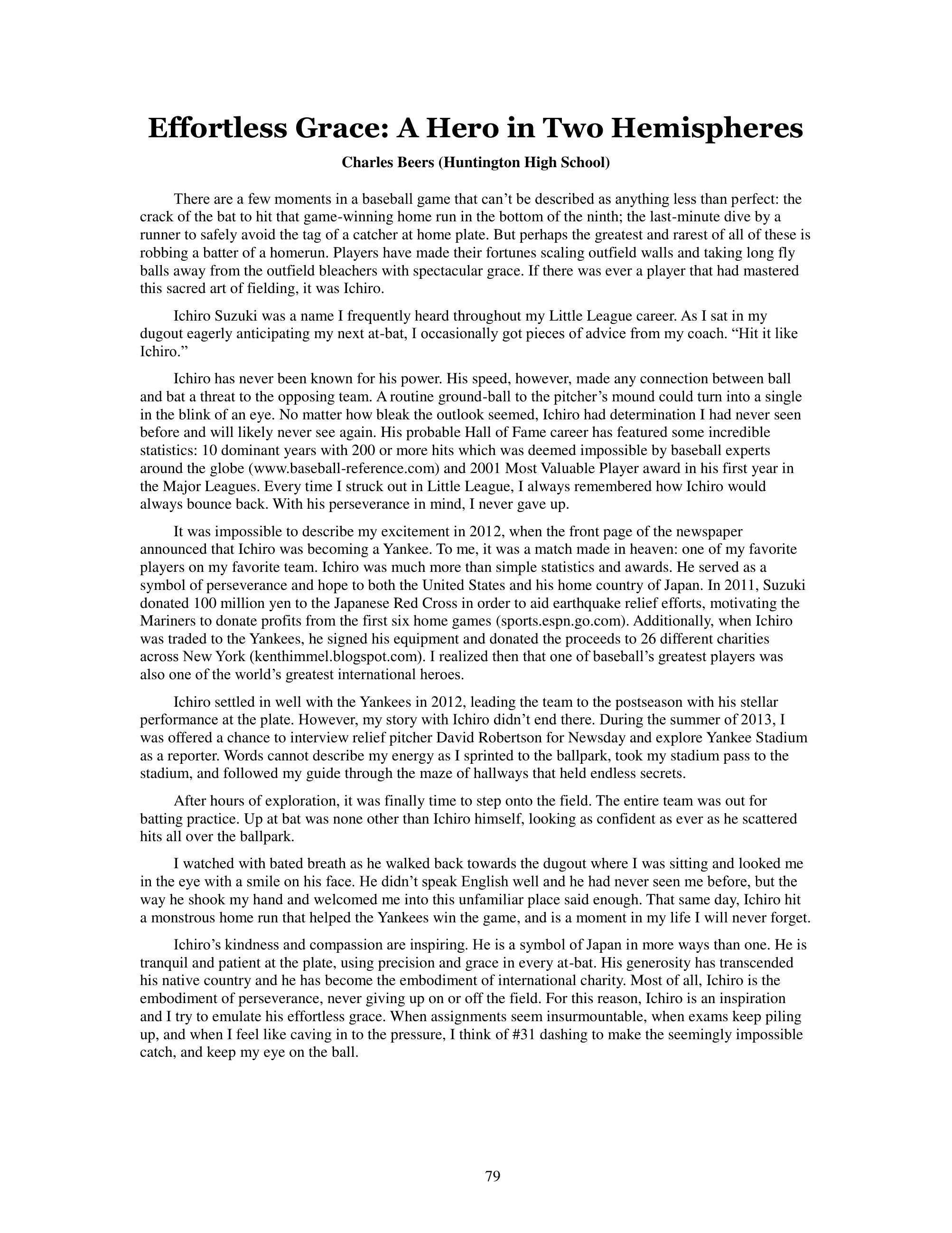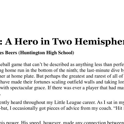 “Samurai in the Outfield”Colin Capece (Chaminade High School)My family is a baseball family. Baseball fascinates us. Baseball enthralls us. Baseball brings us together. Our family vacations are spent visiting ballparks and opening day is a cause for celebration. So it is no surprise that one of my family’s favorite summer pastimes is to tune in for the Little League World Series. Even though my three brothers and I are past our Little League baseball days, we still enjoy watching younger kids play in the annual tournament held in Williamsport, Pennsylvania. Year after year, we are mesmerized and our family conversation is dominated by the names and stories of the teams in that year’s competition.
