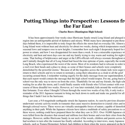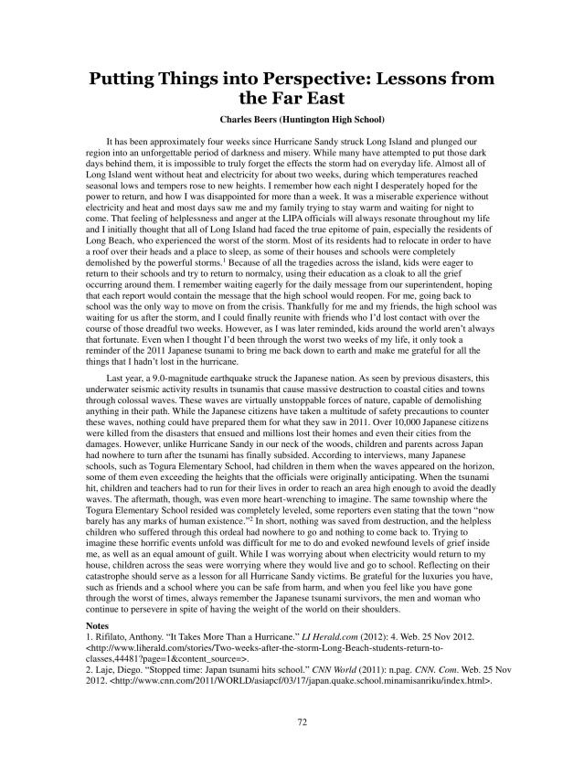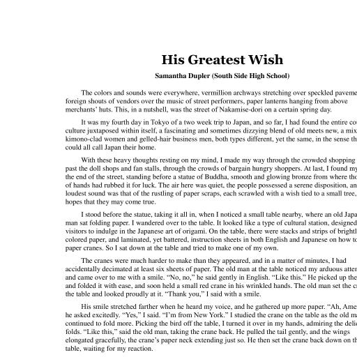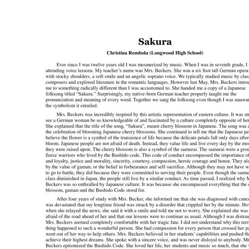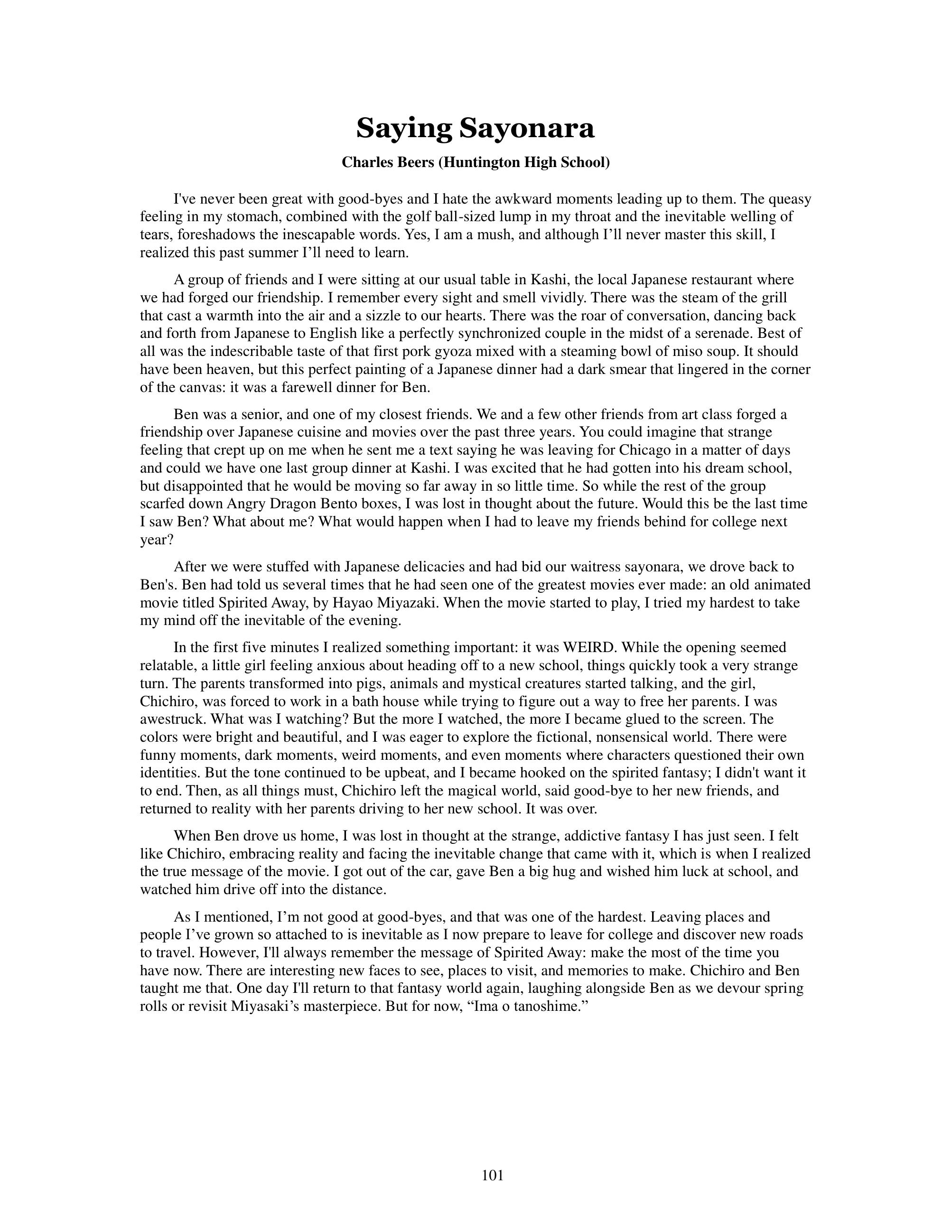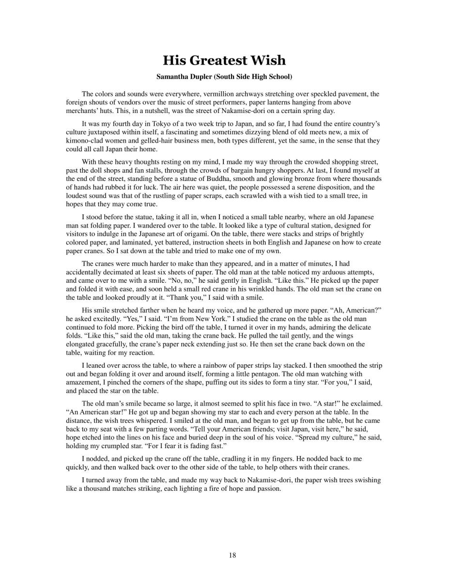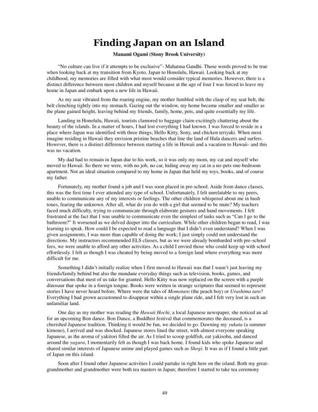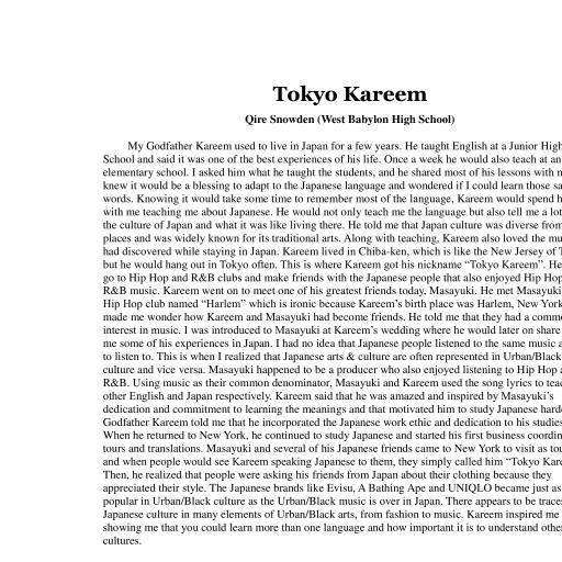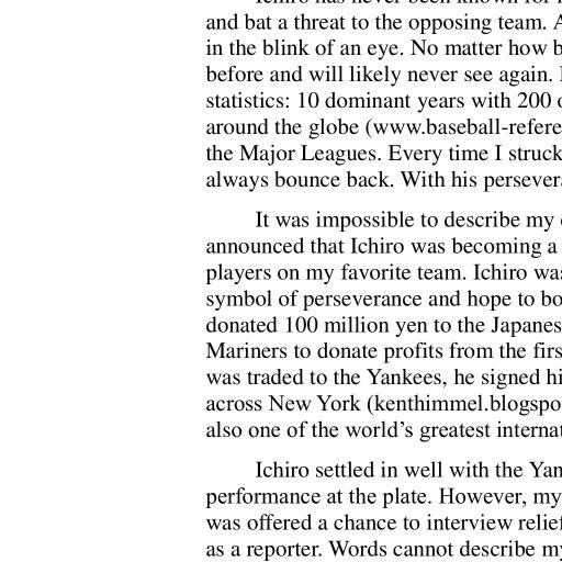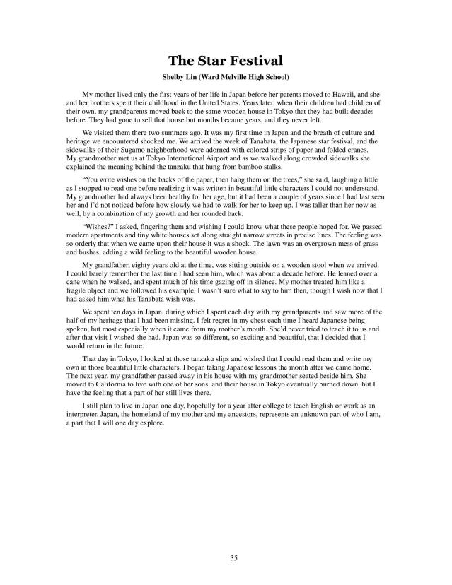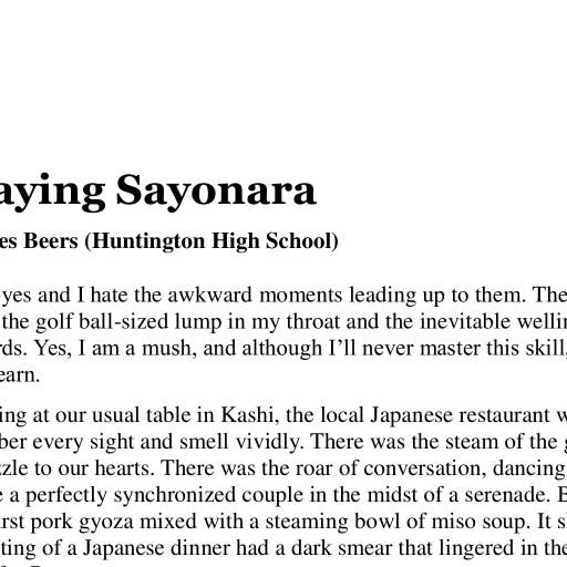 “Samurai in the Outfield”Colin Capece (Chaminade High School)My family is a baseball family. Baseball fascinates us. Baseball enthralls us. Baseball brings us together. Our family vacations are spent visiting ballparks and opening day is a cause for celebration. So it is no surprise that one of my family’s favorite summer pastimes is to tune in for the Little League World Series. Even though my three brothers and I are past our Little League baseball days, we still enjoy watching younger kids play in the annual tournament held in Williamsport, Pennsylvania. Year after year, we are mesmerized and our family conversation is dominated by the names and stories of the teams in that year’s competition.