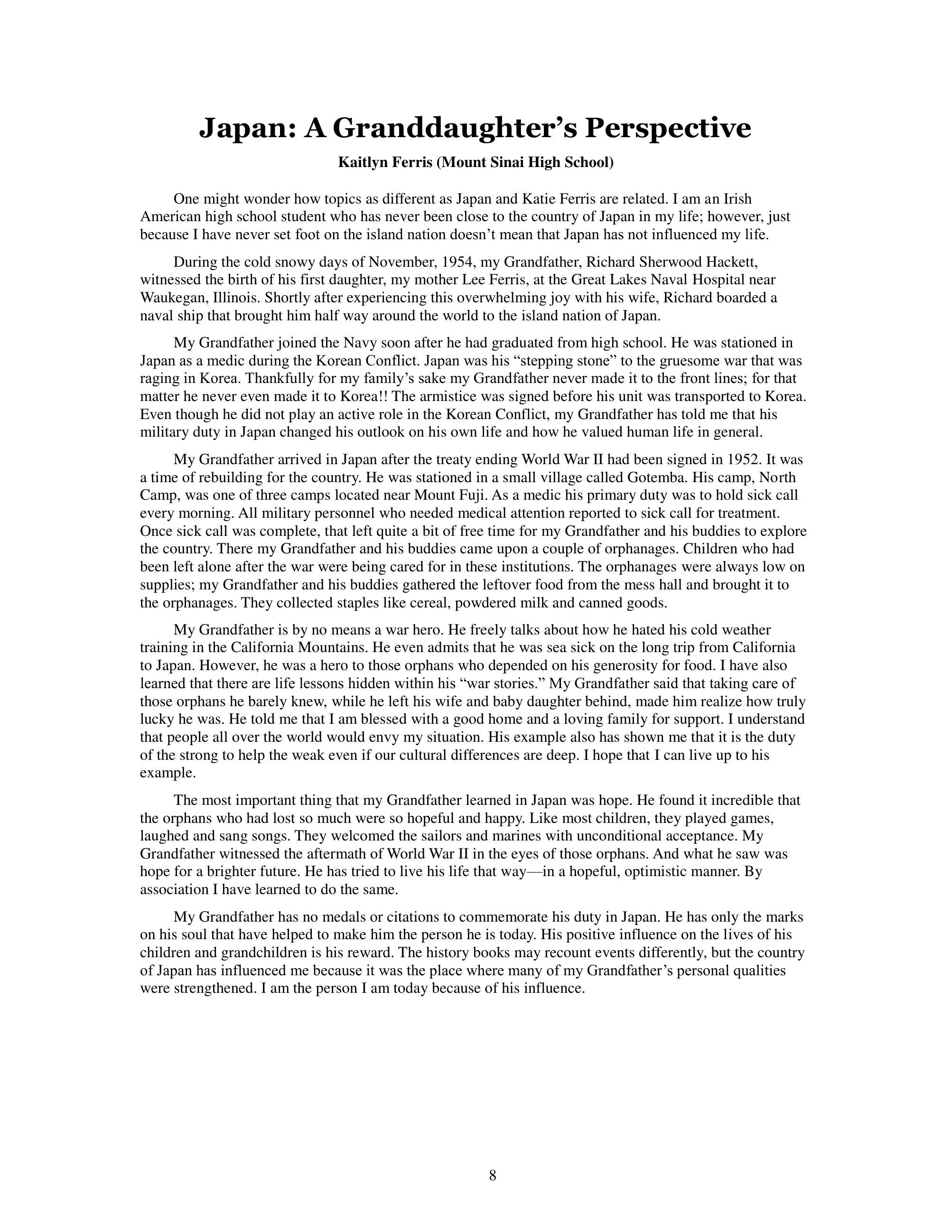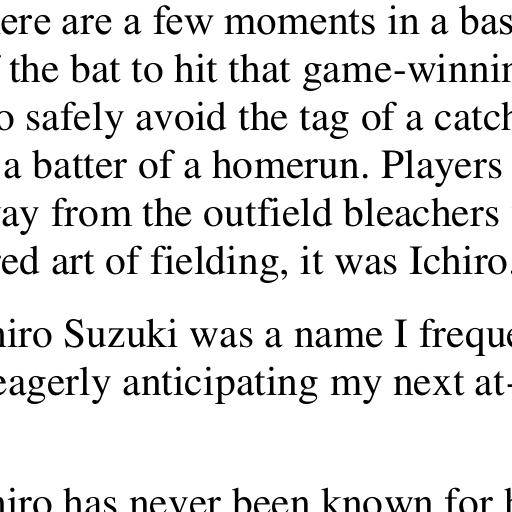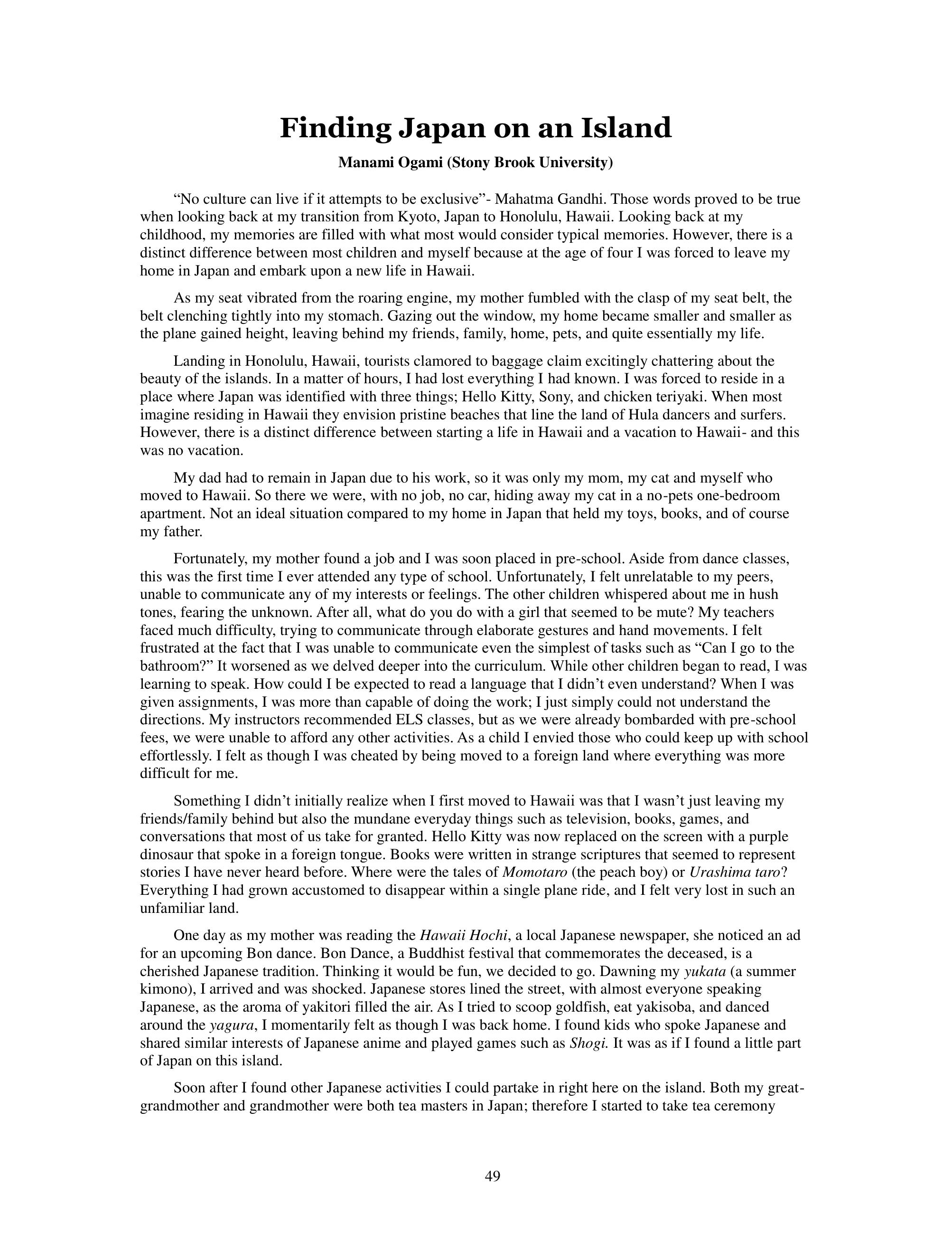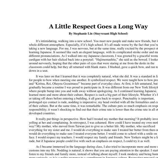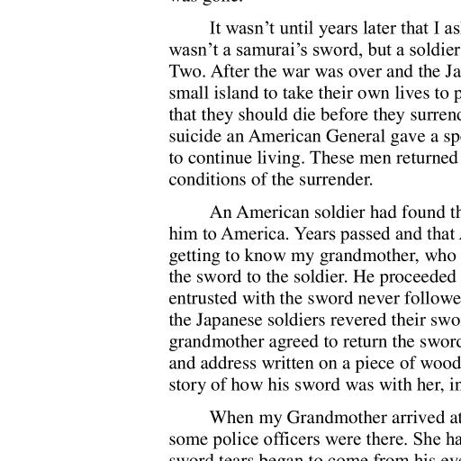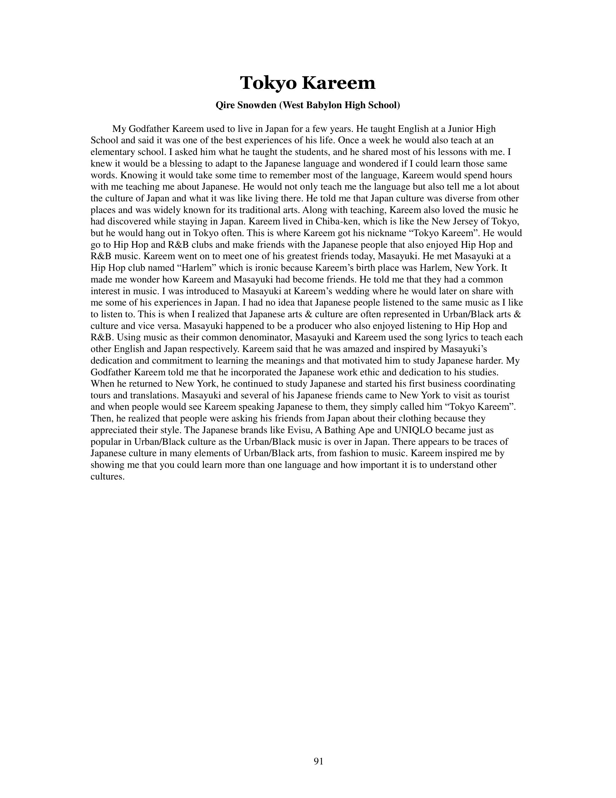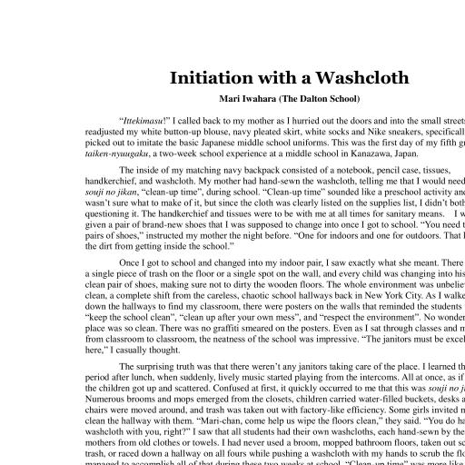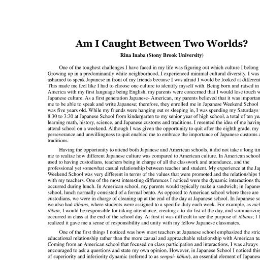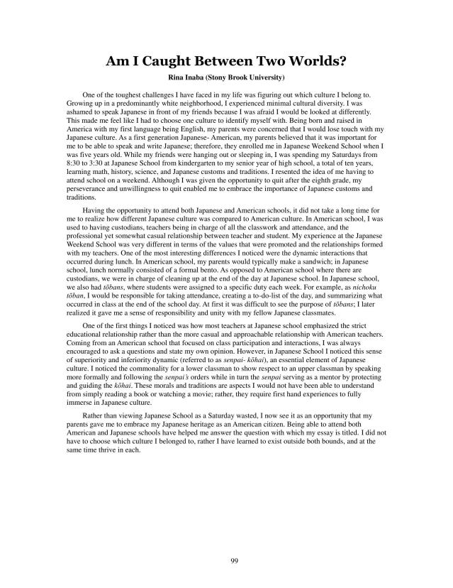 “Samurai in the Outfield”Colin Capece (Chaminade High School)My family is a baseball family. Baseball fascinates us. Baseball enthralls us. Baseball brings us together. Our family vacations are spent visiting ballparks and opening day is a cause for celebration. So it is no surprise that one of my family’s favorite summer pastimes is to tune in for the Little League World Series. Even though my three brothers and I are past our Little League baseball days, we still enjoy watching younger kids play in the annual tournament held in Williamsport, Pennsylvania. Year after year, we are mesmerized and our family conversation is dominated by the names and stories of the teams in that year’s competition.