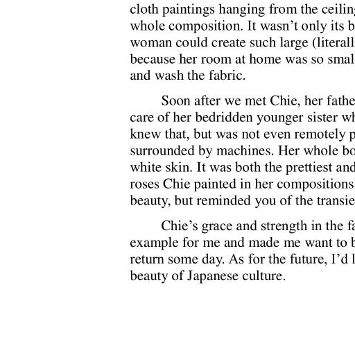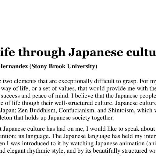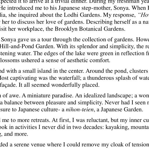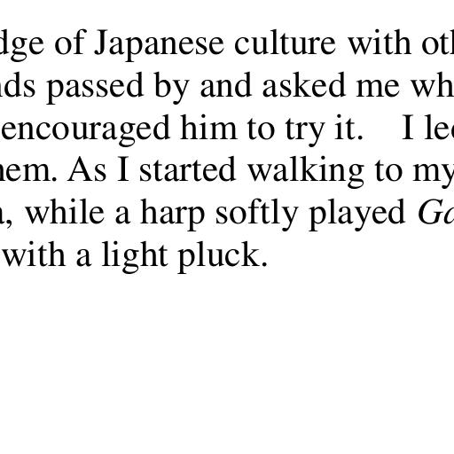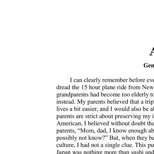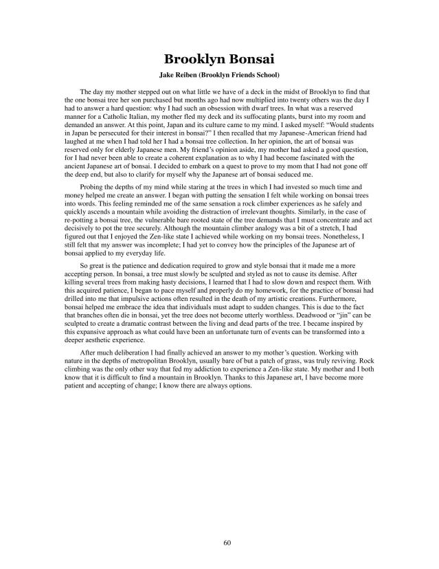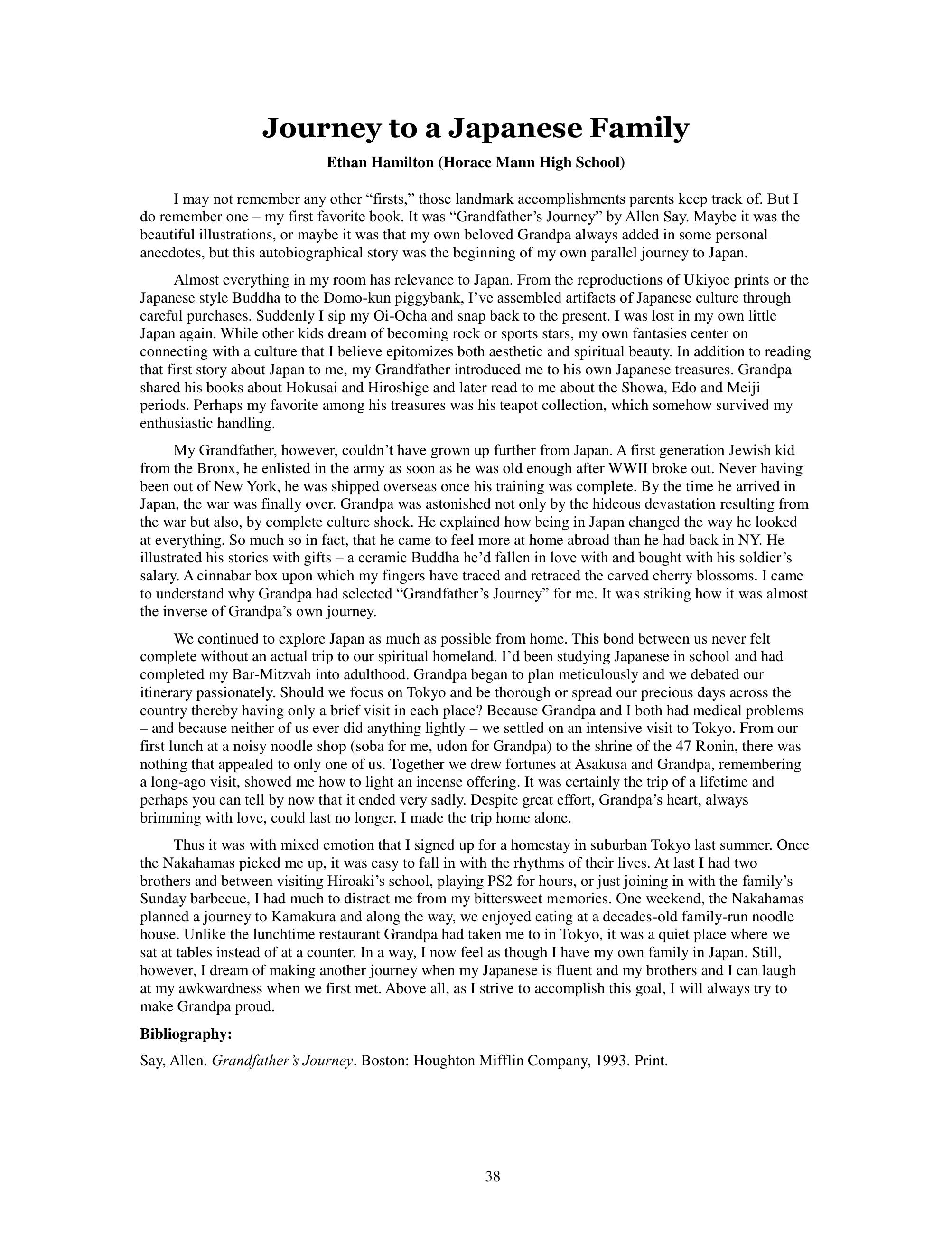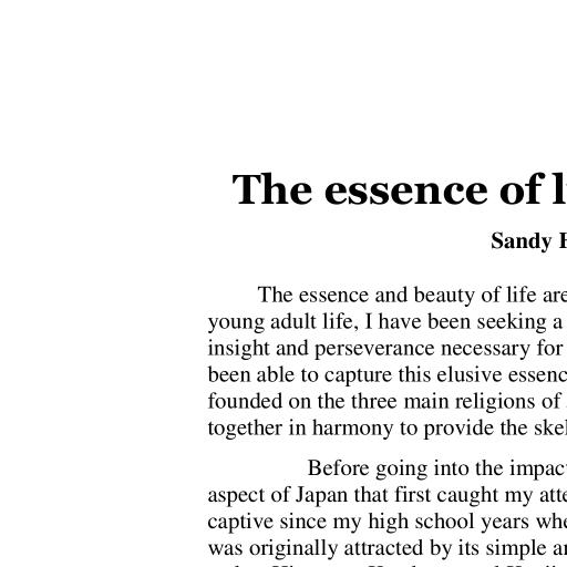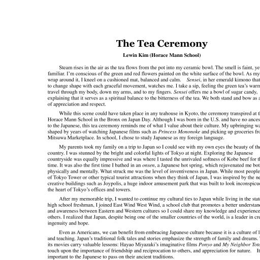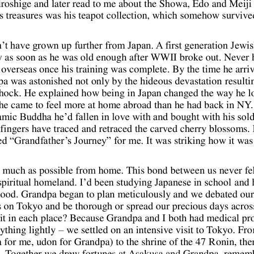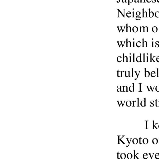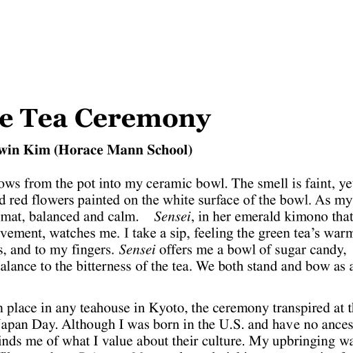 “A Buddhist Culture: Japan and the Monks”Kazuo Nakamura (Northfield Mount Hermon)I rested my head against the window as the train departed Tokyo Station. A temple, that is where I was going to be for the next eight days. My protests to my parents did not change anything, I had no choice but to go. Headed toward Kyoto, my long journey, reluctantly, began.