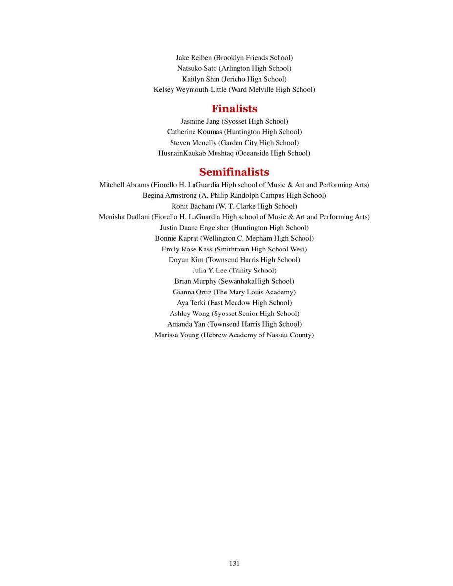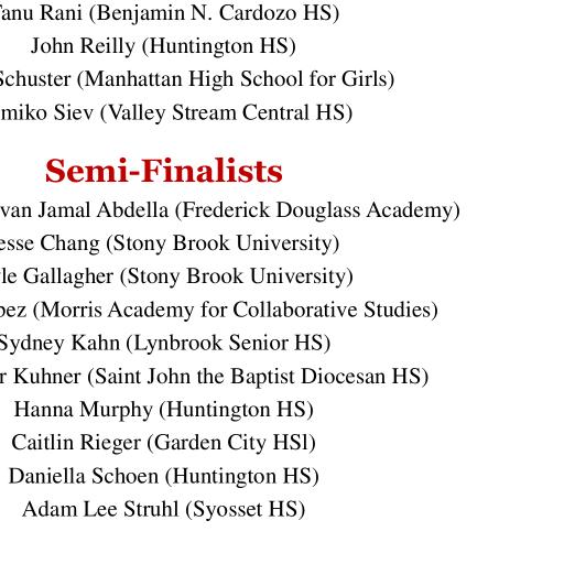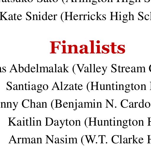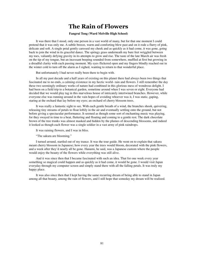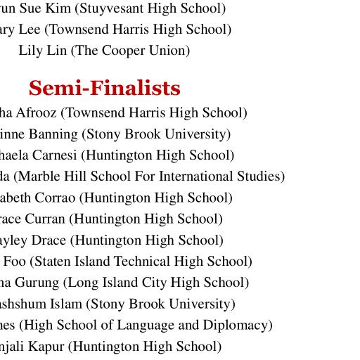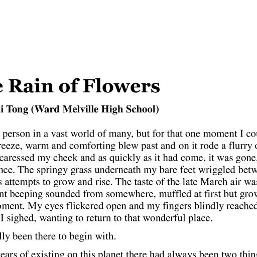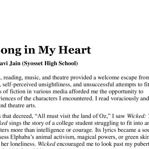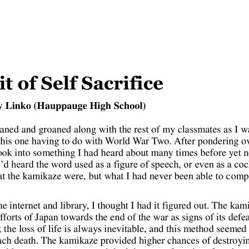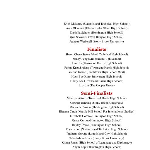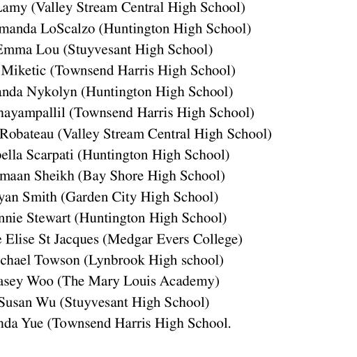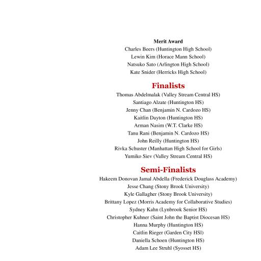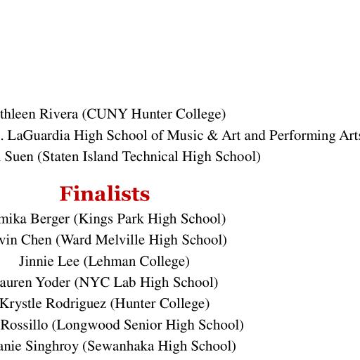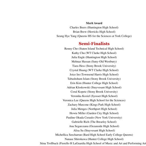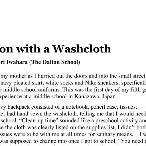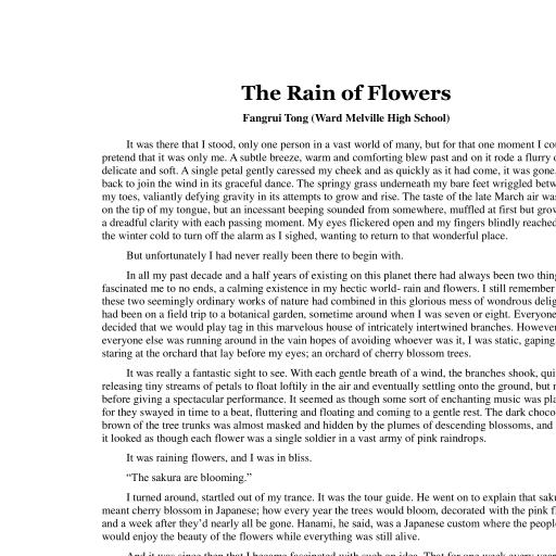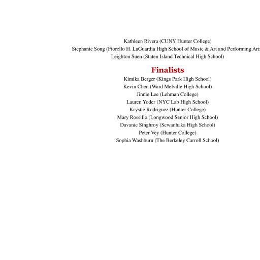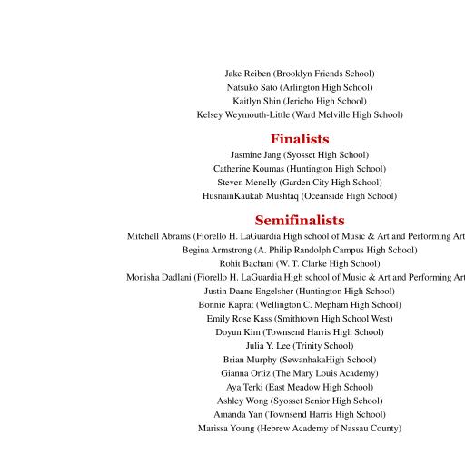 “Track: The Mental Game”Rachel Kitagawa (Syosset High School)“You have to run with your heart, not just for yourself, but for each other. When you feel like giving up, know that everyone else is facing the same pain, and they aren’t giving up.” I hear my coach say.