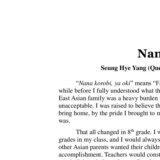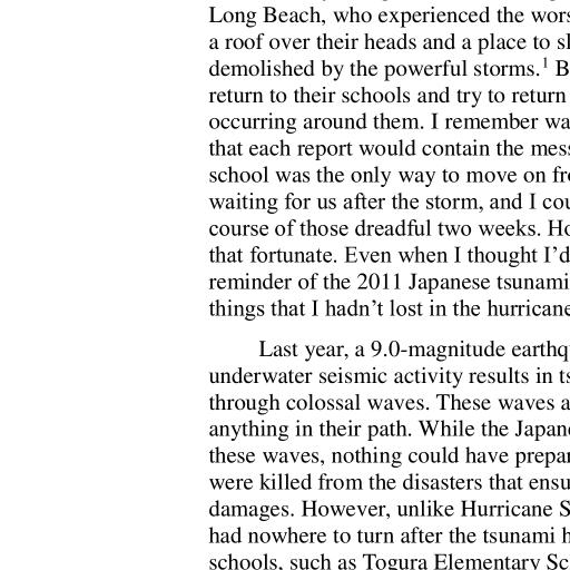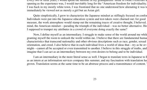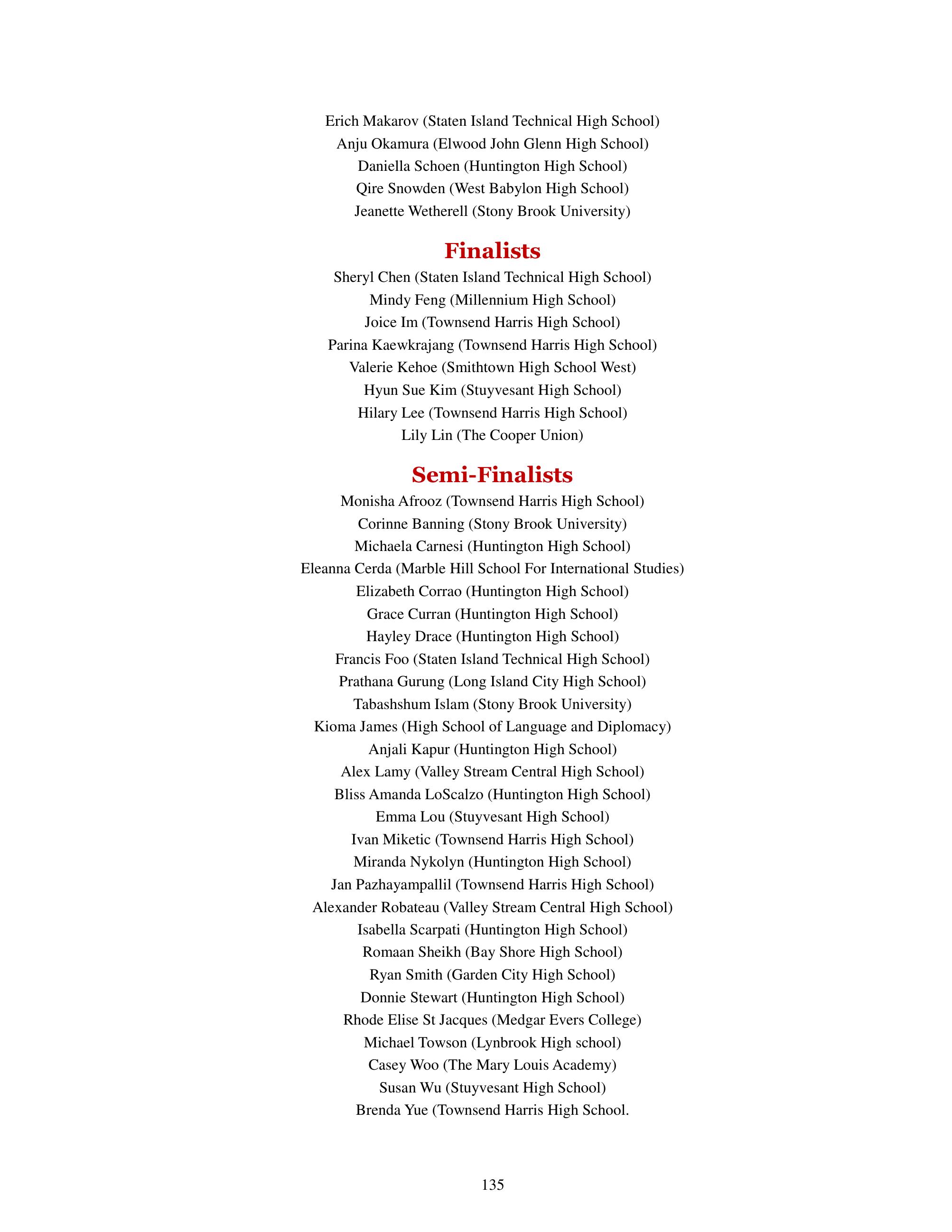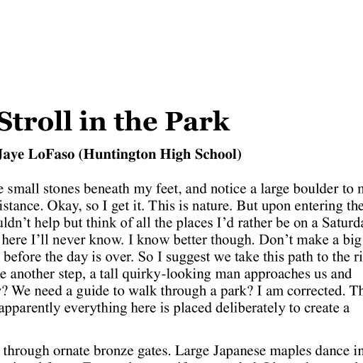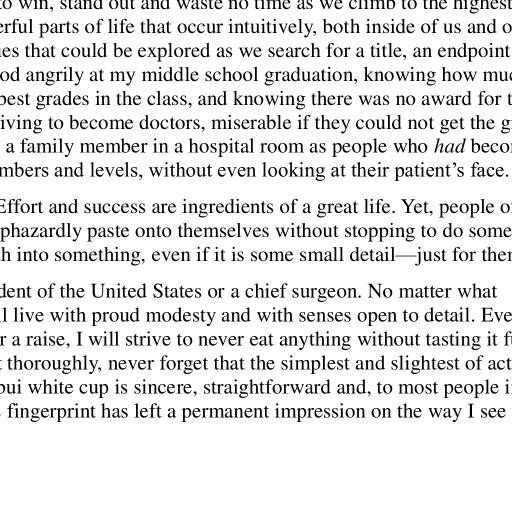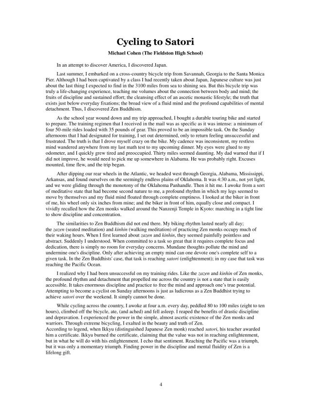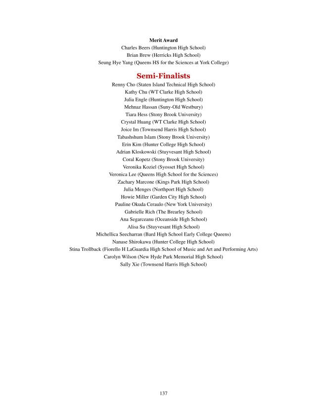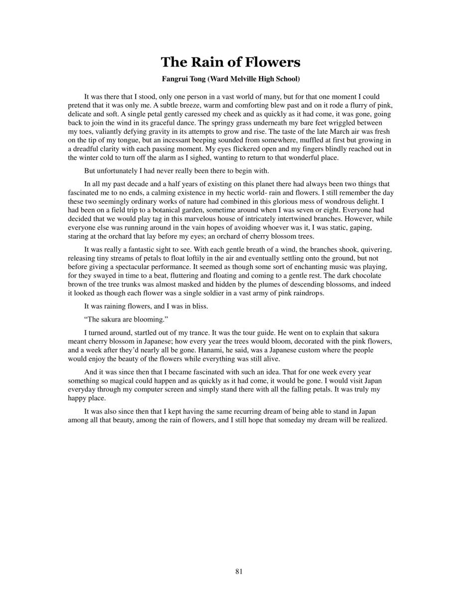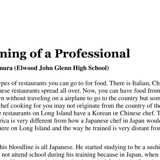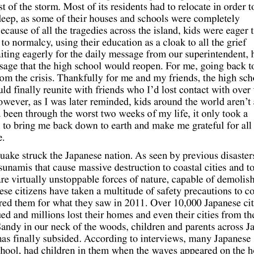 “Track: The Mental Game”Rachel Kitagawa (Syosset High School)“You have to run with your heart, not just for yourself, but for each other. When you feel like giving up, know that everyone else is facing the same pain, and they aren’t giving up.” I hear my coach say.