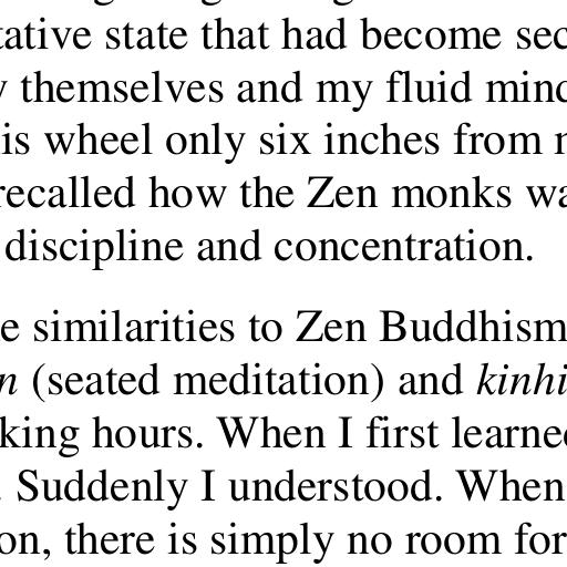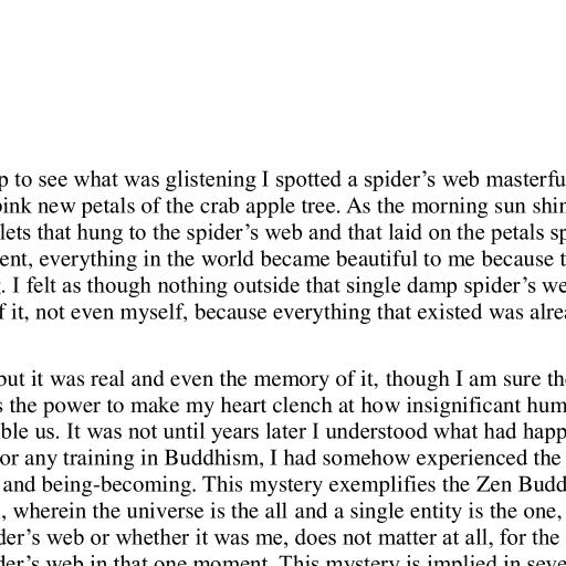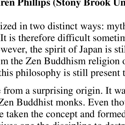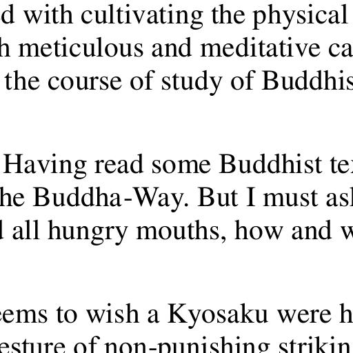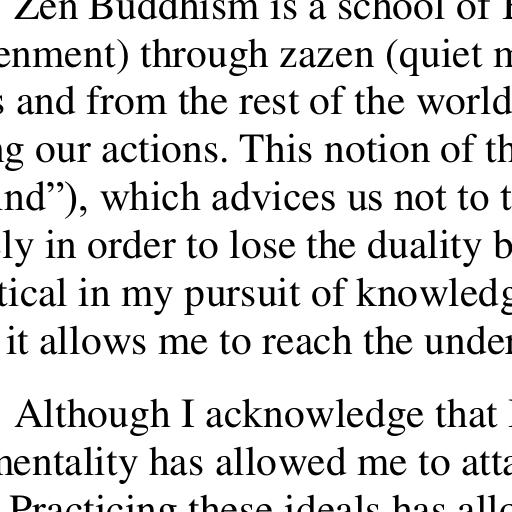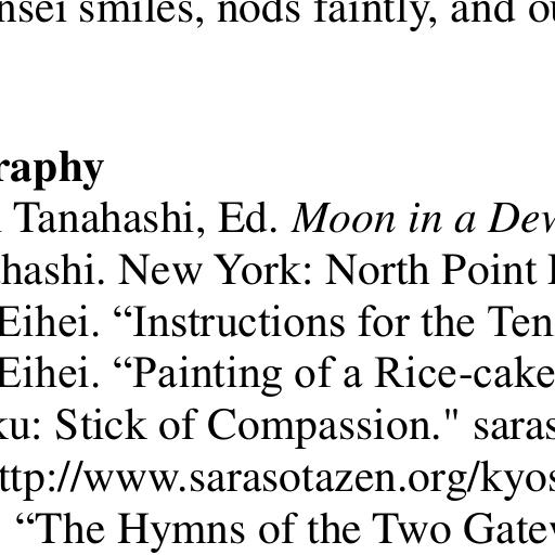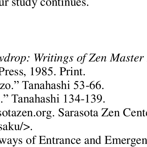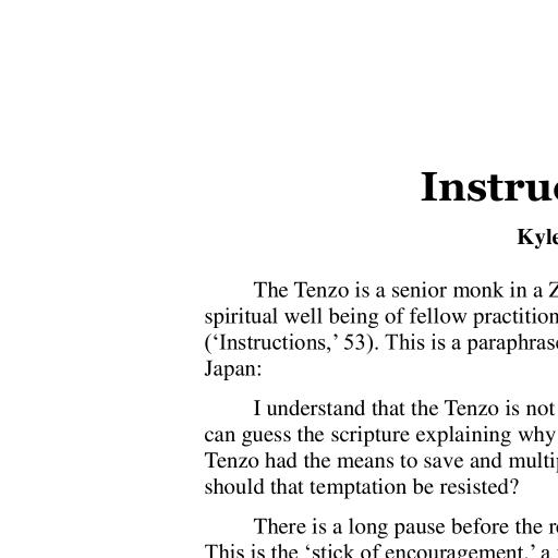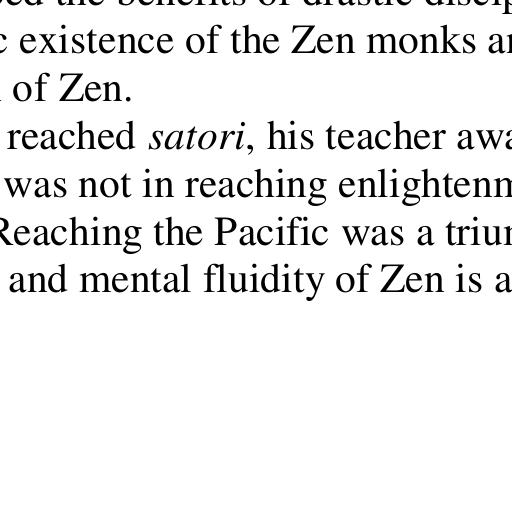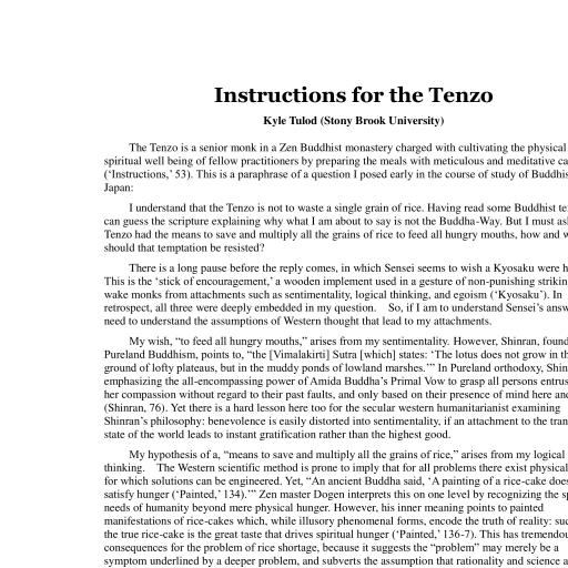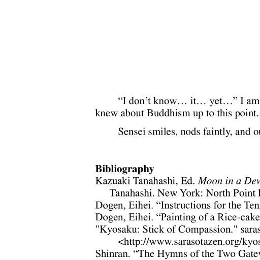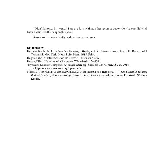 “Wrong.”Mohammed Ali (Stony Brook University)Dogen reached enlightenment when he witnessed his sensei beating another student with a slipper. I started sniggering when Sensei mentioned this, breaking the silence in our class. Everyone glanced at me and then looked back at Sensei, apparently not having the same image as I did of a very serious teacher beating a cowering and repentant student, and Dogen, instead of feeling the gravity of this scene, rushing off to burn incense in his room. I could almost see the lightbulb over his head and hear him exclaiming, “Eureka!” as he rushed off in the culturally confused corridors of my imagination. I bit my lip to control my laughter but another thought sobered me up effectively. For monks to come to Mount Hiei to study under a sensei and voluntarily subject themselves to a relationship where it was possible for them to be physically beaten as a normal course of action to study Buddhism, enlightenment must be serious business indeed. Students sat at the feet and mercy of their masters simply for the possibility of enlightenment.