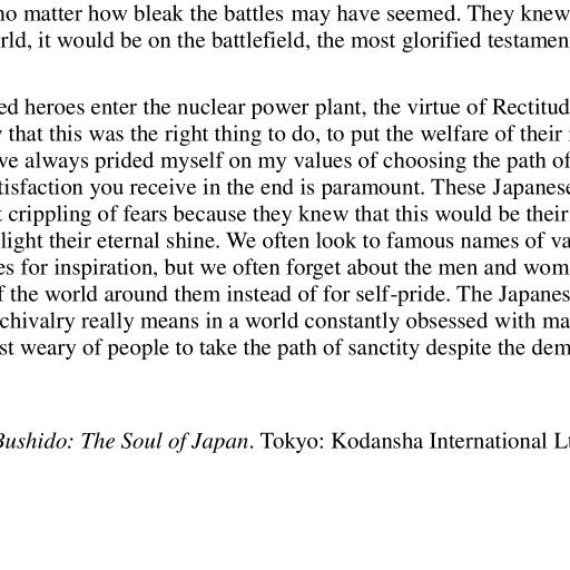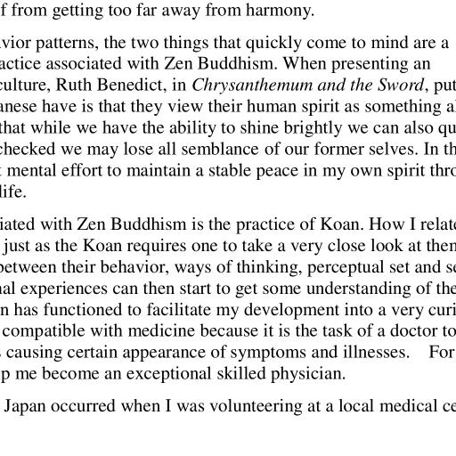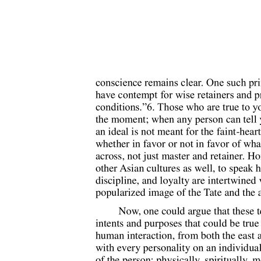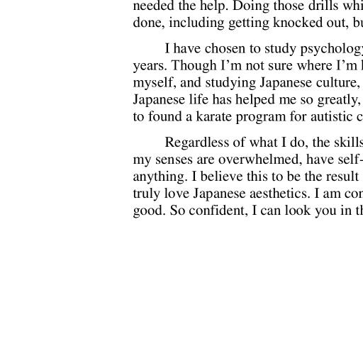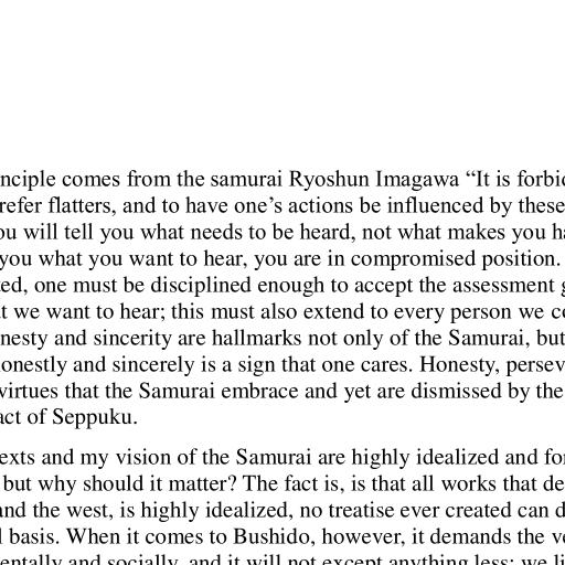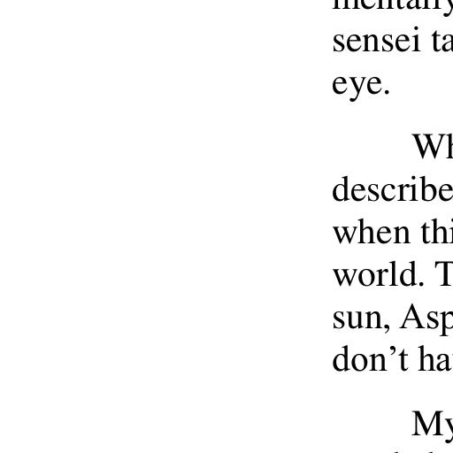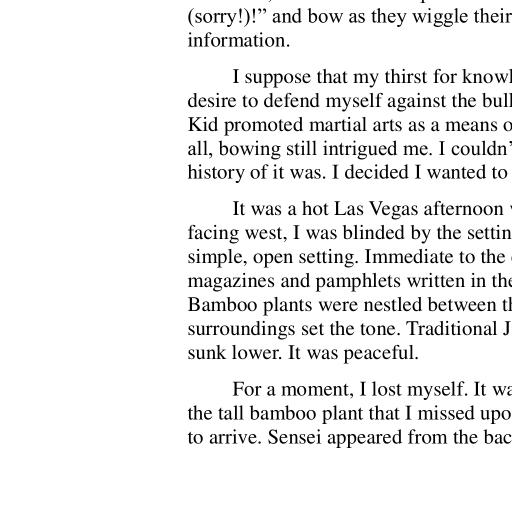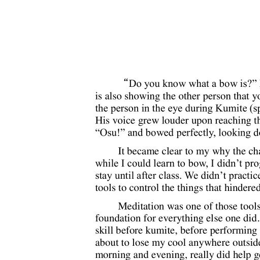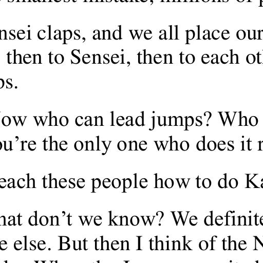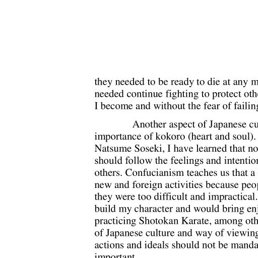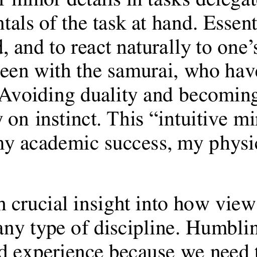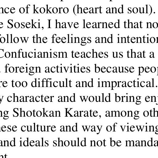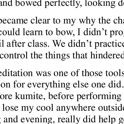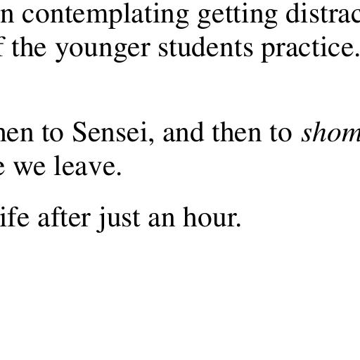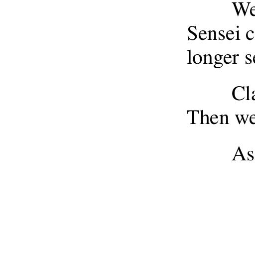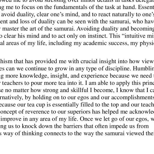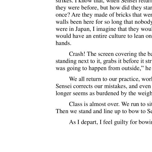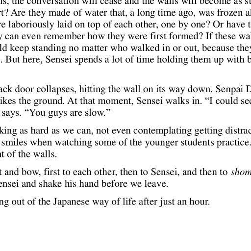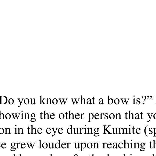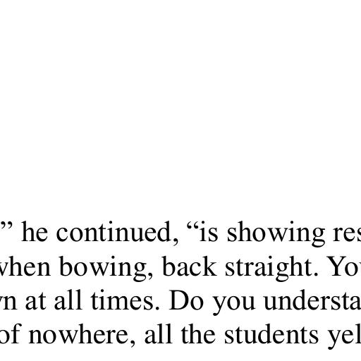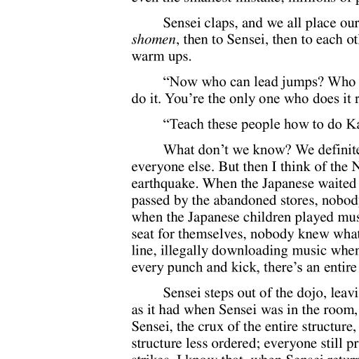 I was positive Sensei had asked us this question not for us to argue our personal opinions, but to hear what they were. It wasn’t that she didn’t desire an explanation, but that she was waiting to see if we comprehended the proper way to understand a question such as this.