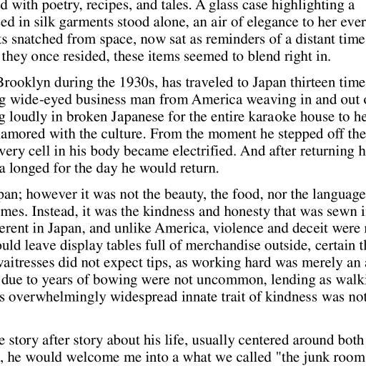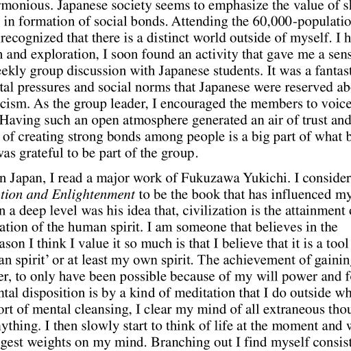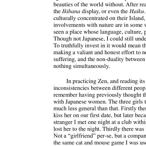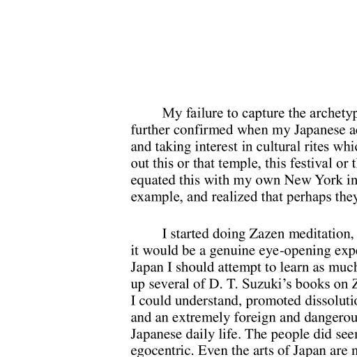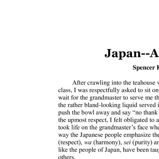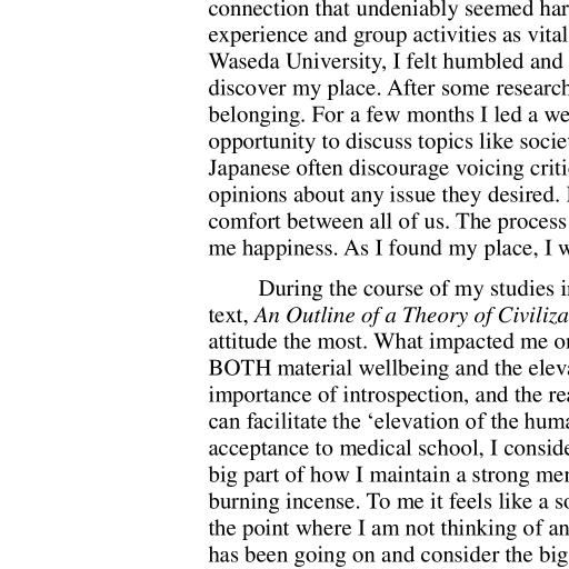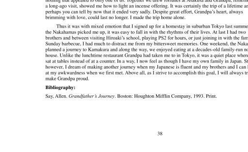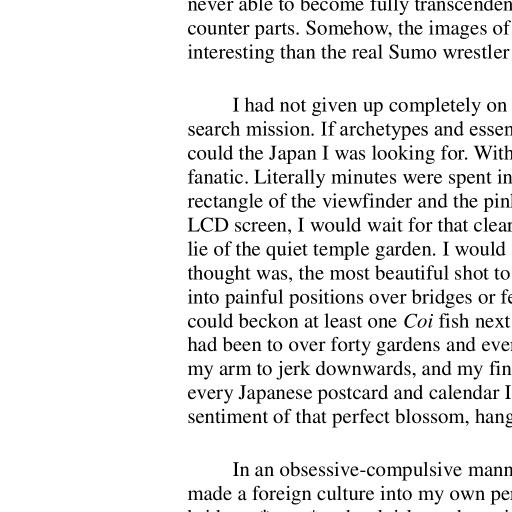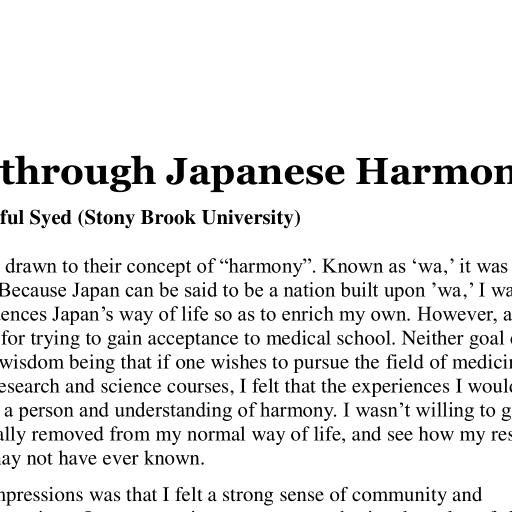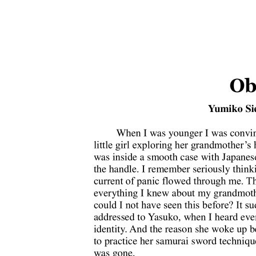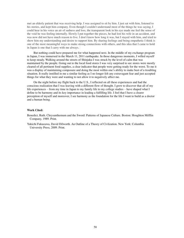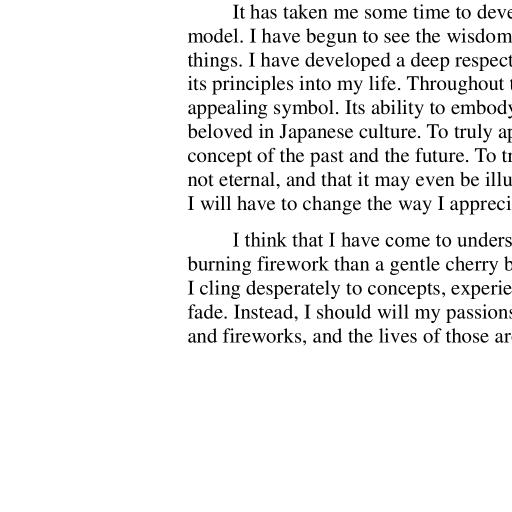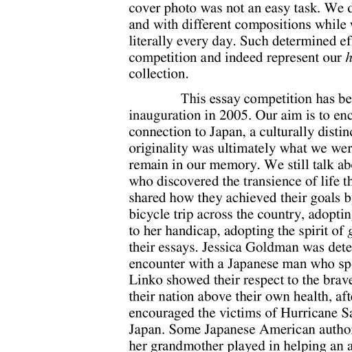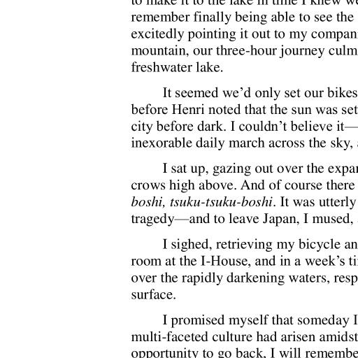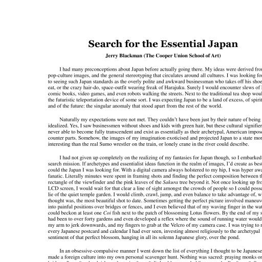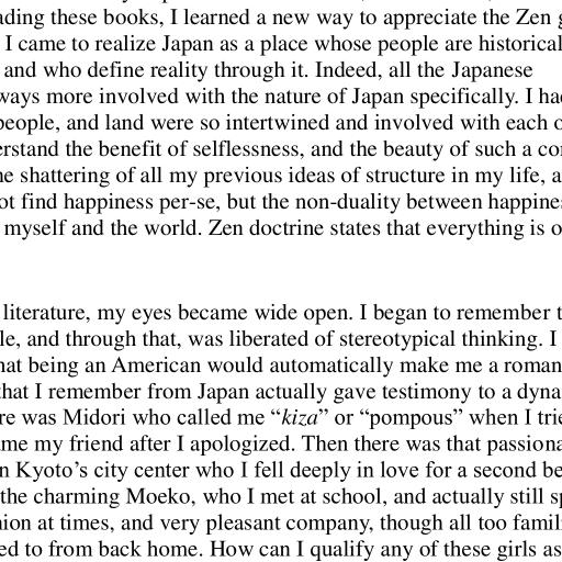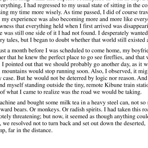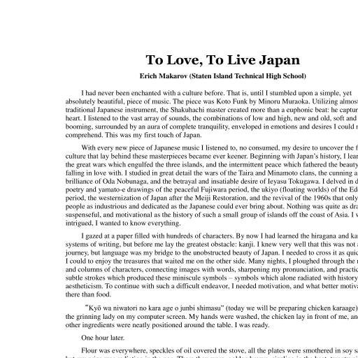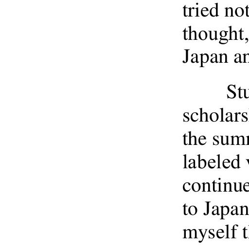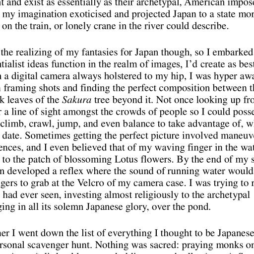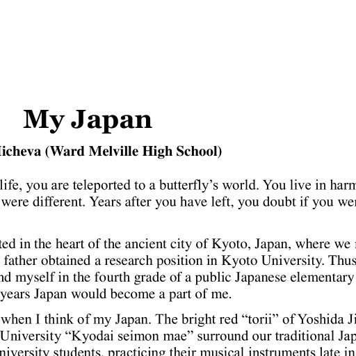 “Reflections on Japan”Hein Aung (Columbia University)“... it was as if he were watching a tableau in a dream — and that was no doubt the working of his strange mirror,” Kawabata Yasunari opens his most famous novel, Snow Country, with his protagonist peeping at a girl nursing — what he assumes to be — her sickly husband. Through his train car window, the protagonist, Shimamura, stares at the girl’s reflection. Despite the perverseness of a description of a man staring at a girl intently, for hours, Shimamura’s musings are not perverted. Offhand, one could take his actions as voyeuristic, but the pleasure he feels is not sexual, but, rather, sublime. The “unexplainable beauty” of the girl’s face superimposed onto the moving mountainous landscape compels his chest to rise. The narrator describes the mirror having “unreal, otherworldly power”. Shimamura seems to rejoice more in the unreal than the real. Hence, he is an expert in the art of Occidental dance, without ever having seen a single performance. Out of a dissatisfaction in the “old tradition,” Shimamura scours pictures, programs, and posters of the art. Oddly enough, Shimamura’s world vaguely resembles my perception of Japan — mirrored, yet inexplicably taking.