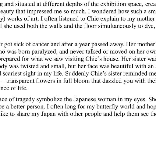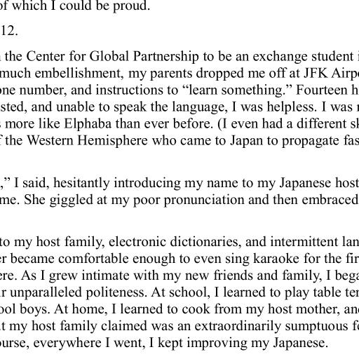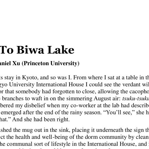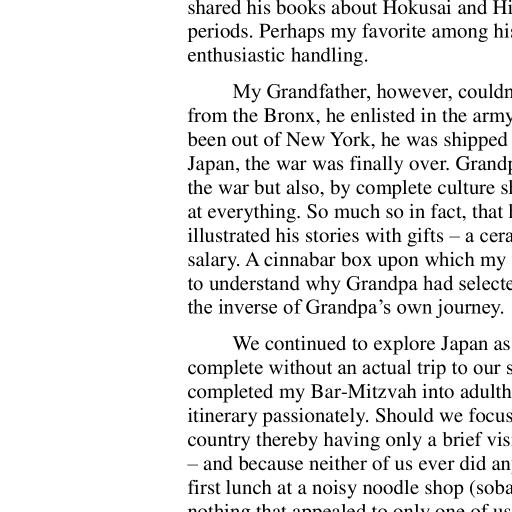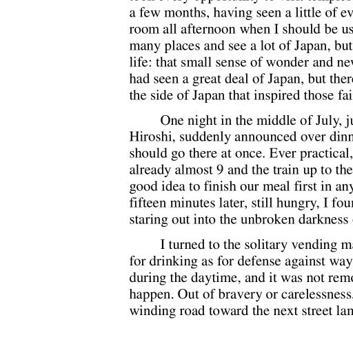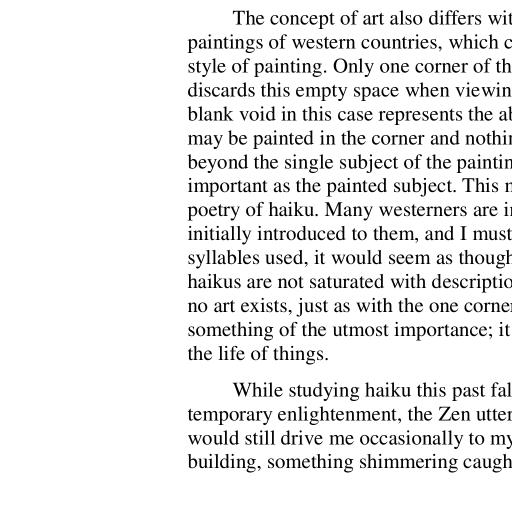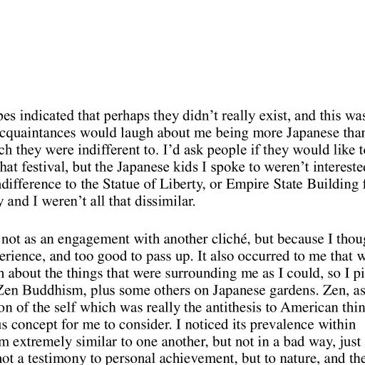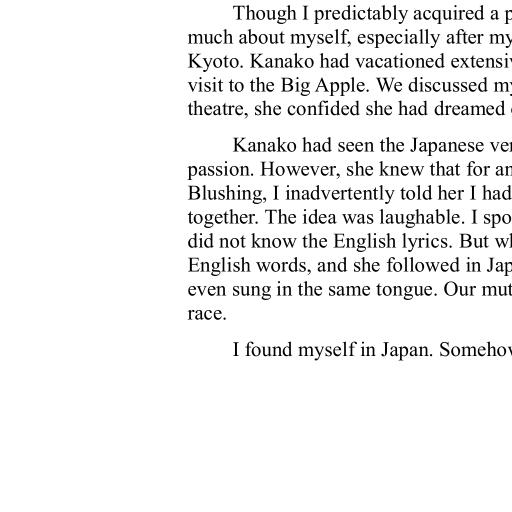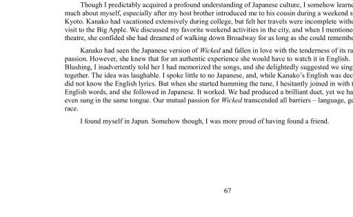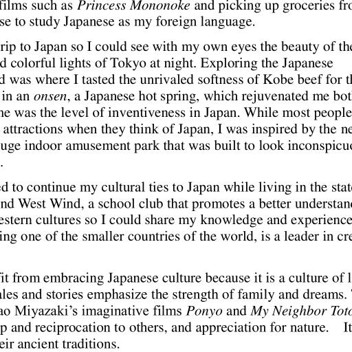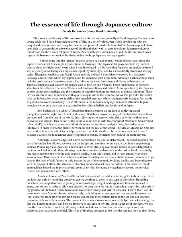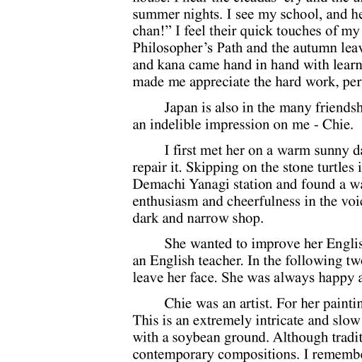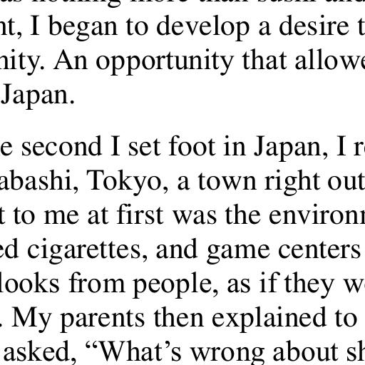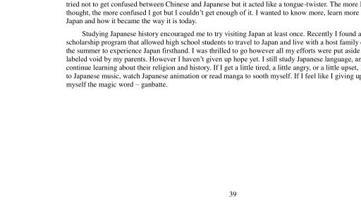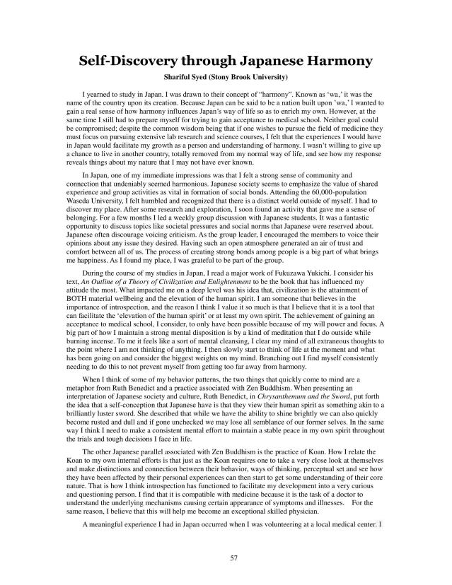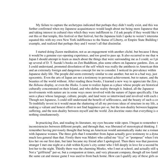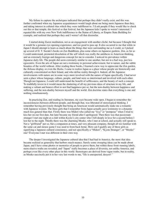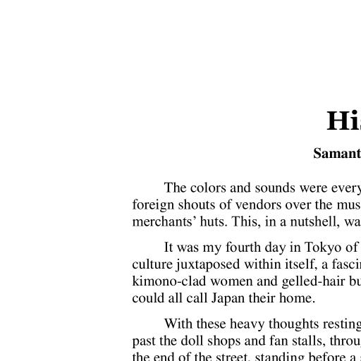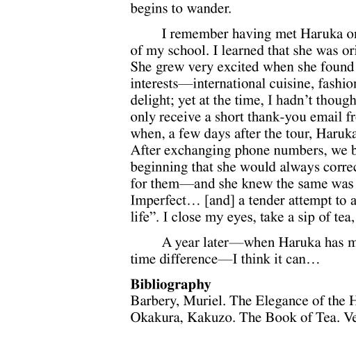 “Reflections on Japan”Hein Aung (Columbia University)“... it was as if he were watching a tableau in a dream — and that was no doubt the working of his strange mirror,” Kawabata Yasunari opens his most famous novel, Snow Country, with his protagonist peeping at a girl nursing — what he assumes to be — her sickly husband. Through his train car window, the protagonist, Shimamura, stares at the girl’s reflection. Despite the perverseness of a description of a man staring at a girl intently, for hours, Shimamura’s musings are not perverted. Offhand, one could take his actions as voyeuristic, but the pleasure he feels is not sexual, but, rather, sublime. The “unexplainable beauty” of the girl’s face superimposed onto the moving mountainous landscape compels his chest to rise. The narrator describes the mirror having “unreal, otherworldly power”. Shimamura seems to rejoice more in the unreal than the real. Hence, he is an expert in the art of Occidental dance, without ever having seen a single performance. Out of a dissatisfaction in the “old tradition,” Shimamura scours pictures, programs, and posters of the art. Oddly enough, Shimamura’s world vaguely resembles my perception of Japan — mirrored, yet inexplicably taking.