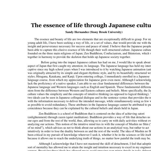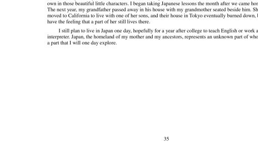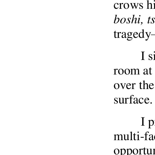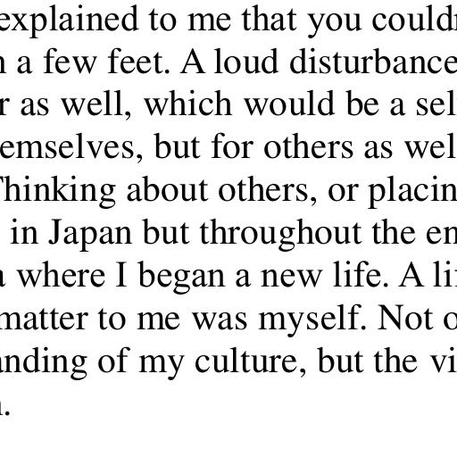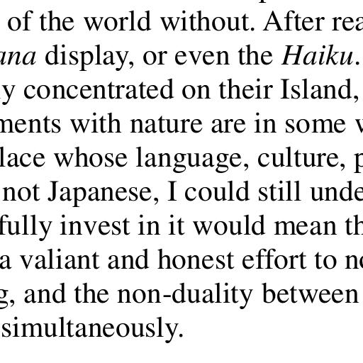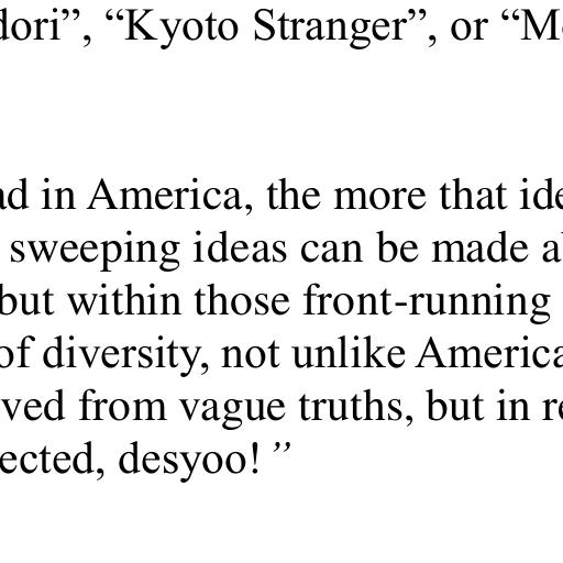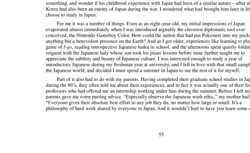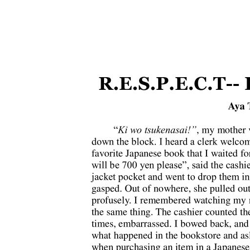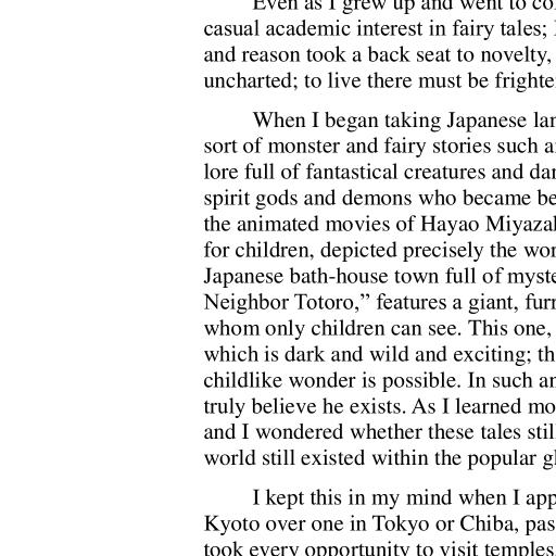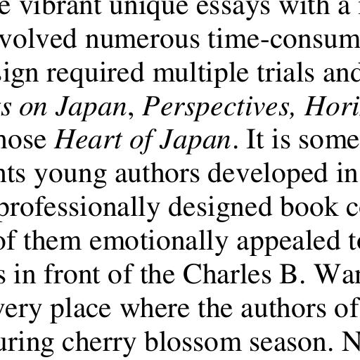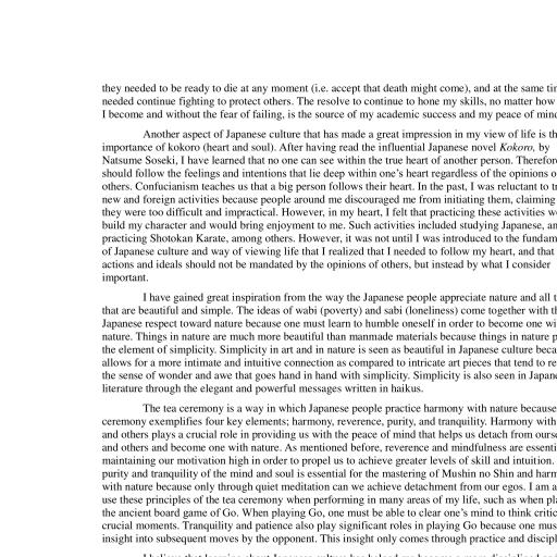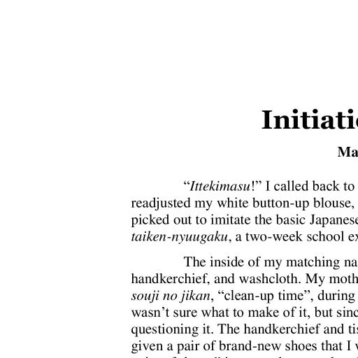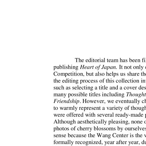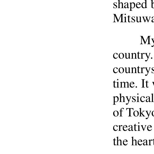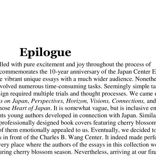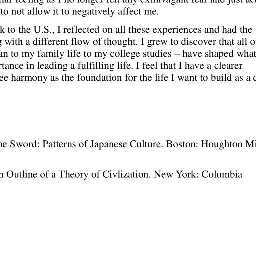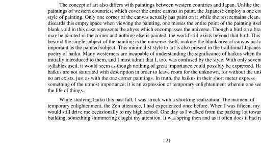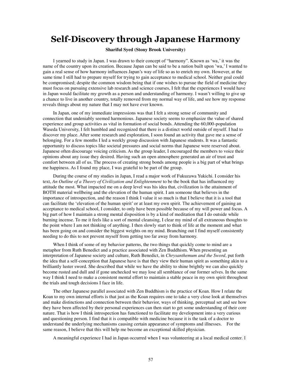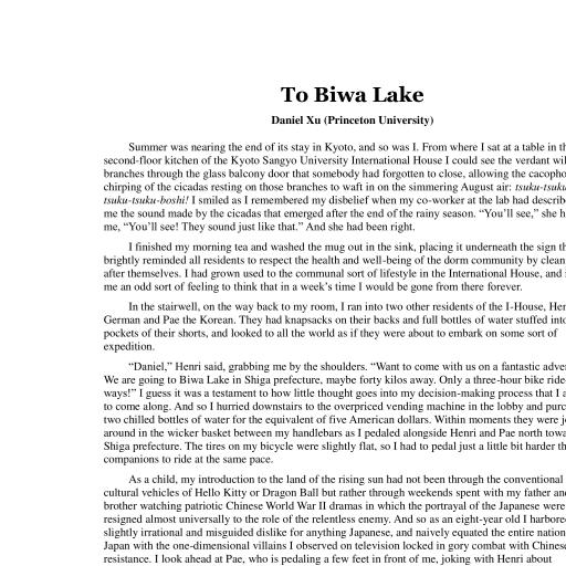 “Reflections on Japan”Hein Aung (Columbia University)“... it was as if he were watching a tableau in a dream — and that was no doubt the working of his strange mirror,” Kawabata Yasunari opens his most famous novel, Snow Country, with his protagonist peeping at a girl nursing — what he assumes to be — her sickly husband. Through his train car window, the protagonist, Shimamura, stares at the girl’s reflection. Despite the perverseness of a description of a man staring at a girl intently, for hours, Shimamura’s musings are not perverted. Offhand, one could take his actions as voyeuristic, but the pleasure he feels is not sexual, but, rather, sublime. The “unexplainable beauty” of the girl’s face superimposed onto the moving mountainous landscape compels his chest to rise. The narrator describes the mirror having “unreal, otherworldly power”. Shimamura seems to rejoice more in the unreal than the real. Hence, he is an expert in the art of Occidental dance, without ever having seen a single performance. Out of a dissatisfaction in the “old tradition,” Shimamura scours pictures, programs, and posters of the art. Oddly enough, Shimamura’s world vaguely resembles my perception of Japan — mirrored, yet inexplicably taking.