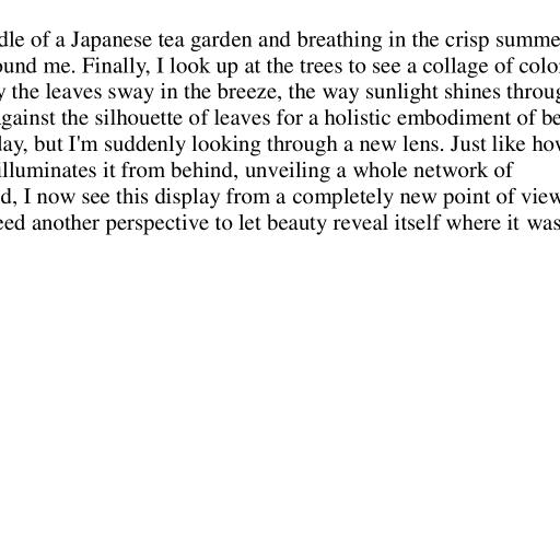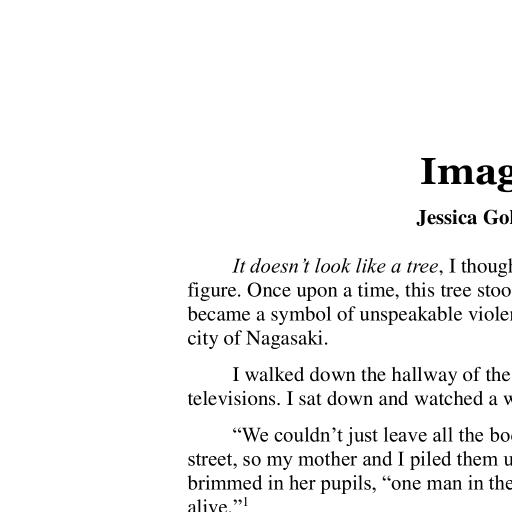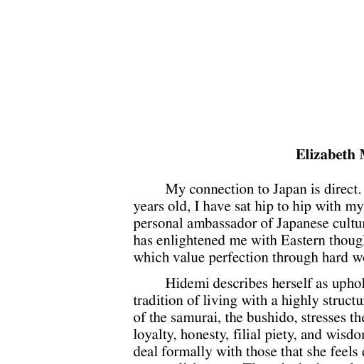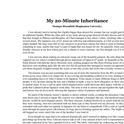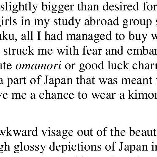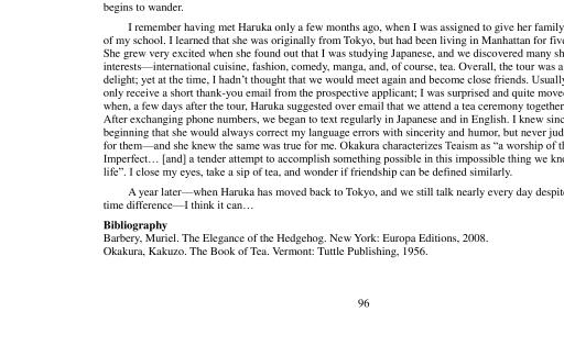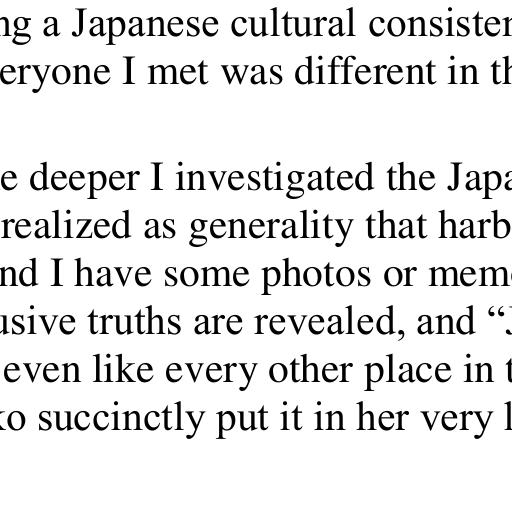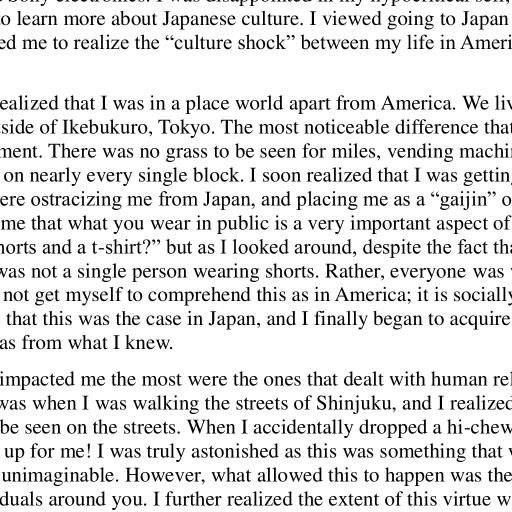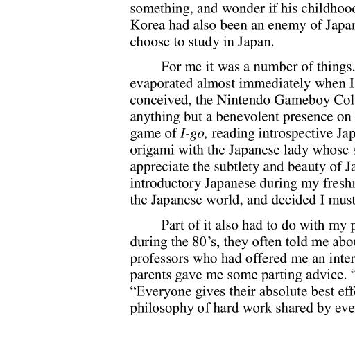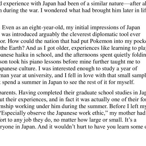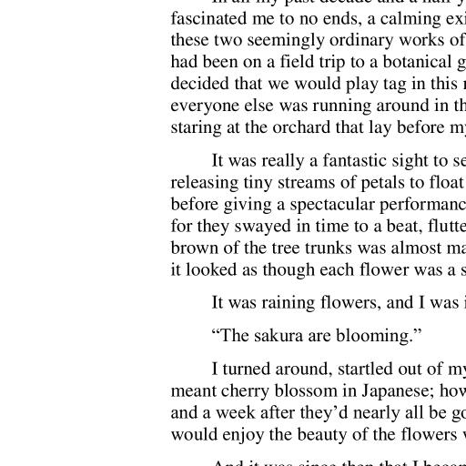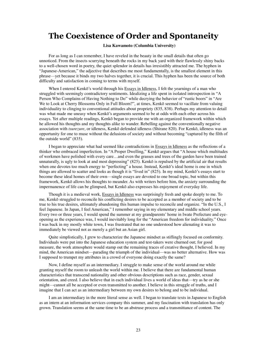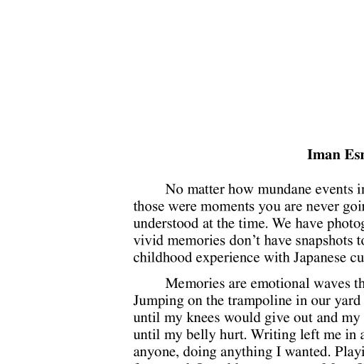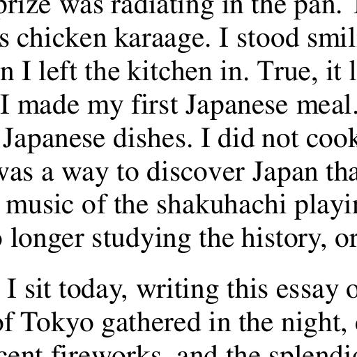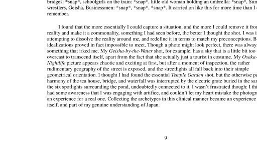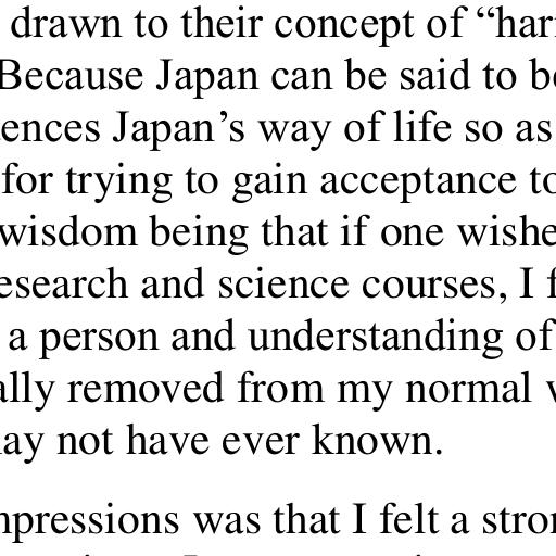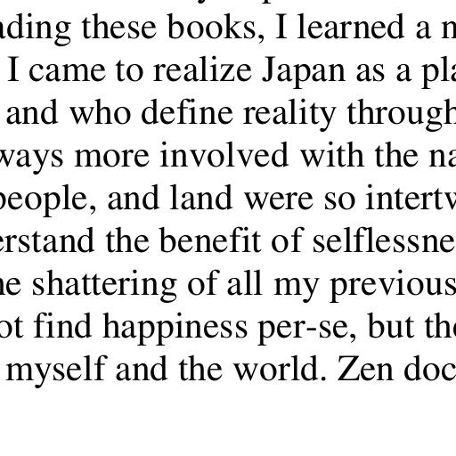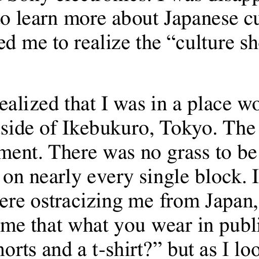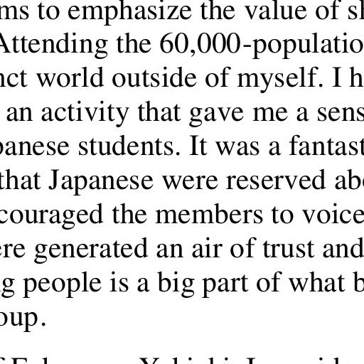 “Reflections on Japan”Hein Aung (Columbia University)“... it was as if he were watching a tableau in a dream — and that was no doubt the working of his strange mirror,” Kawabata Yasunari opens his most famous novel, Snow Country, with his protagonist peeping at a girl nursing — what he assumes to be — her sickly husband. Through his train car window, the protagonist, Shimamura, stares at the girl’s reflection. Despite the perverseness of a description of a man staring at a girl intently, for hours, Shimamura’s musings are not perverted. Offhand, one could take his actions as voyeuristic, but the pleasure he feels is not sexual, but, rather, sublime. The “unexplainable beauty” of the girl’s face superimposed onto the moving mountainous landscape compels his chest to rise. The narrator describes the mirror having “unreal, otherworldly power”. Shimamura seems to rejoice more in the unreal than the real. Hence, he is an expert in the art of Occidental dance, without ever having seen a single performance. Out of a dissatisfaction in the “old tradition,” Shimamura scours pictures, programs, and posters of the art. Oddly enough, Shimamura’s world vaguely resembles my perception of Japan — mirrored, yet inexplicably taking.