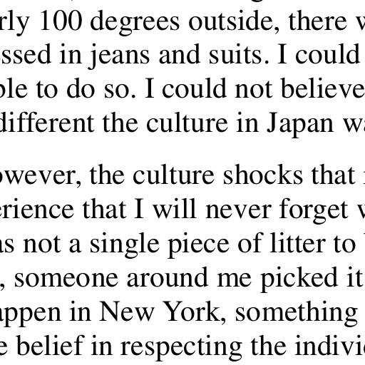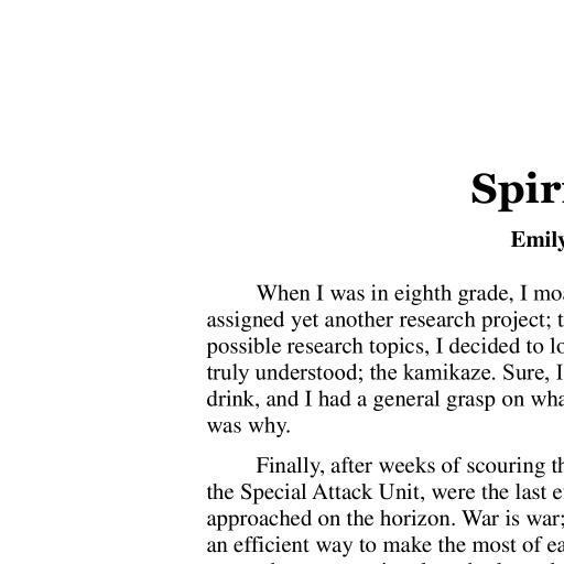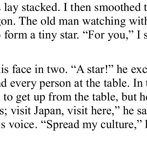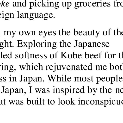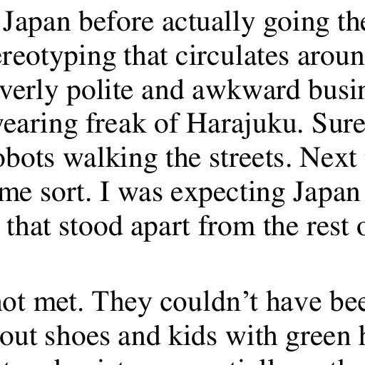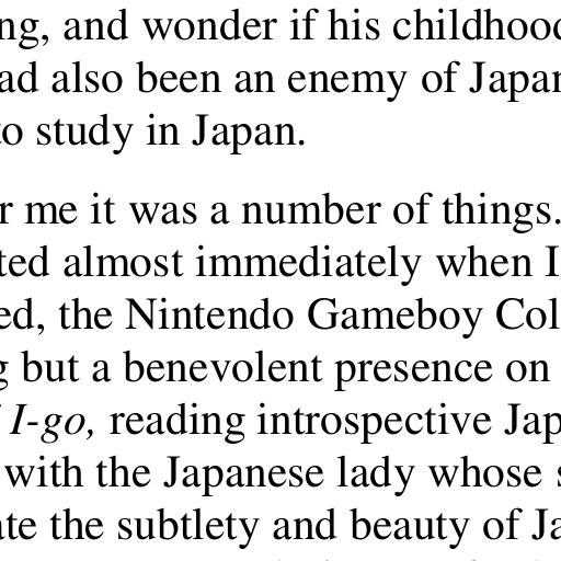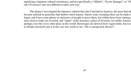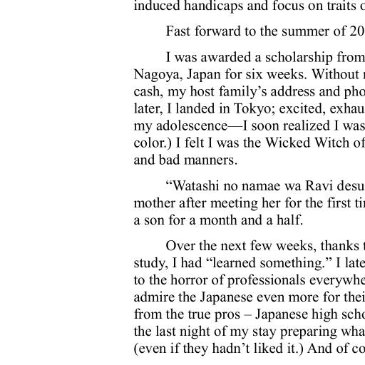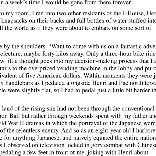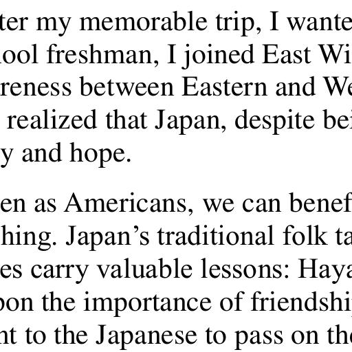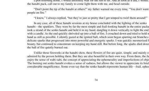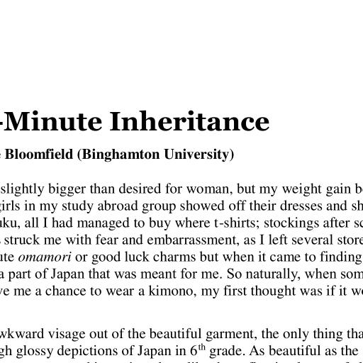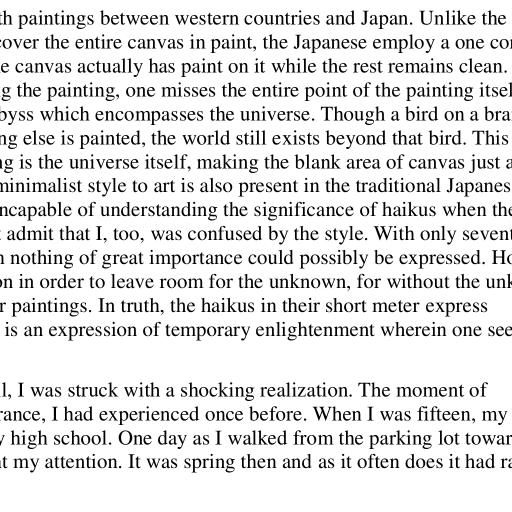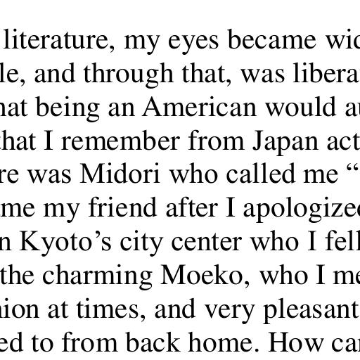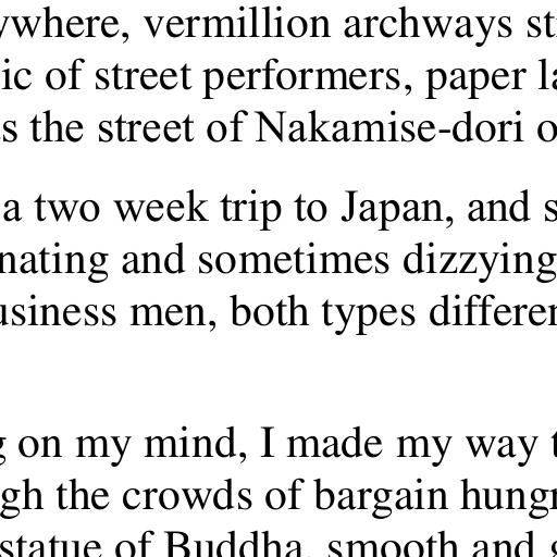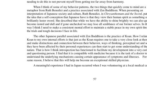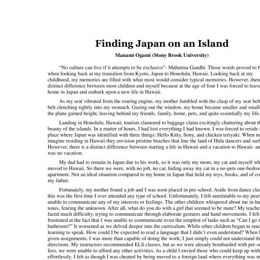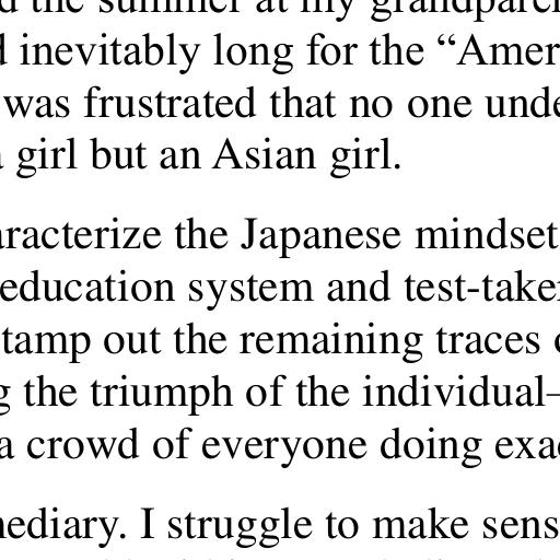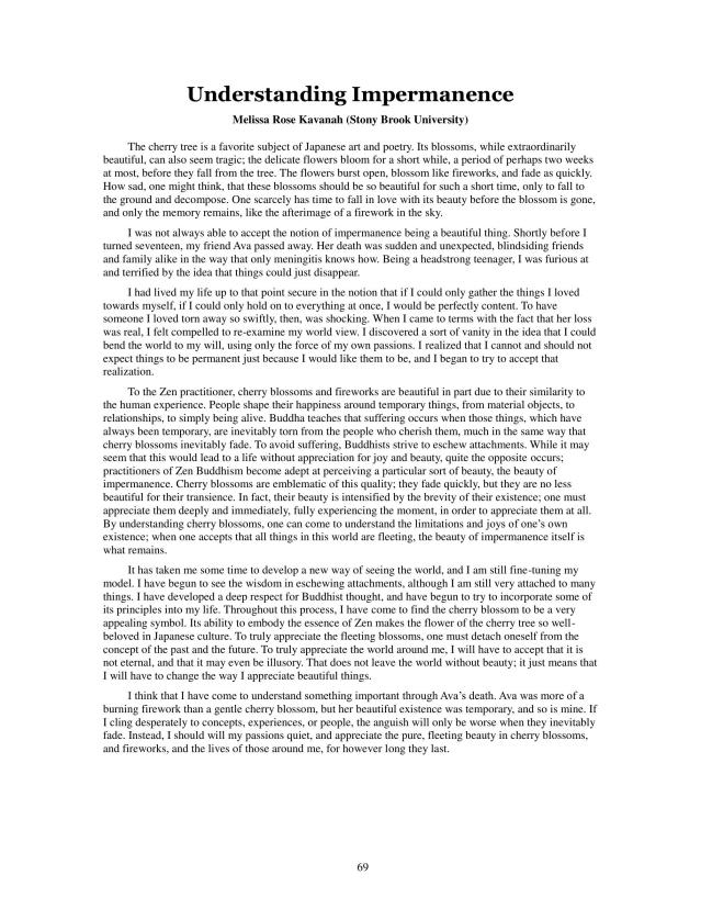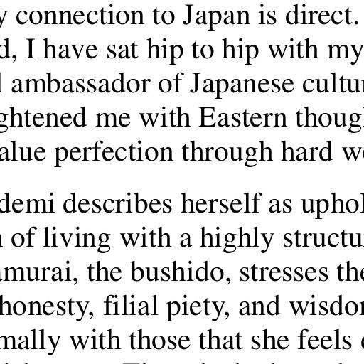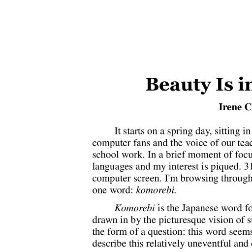 “Reflections on Japan”Hein Aung (Columbia University)“... it was as if he were watching a tableau in a dream — and that was no doubt the working of his strange mirror,” Kawabata Yasunari opens his most famous novel, Snow Country, with his protagonist peeping at a girl nursing — what he assumes to be — her sickly husband. Through his train car window, the protagonist, Shimamura, stares at the girl’s reflection. Despite the perverseness of a description of a man staring at a girl intently, for hours, Shimamura’s musings are not perverted. Offhand, one could take his actions as voyeuristic, but the pleasure he feels is not sexual, but, rather, sublime. The “unexplainable beauty” of the girl’s face superimposed onto the moving mountainous landscape compels his chest to rise. The narrator describes the mirror having “unreal, otherworldly power”. Shimamura seems to rejoice more in the unreal than the real. Hence, he is an expert in the art of Occidental dance, without ever having seen a single performance. Out of a dissatisfaction in the “old tradition,” Shimamura scours pictures, programs, and posters of the art. Oddly enough, Shimamura’s world vaguely resembles my perception of Japan — mirrored, yet inexplicably taking.