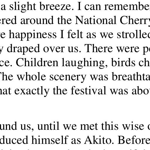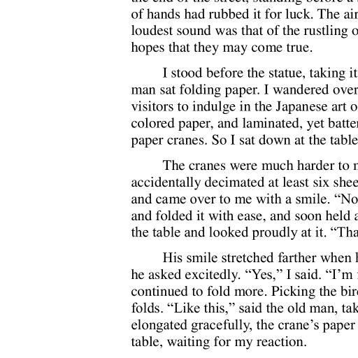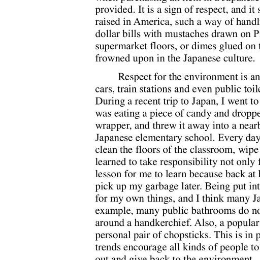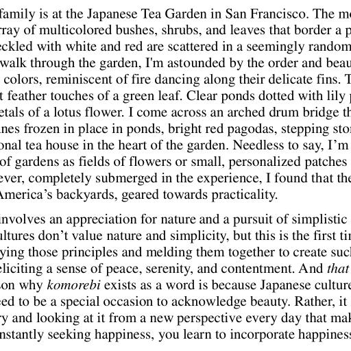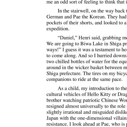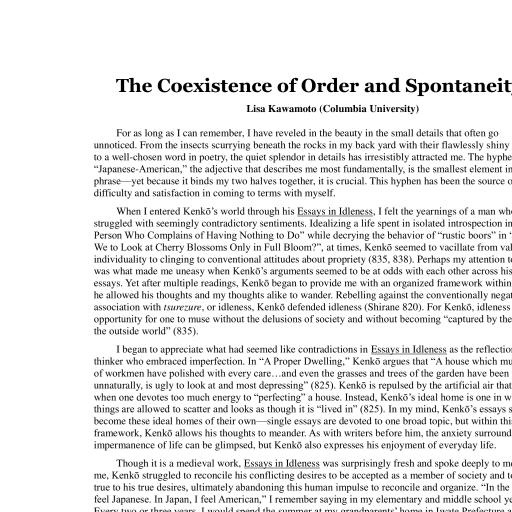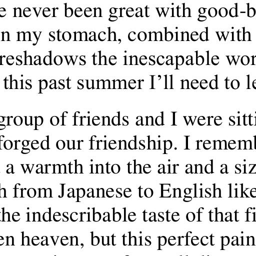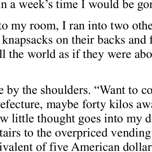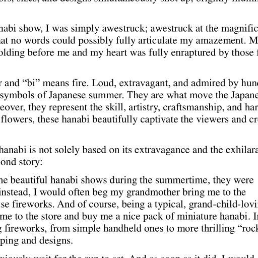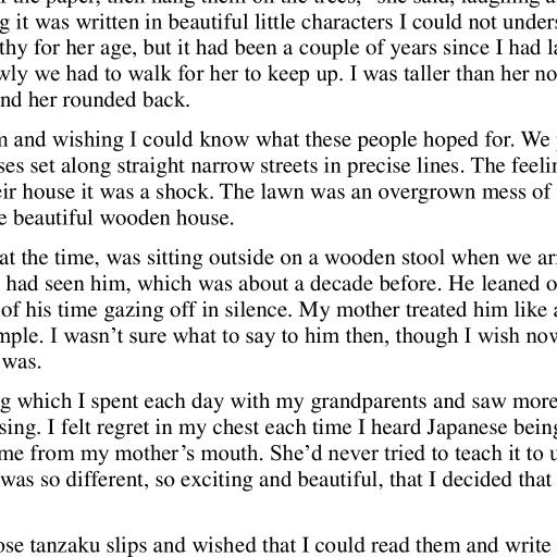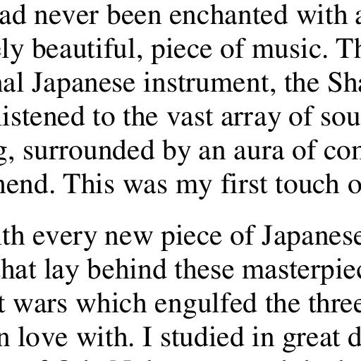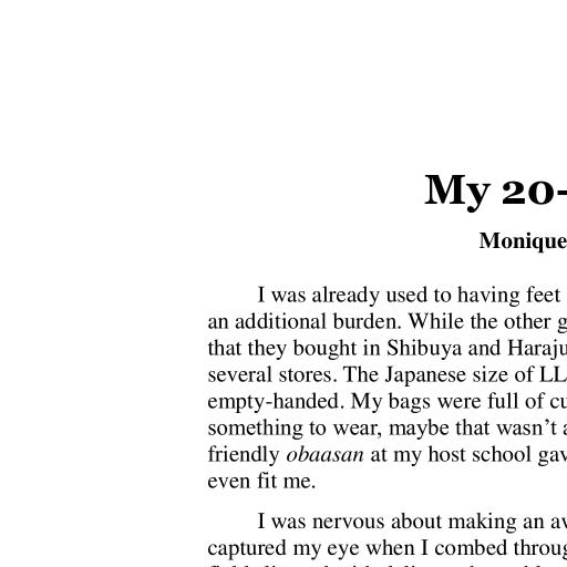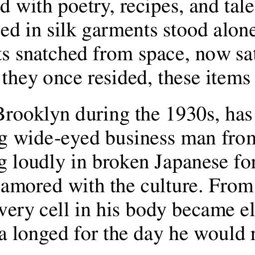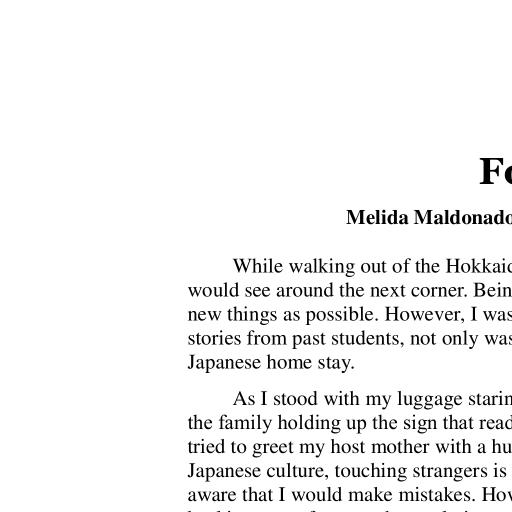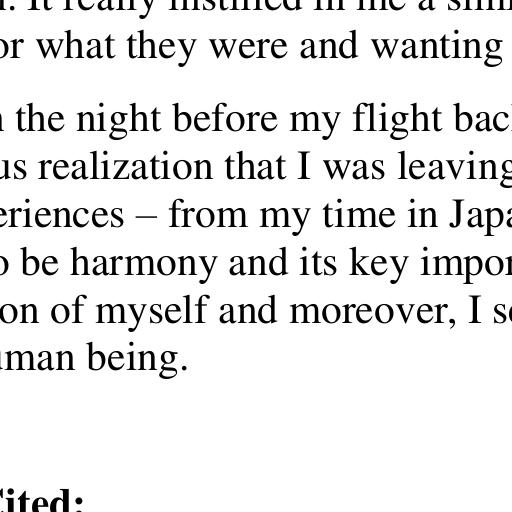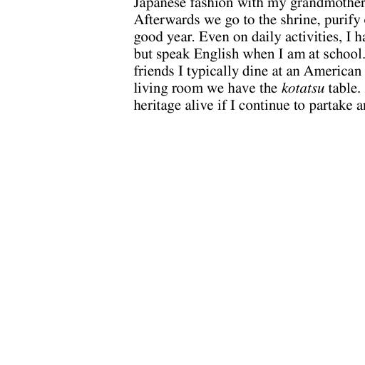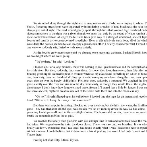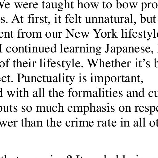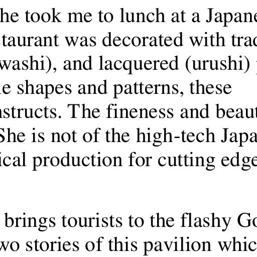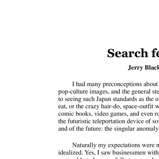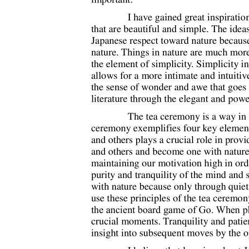 “Reflections on Japan”Hein Aung (Columbia University)“... it was as if he were watching a tableau in a dream — and that was no doubt the working of his strange mirror,” Kawabata Yasunari opens his most famous novel, Snow Country, with his protagonist peeping at a girl nursing — what he assumes to be — her sickly husband. Through his train car window, the protagonist, Shimamura, stares at the girl’s reflection. Despite the perverseness of a description of a man staring at a girl intently, for hours, Shimamura’s musings are not perverted. Offhand, one could take his actions as voyeuristic, but the pleasure he feels is not sexual, but, rather, sublime. The “unexplainable beauty” of the girl’s face superimposed onto the moving mountainous landscape compels his chest to rise. The narrator describes the mirror having “unreal, otherworldly power”. Shimamura seems to rejoice more in the unreal than the real. Hence, he is an expert in the art of Occidental dance, without ever having seen a single performance. Out of a dissatisfaction in the “old tradition,” Shimamura scours pictures, programs, and posters of the art. Oddly enough, Shimamura’s world vaguely resembles my perception of Japan — mirrored, yet inexplicably taking.