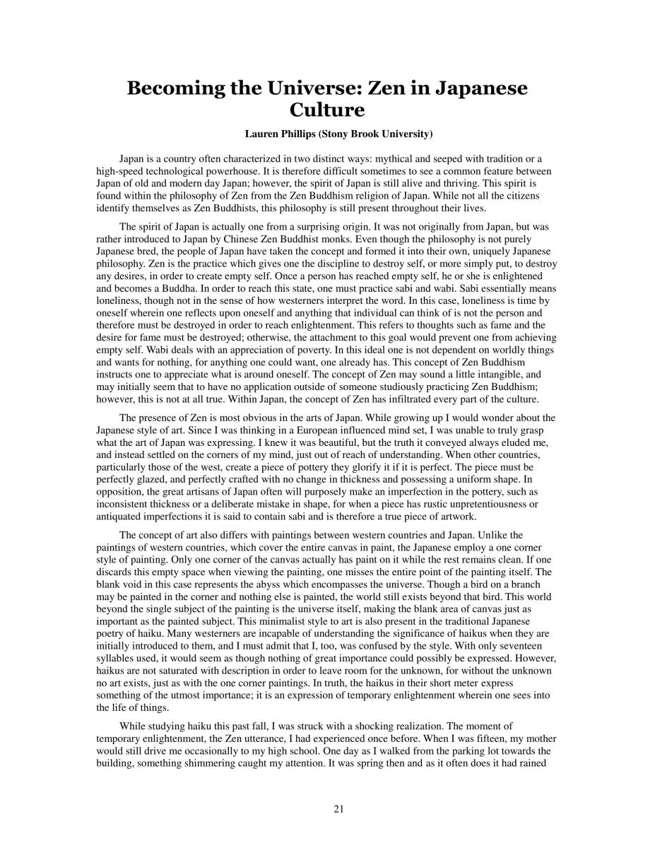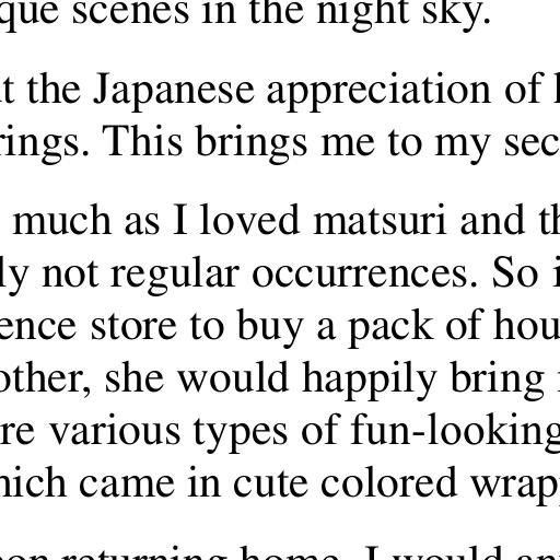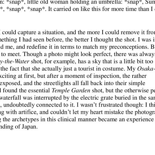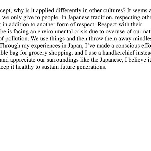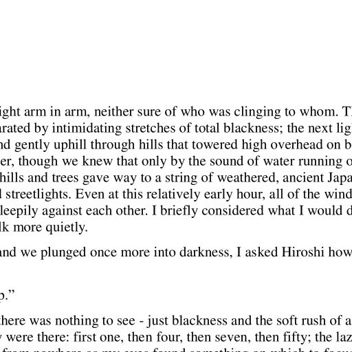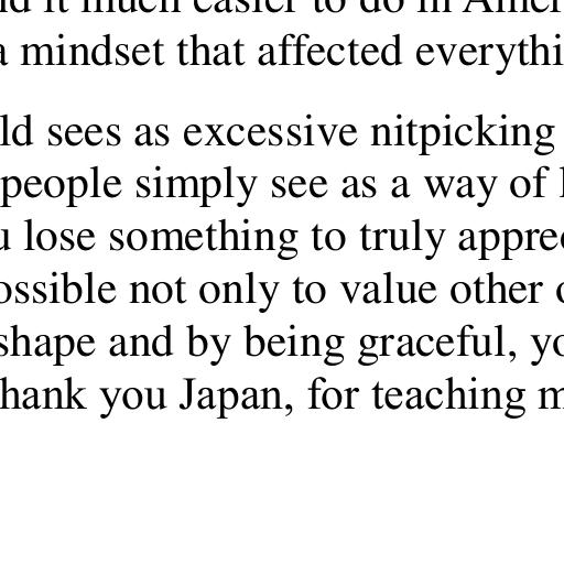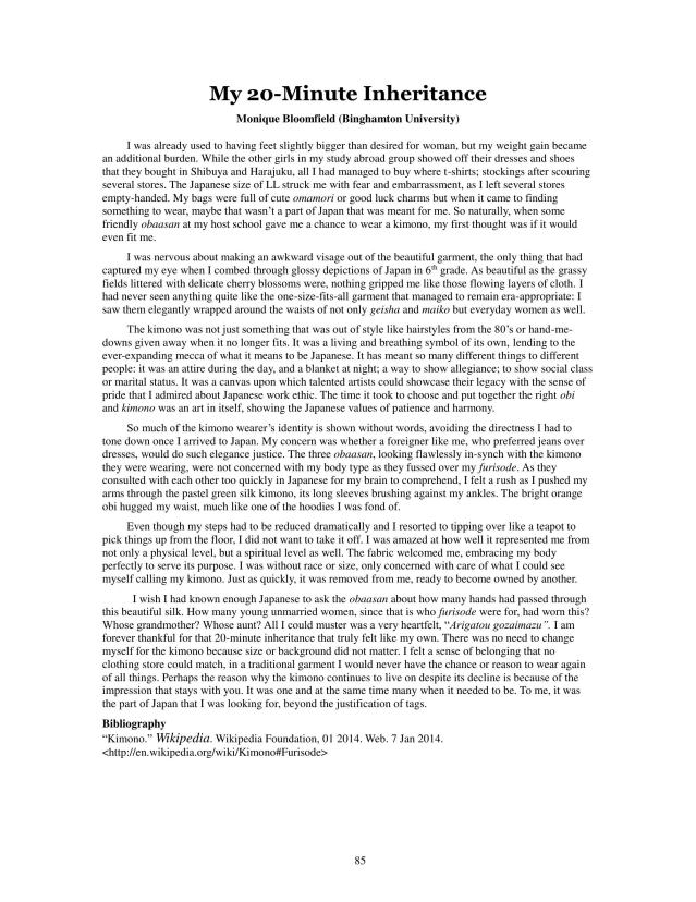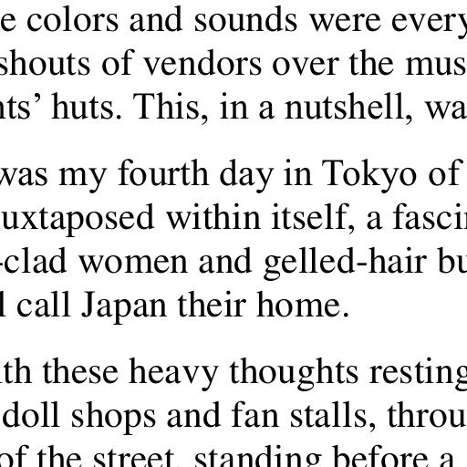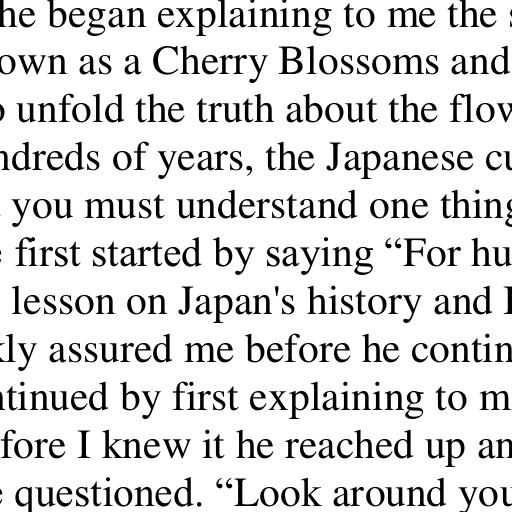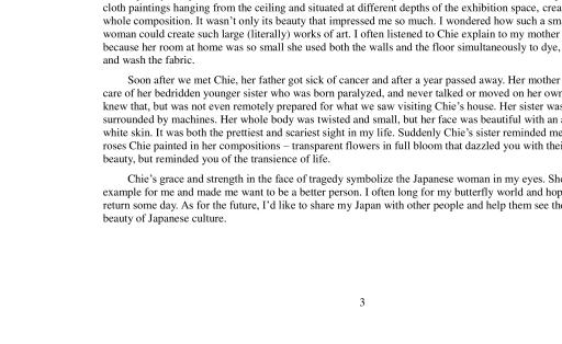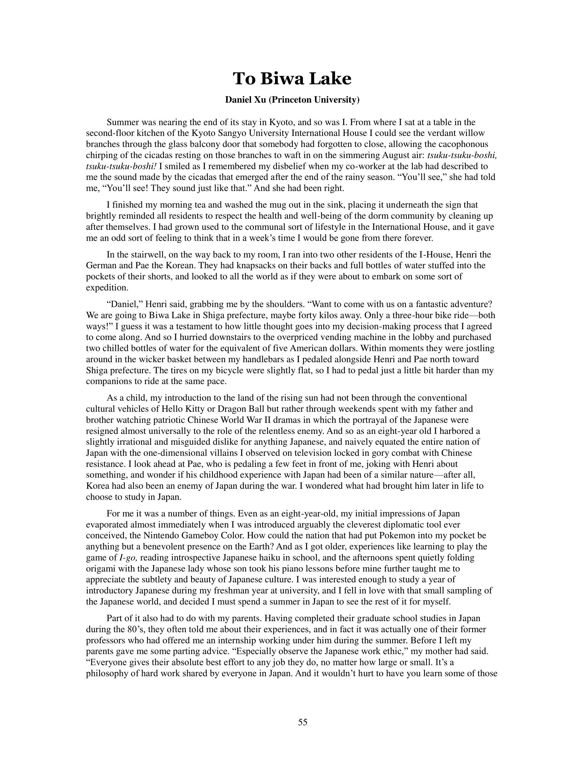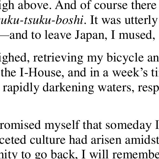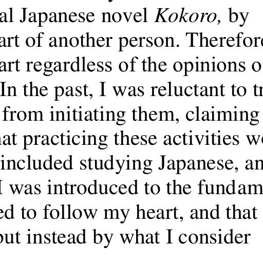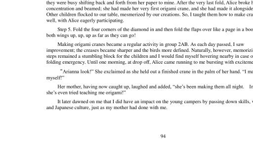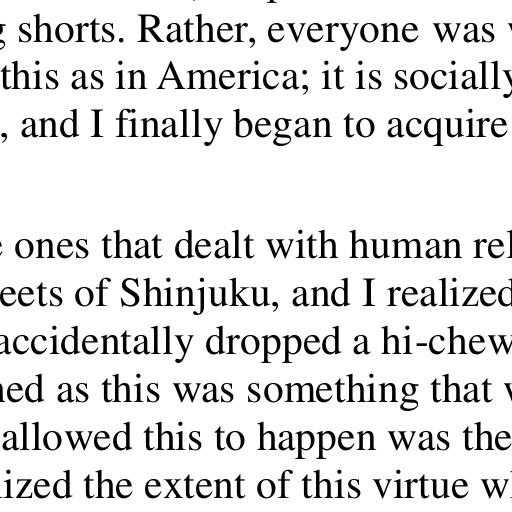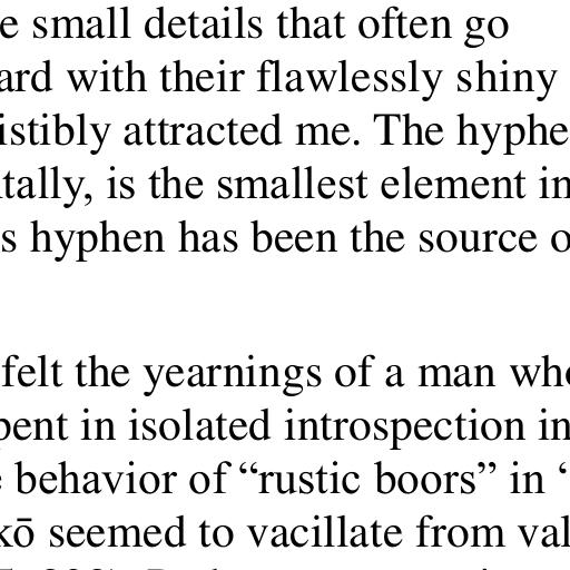 “Reflections on Japan”Hein Aung (Columbia University)“... it was as if he were watching a tableau in a dream — and that was no doubt the working of his strange mirror,” Kawabata Yasunari opens his most famous novel, Snow Country, with his protagonist peeping at a girl nursing — what he assumes to be — her sickly husband. Through his train car window, the protagonist, Shimamura, stares at the girl’s reflection. Despite the perverseness of a description of a man staring at a girl intently, for hours, Shimamura’s musings are not perverted. Offhand, one could take his actions as voyeuristic, but the pleasure he feels is not sexual, but, rather, sublime. The “unexplainable beauty” of the girl’s face superimposed onto the moving mountainous landscape compels his chest to rise. The narrator describes the mirror having “unreal, otherworldly power”. Shimamura seems to rejoice more in the unreal than the real. Hence, he is an expert in the art of Occidental dance, without ever having seen a single performance. Out of a dissatisfaction in the “old tradition,” Shimamura scours pictures, programs, and posters of the art. Oddly enough, Shimamura’s world vaguely resembles my perception of Japan — mirrored, yet inexplicably taking.