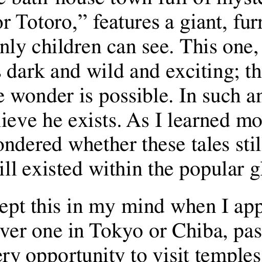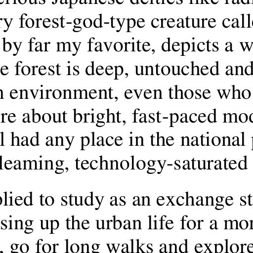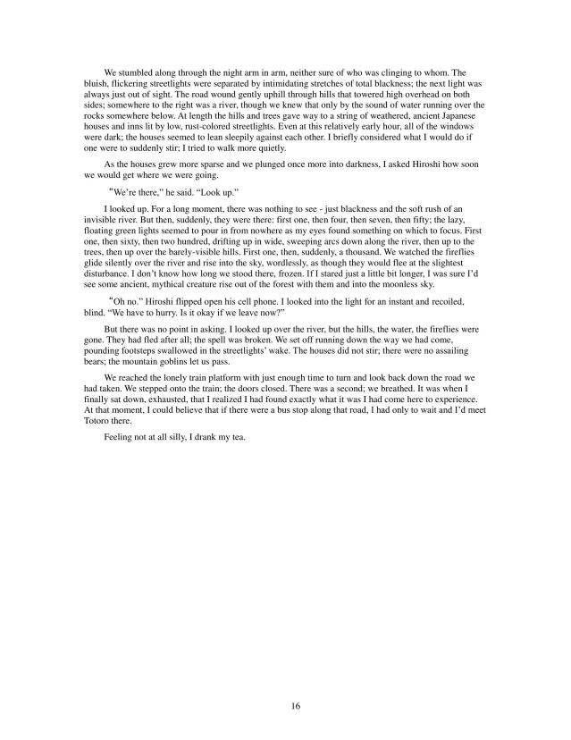 The artstyle was also beautiful. Everything seemed to move and act alive, even in the background. Trees swaying, cherry blossoms falling, the last rays of sunlight illuminating a building. Watching My Neighbor Totoro, I literally imagined Mr. Miyazaki grabbing me by the shoulders, shaking me gently and yelling, “Nature is wonderful! Nature should be protected!” I developed a love for Shintoism thanks to his awesome movies and my wild imagination.