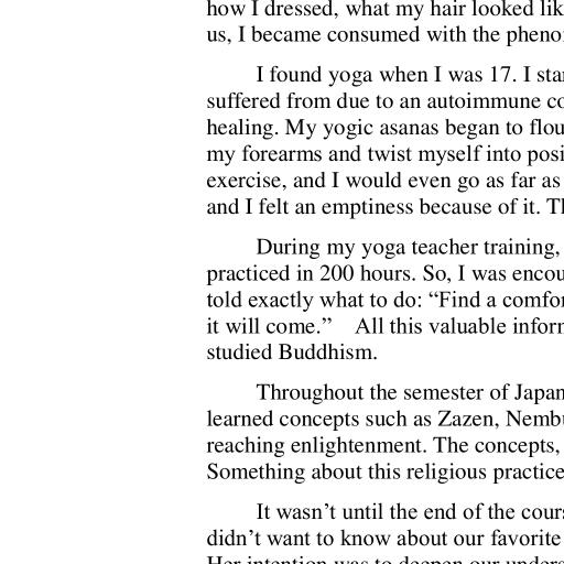 Arriving at Tin Can Alley, my legs begin to burn and my breathing becomes heavy. The extra loop of the 5k trail was drawing near and I start to push the pace as I saw myself fly past some of my competitors. I needed to stay focused and concentrate on my race. I kept my head up looking ahead at the next girl to pass. This was all part of “Supokon.” I learned that sports were another game to challenge my mind and mental state. The IQ of running is to be patient in the beginning, and then later on in the race go after it. “Everyone else in the race is your biggest motivator and everyone else in front of you is another competitor you must overcome.” I hear my coach say in my head. When it gets hard, I remember an activity we did to help our mental game, visualization. Fifteen minutes of my eyes closed, grass tickling my back, and the radio clip of a man from the Running School go through the motions from the thrill at the start till the very second you cross the finish line and fall to the ground is what helped my spirituality.