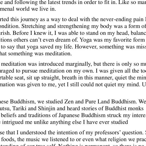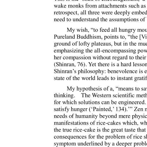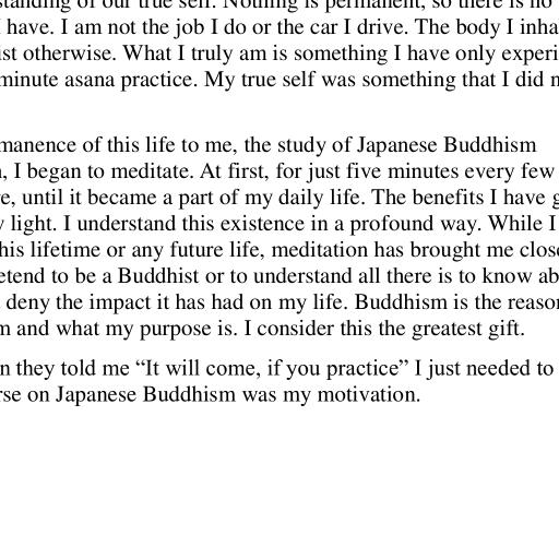 That it was a Japanese and Buddhist answer to the universal question: “What does it mean to be human?” was partly the point. People were too involved in their selfish egos to answer such a universal question. A culture that was rooted in urging people to transcend the ego, such as the tariki (other power) practices of Pure Land Buddhism, was the only way to gain the universal compassion to be able to understand and answer such an important question. Sensei stressed that understanding the concept of Jinen Honi in Pure Land was of chief importance. A seemingly circular concept, Jinen Honi stresses that Amida’s compassion, which allows you to get shinjin or true entrusting in Her, proceeds naturally to the person without them calculating to get it. Having shinjin allows you to truly invoke Amida Buddha (or perform nembutsu) and when you do, you become Amida Buddha, able to have true, universal compassion, unfettered by egoic attachments. But in order to be uncalculating, you must truly believe in your evilness, until you feel your helplessness enough to have complete trust in none but Amida Buddha. It cannot be a ploy directed to get shinjin.