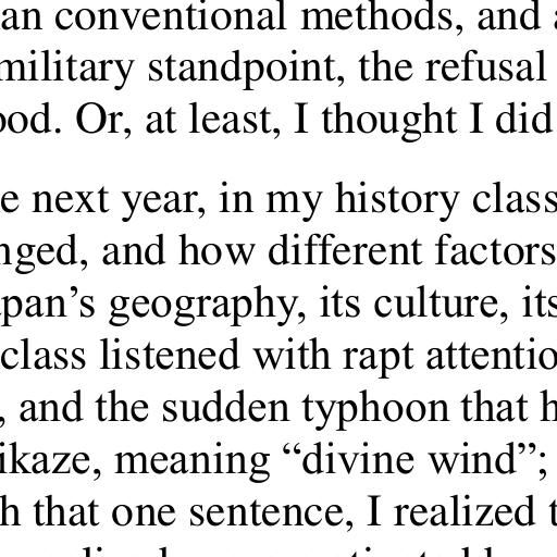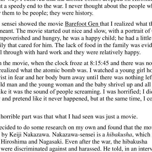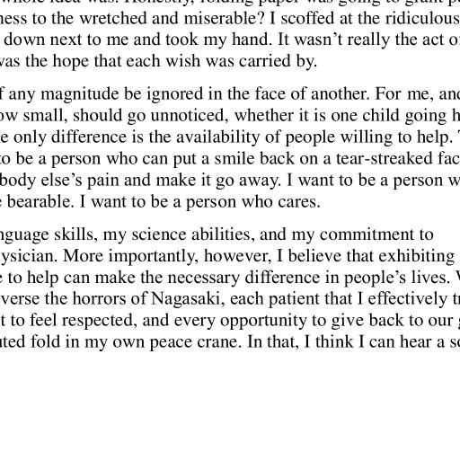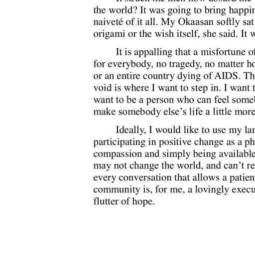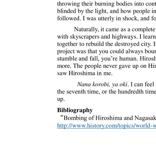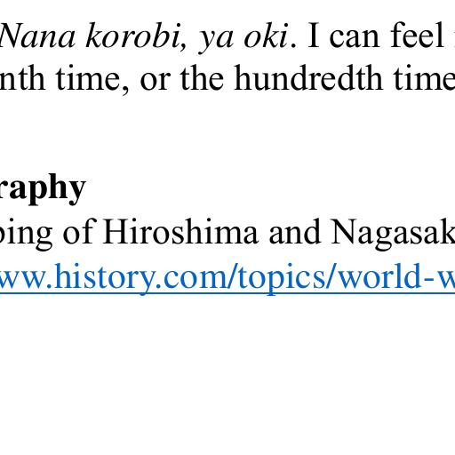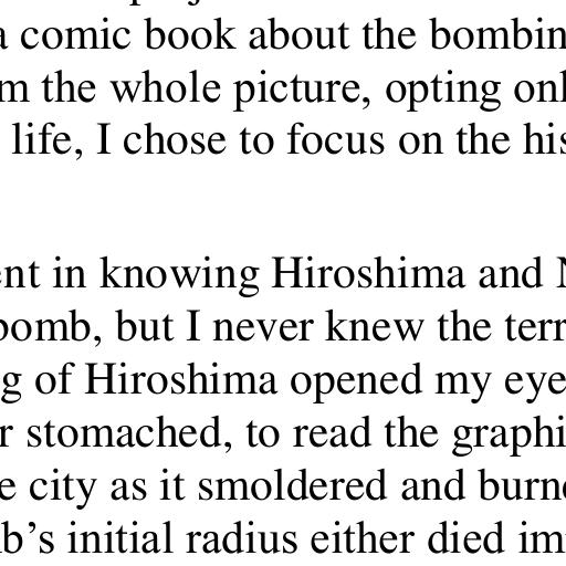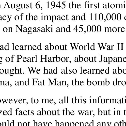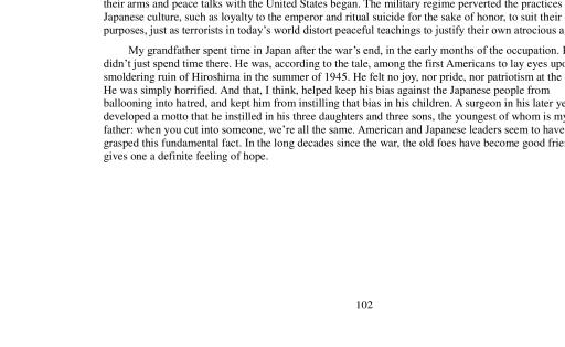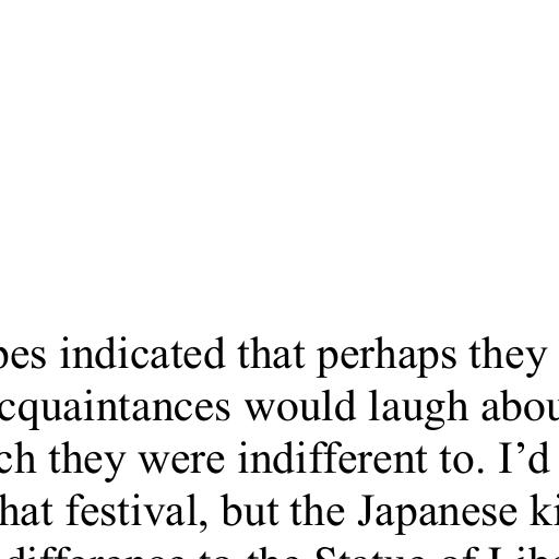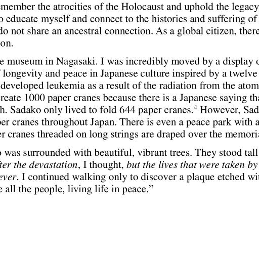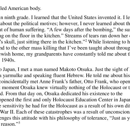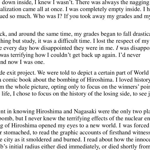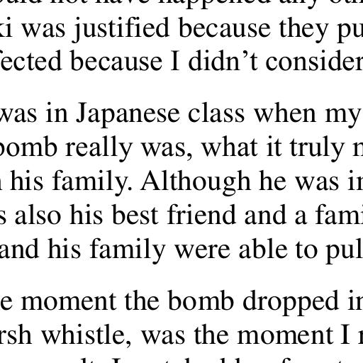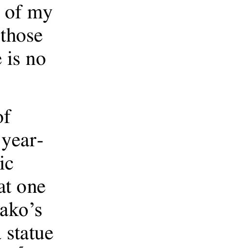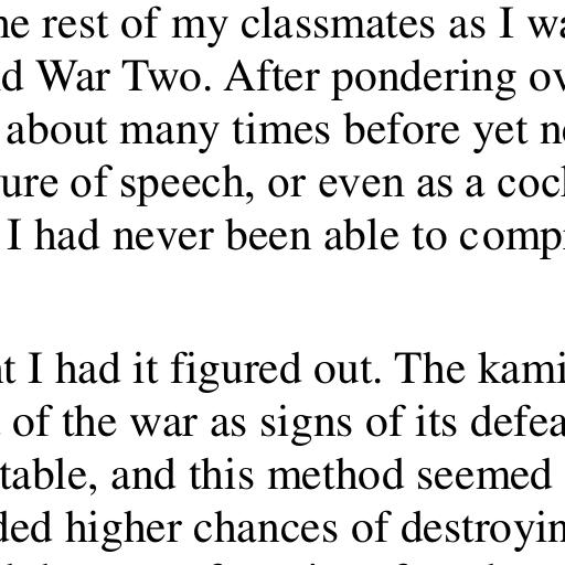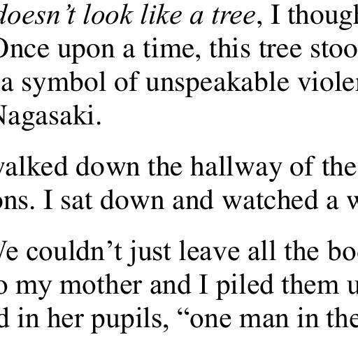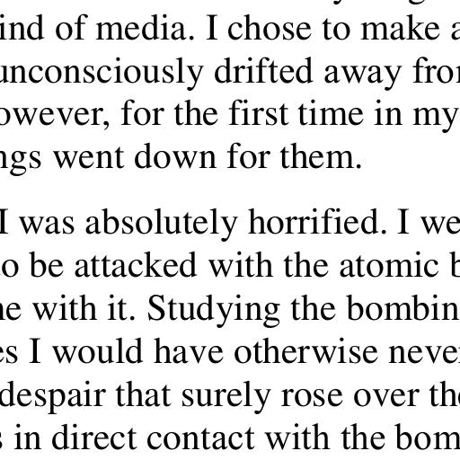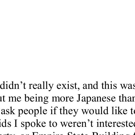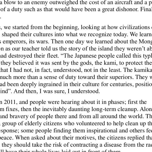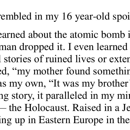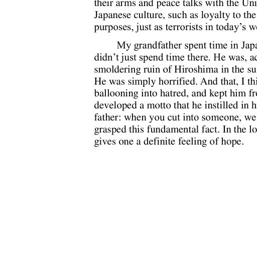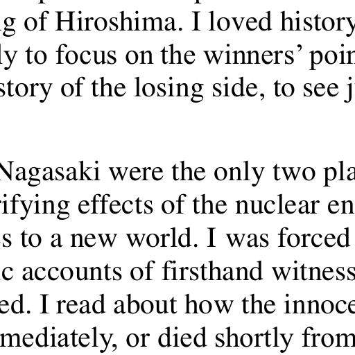 It was this story that came to me near the end of the semester when Sensei leaned forward, more animated than usual, and posed a question: if America were to launch a nuclear attack on Russia, destroying its entire population, should we feel responsible for the actions of our government? She asked us to raise our hands yes or no. For the first time in my life, I halfheartedly raised my hand between yes and no to give an opinion on a contentious topic. Yet I wasn’t undecided. I was curiously distant from the idea of making a decision, as though it was above my pay grade to be making decisions such as this.