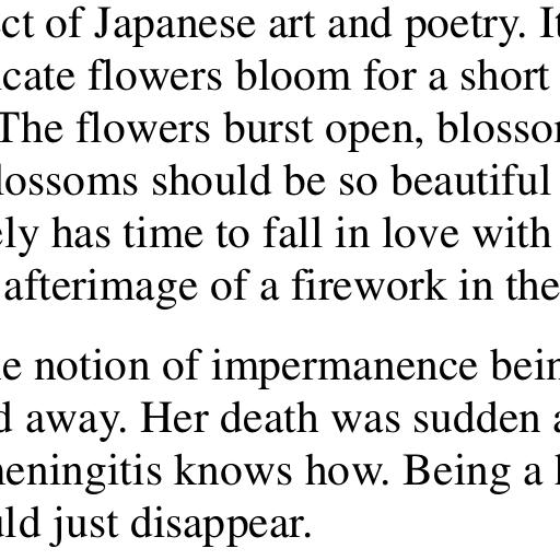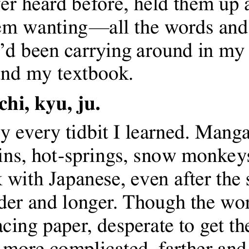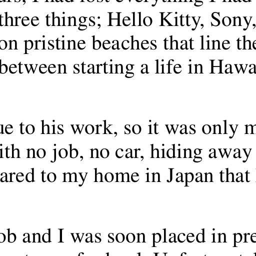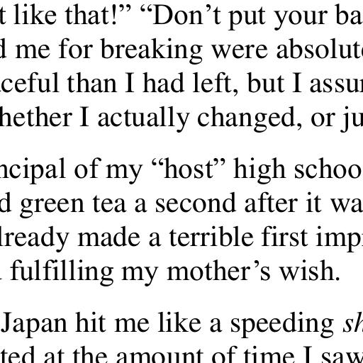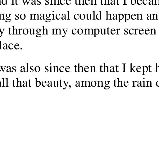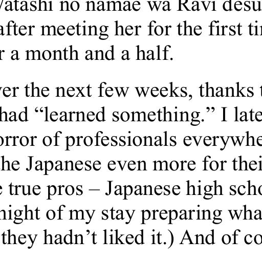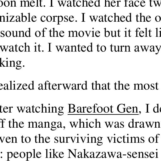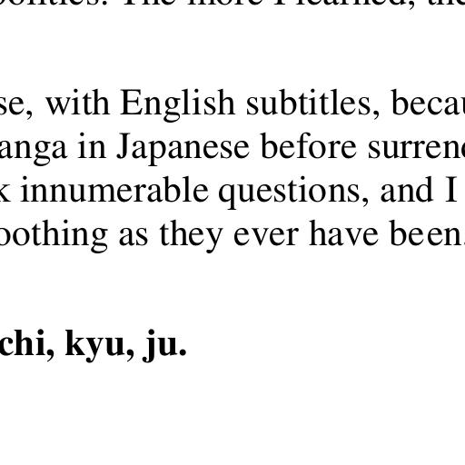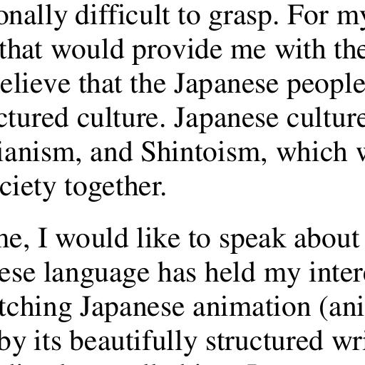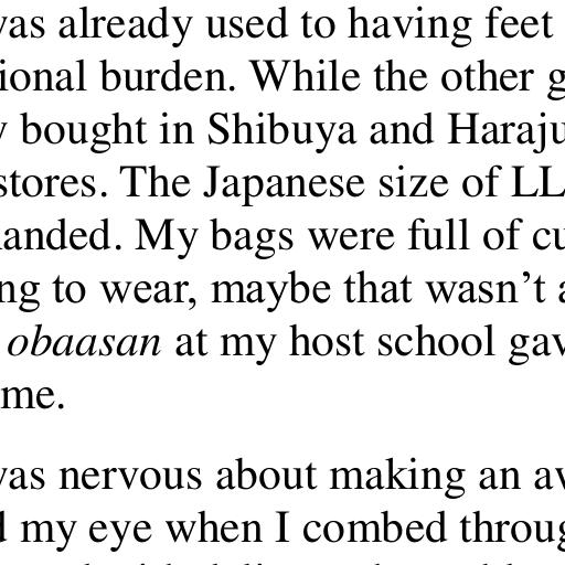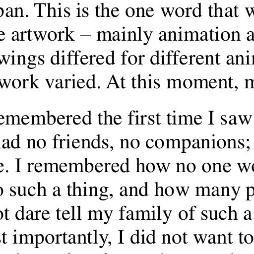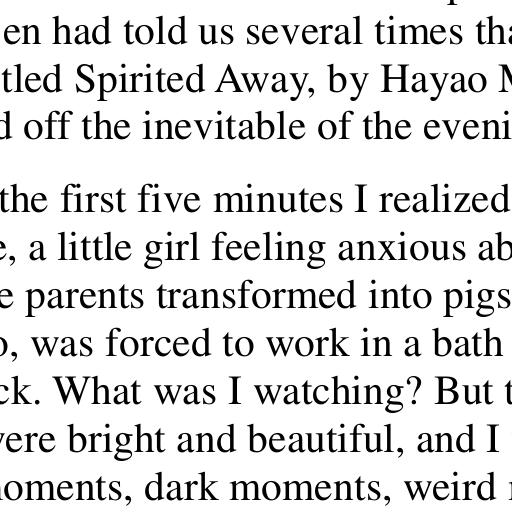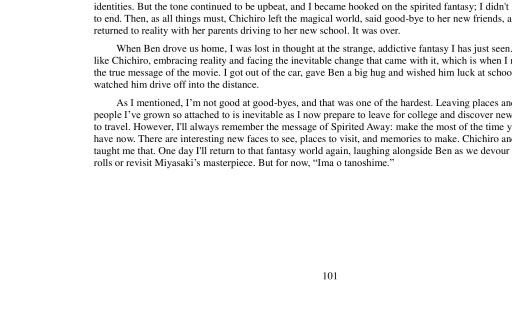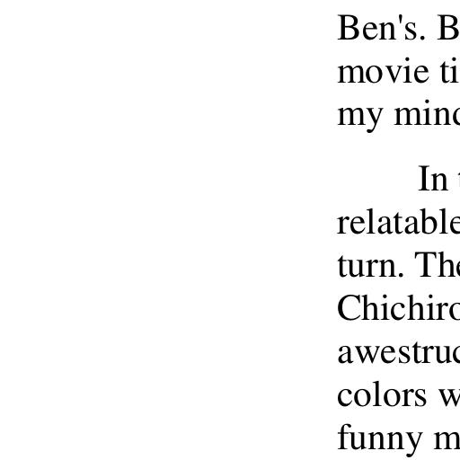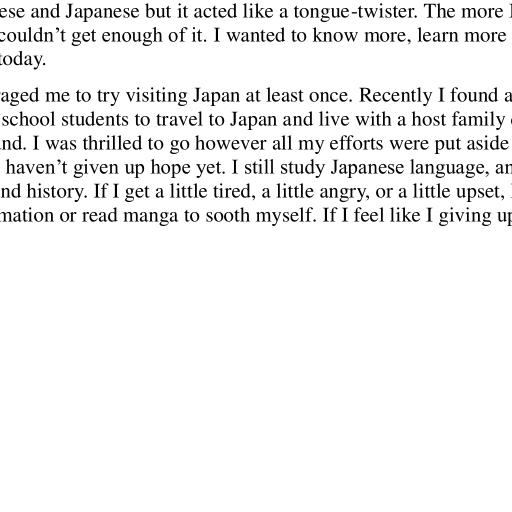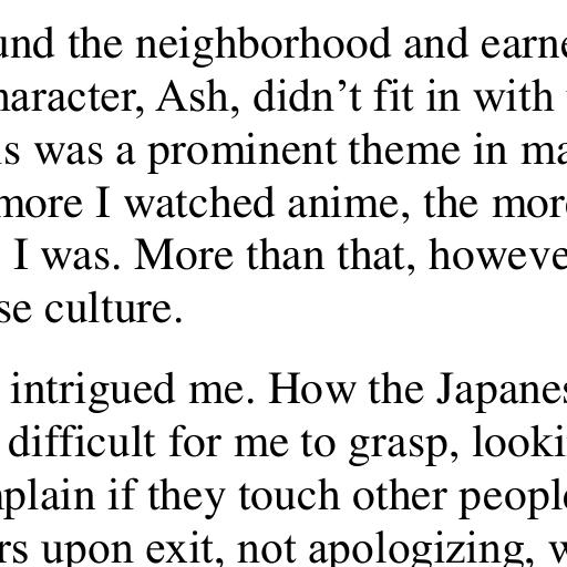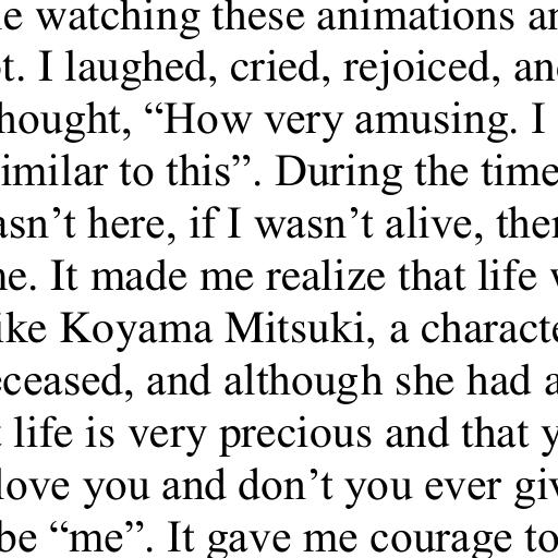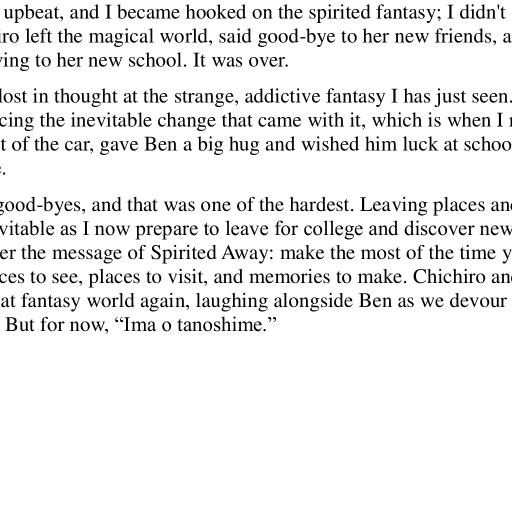I begged for another episode. And another, and another. Soon, I was watching more than just Bleach- Sailor Moon, One Piece, Durarara, the movies produced by Hayao Miyazaki and Studio Ghibli. I threw myself into the animations, jumping from show to show. That empty, ugly pit inside me began to become filled- not completely, but enough that I began to feel a bit confident.