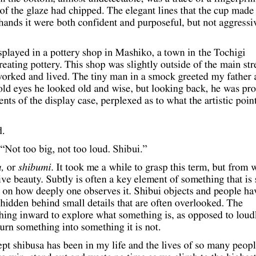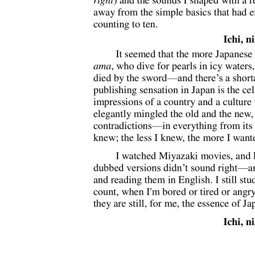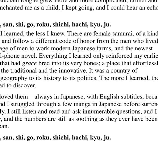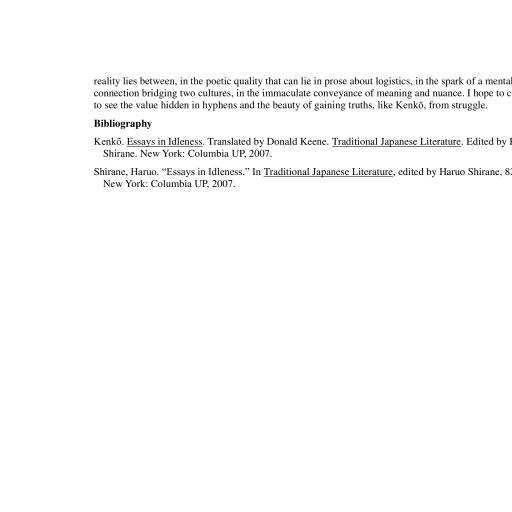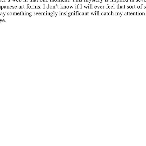 In his Nobel lecture, Japan the Beautiful and Myself, Kawabata opens with poems by Doegen and Myoe, both only two lines long each. The brevity of Myoe even allows me to include it here: “The winter moon comes from the clouds to keep me company. The wind is piercing, the snow is cold.” In the ensuing lines, Kawabata divulges on the context of Myoe’s poem, revealing its detailed, lengthy origin. Kawabata’s thrift in style also applies to expression. Instead of melodrama, Kawabata prefers the ambiguous. The novel opens the relationship between Shimamura and Komako en medias res; however, the fate of the two is not provided, even at the end. This ambiguity and thrift of Kawabata’s words does not stop them from being emotive. In the same idea, the limited ways through which we can understand Japan—in short of living there— such as literature or film, can still be relevant, even profound. Perhaps it is the existence of these seemingly accessible mediums of Japan, or projections, that allow for further probing, exploration, and appreciation.