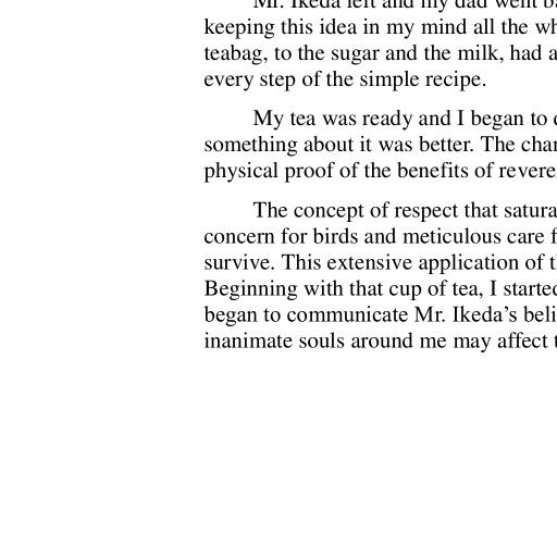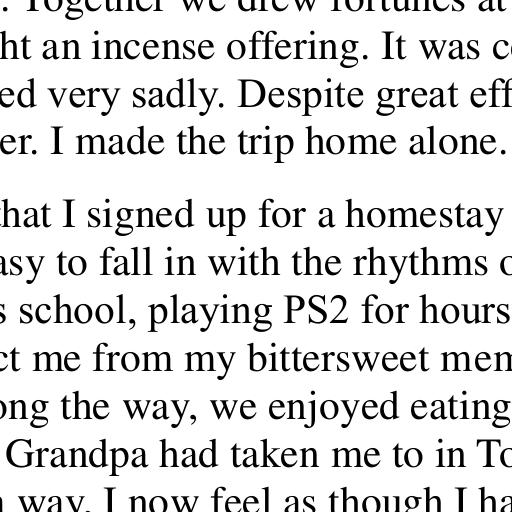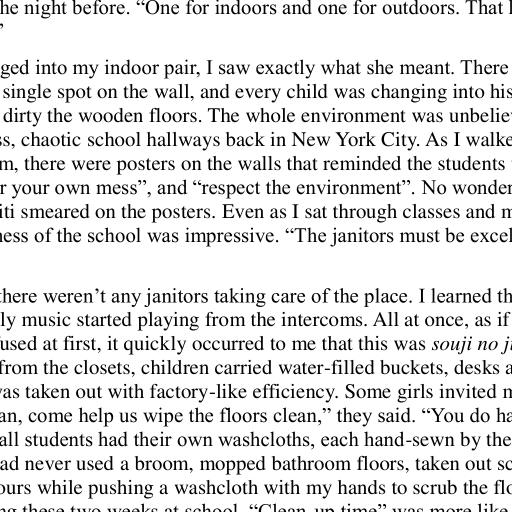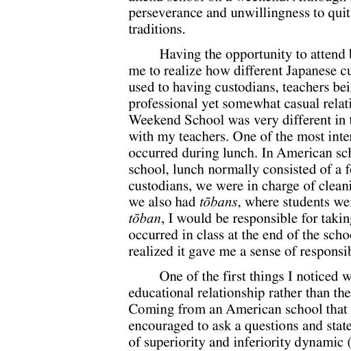 My life in the temple started on the next day. My parents encouraged that I train for discipline at temple for seven days with the monk and his wife. During my training, I would adopt a new Buddhist culture but I was not enthusiastic. Despite receiving the opportunity to learn about temple life, at the time, I only lamented being unable to meet my friends in Tokyo. However, my exposure to temple life changed my perspective on Japanese culture as a whole and would affect my life in Japan.