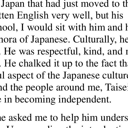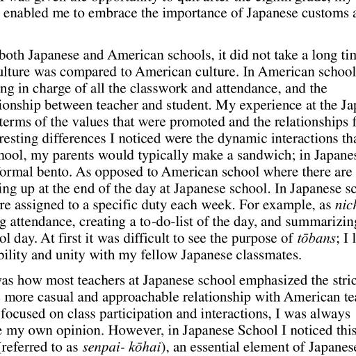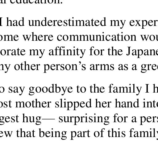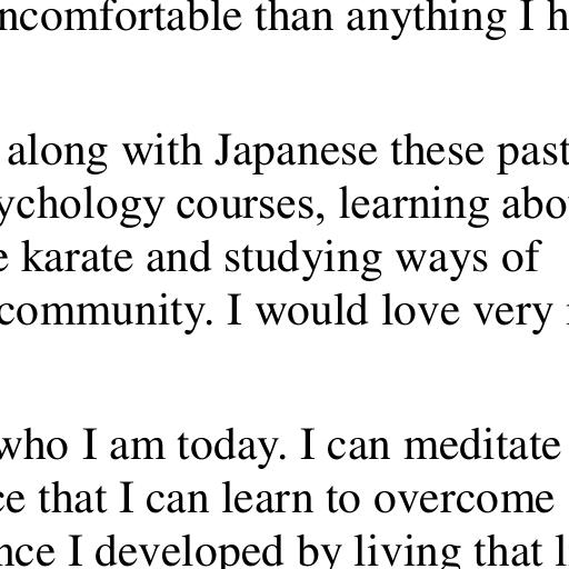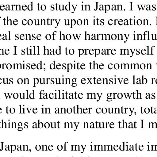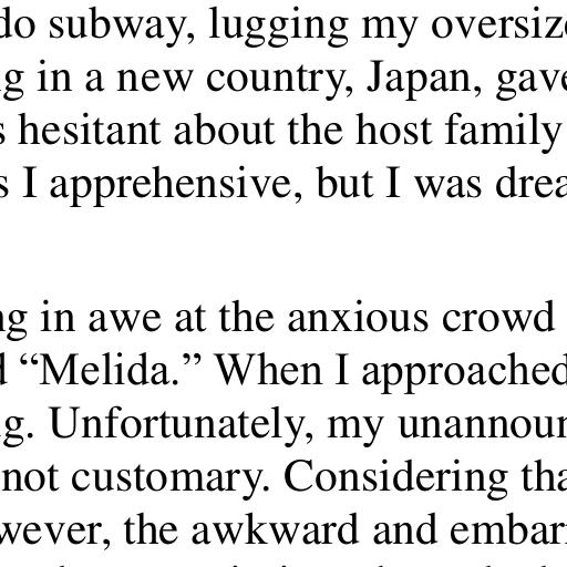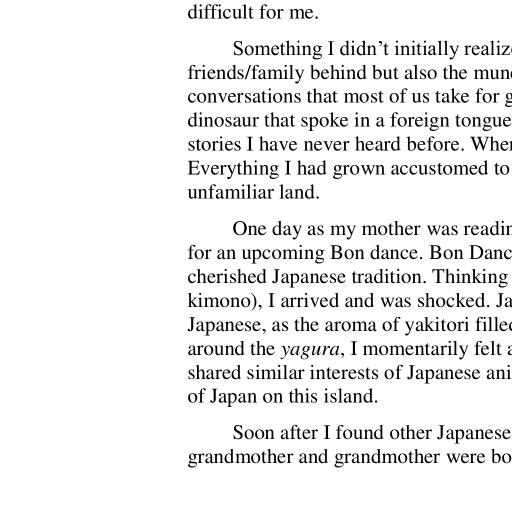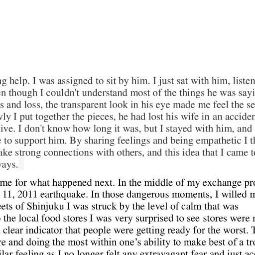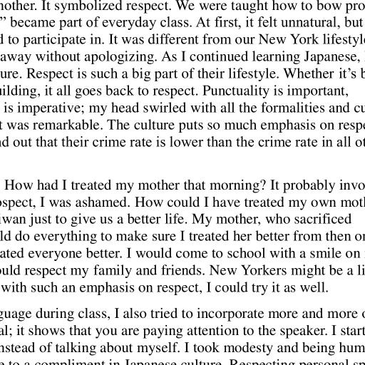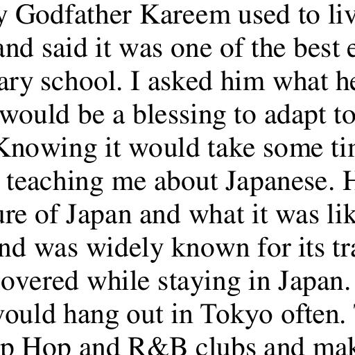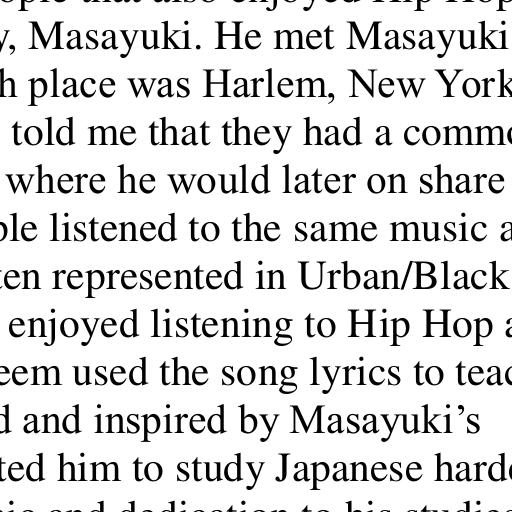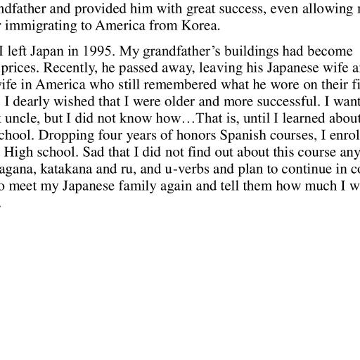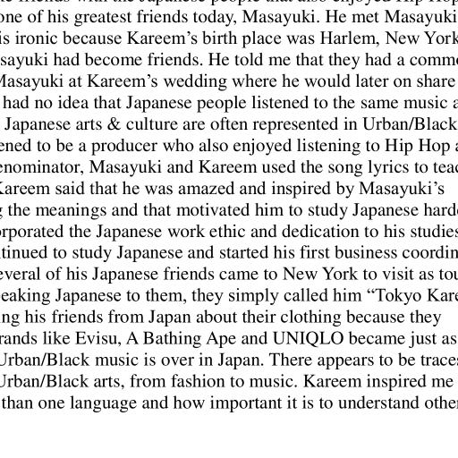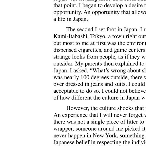 Growing up in West Harlem, I never imagined I would be experiencing the culture and community of Japan. I was not encouraged by my community or society to succeed in education. With my father absent from my life, and my mother unable to raise me herself due to how much she had to work to provide for us, being raised by my grandparents showed me the true meaning of appreciation. My mama and papa gave me all the warmth and care that I ever needed to believe in myself, and taught me to value education and my Dominican roots. Being under the wings of immigrants, I was able to synchronize my American identity with my Dominican heritage. This allowed me to have a deep empathy for my work in Japan, thanks to how they have nurtured me.