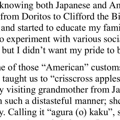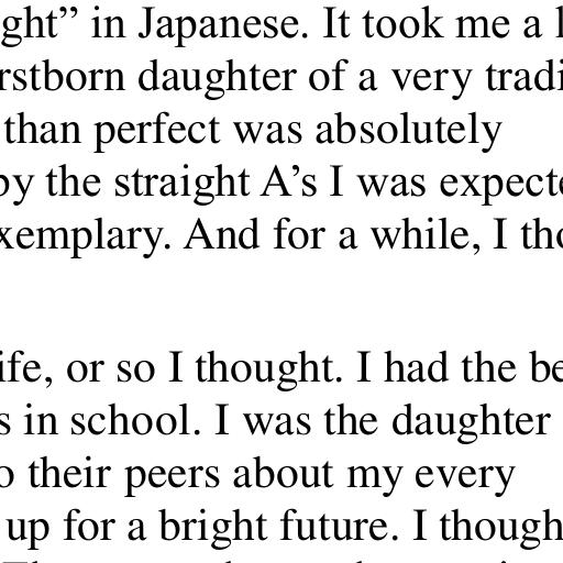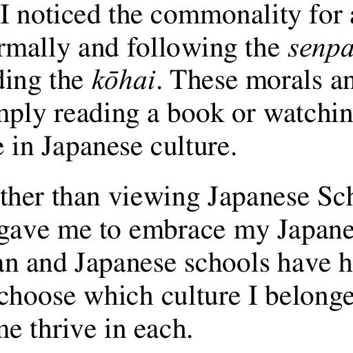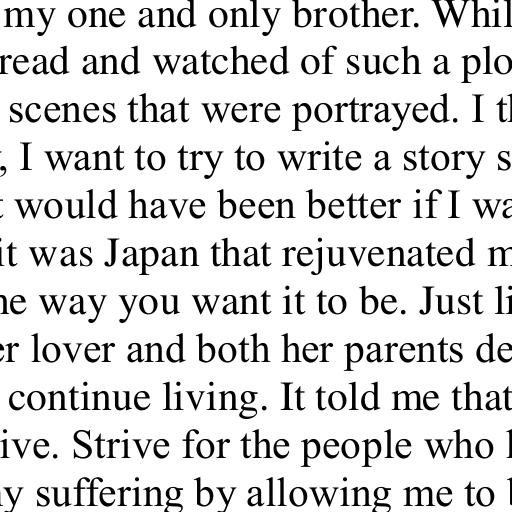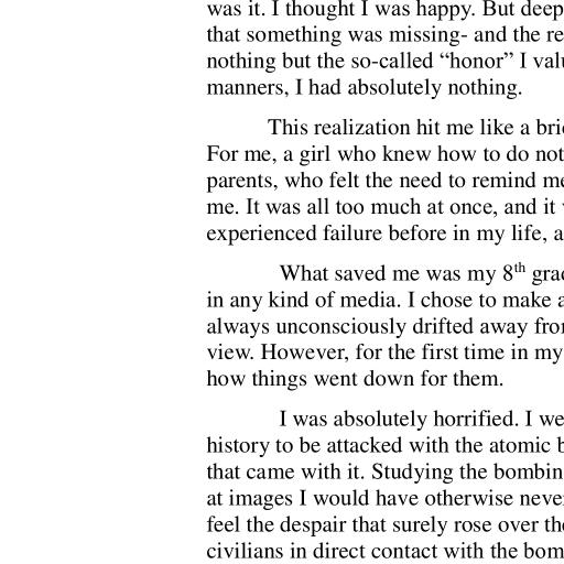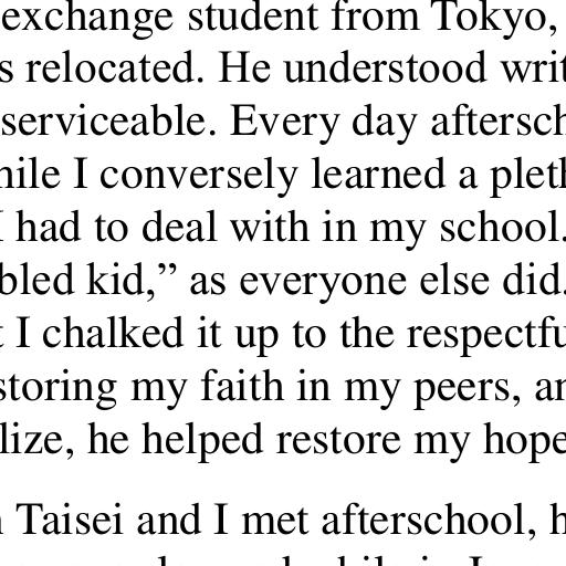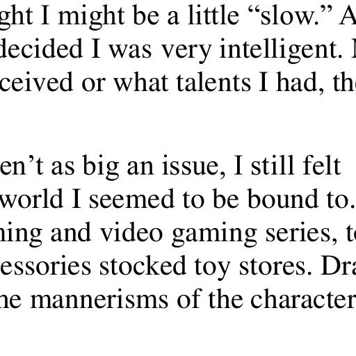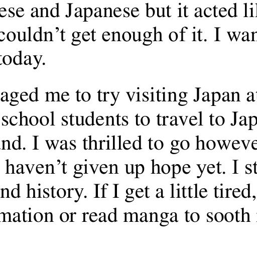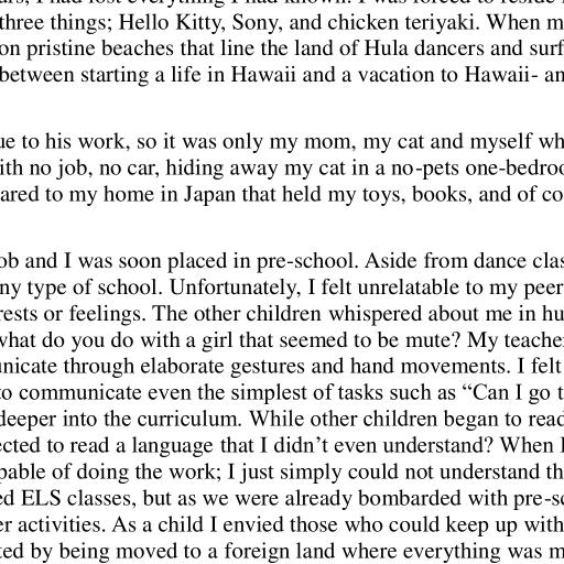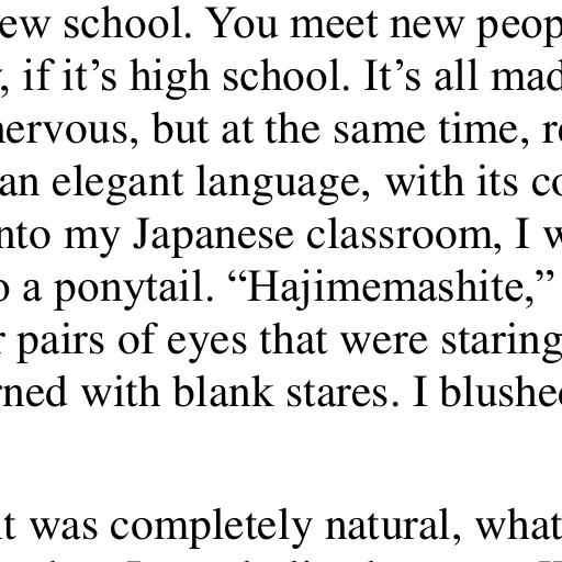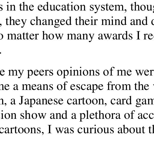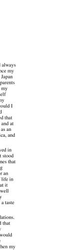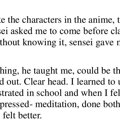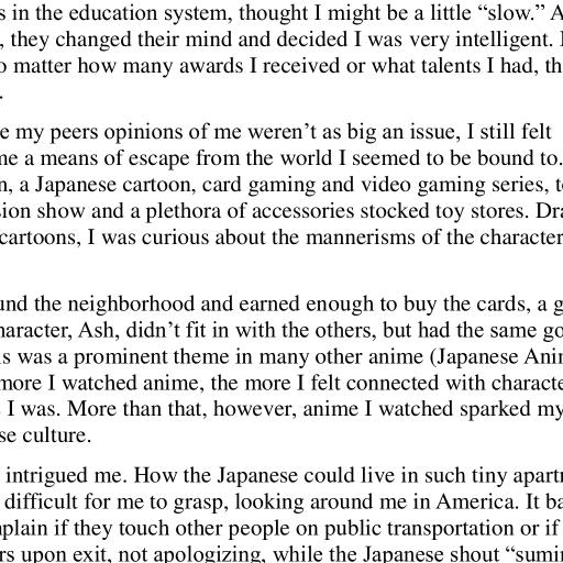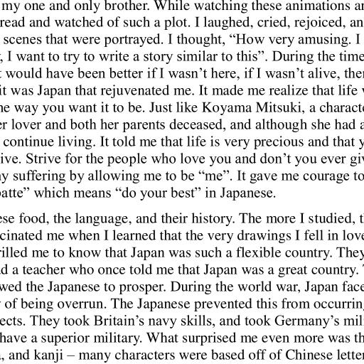 I slowly began talking to other people about my interest in Japanese animation. There were some who didn't understand my love at first, like my grandmother. And there were some who completely understood, like my brothers. Either way, just talking about it gave me the chance to open up, even if it was for just one conversation. A new me was beginning to form, like a pupa finally cracking open its shell. On my first day of middle school, I introduced myself to my peers, not with silence or just a quick statement of my name. “My name is Tia, and I like anime,” I said simply, praying there would be others who would understand and react. Thankfully, there were. I became a part of a group that could relate to each other, even with all of our differences. I began to talk about more than just my love for animation, finally breaking down the barrier that surrounded me.