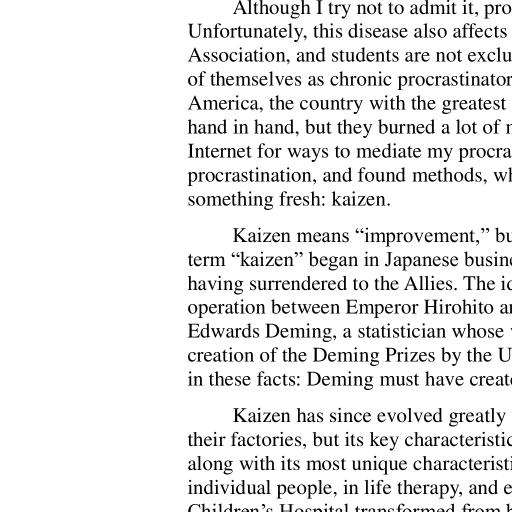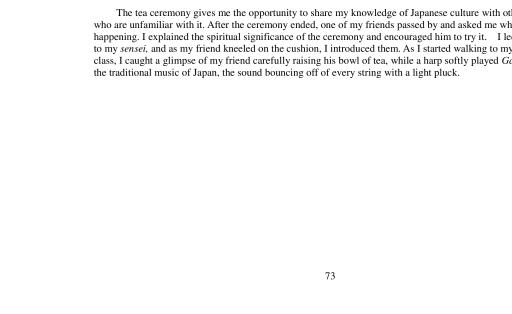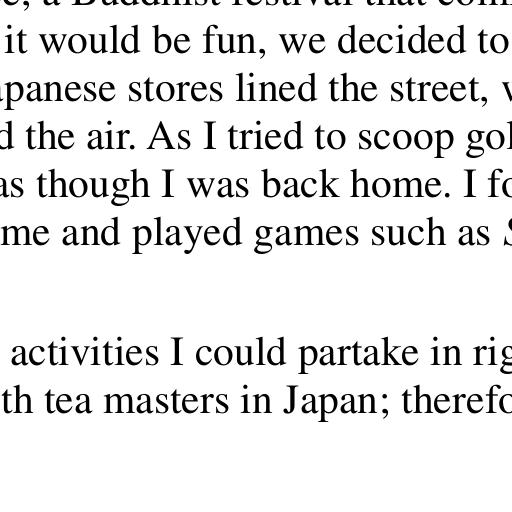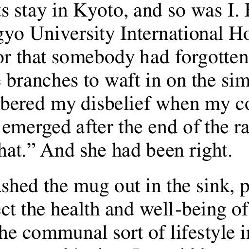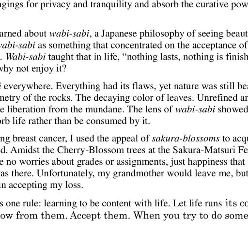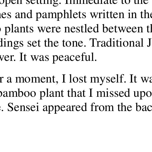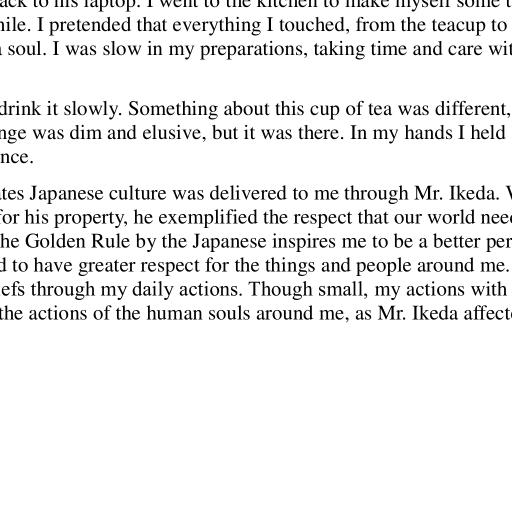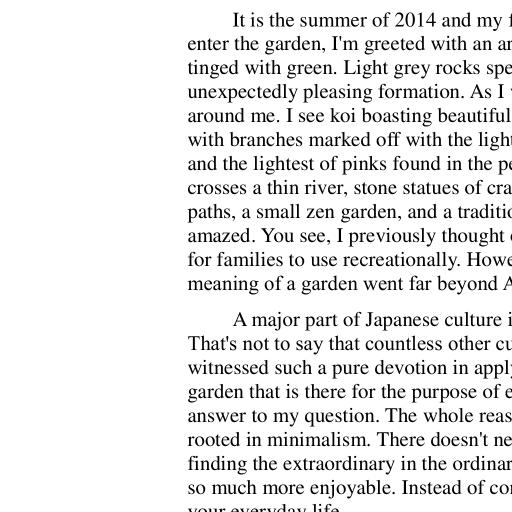 When I arrived at the temple, I was astonished. The temple I visited, called the Kaifuku-in, was located among 45 other temples in a place called Myoshin-ji. Kaifuku-in was surrounded by a white wall with a wooden entrance. As I entered the gate, I was greeted by trees that twisted and spun in every direction, a small dilapidated temple of a wood construction and a friendly elderly couple, the monk and his wife. They led me to the entrance, and I was surprised by the state of the temple. The ceiling seemed as if were about to collapse at any moment, the floor creaked for every step, and the balcony had a gaping hole. I walked up a narrow flight of stairs to the room I was going to stay. The summers in Japan are always very humid; moreover, the lack of fans made the room very hot. As I spoke with the monk, the sweat dried off my neck, and I could feel the rugged salt that it felt behind. The only means of cooling off was drinking hot tea. While I was skeptical at first, it seemed to work. In the blistering heat and on the hard floor, I, uncomfortably, underwent my first night at the temple.