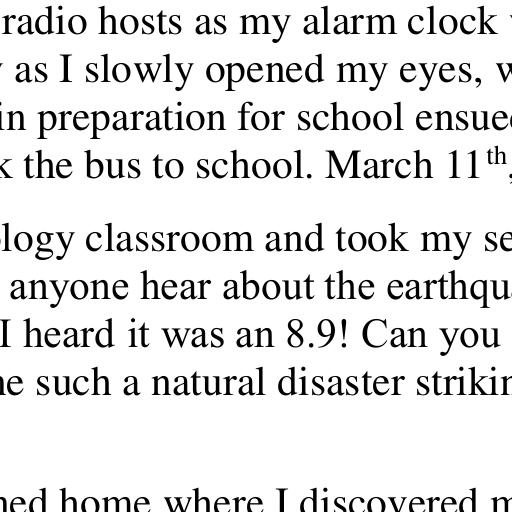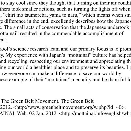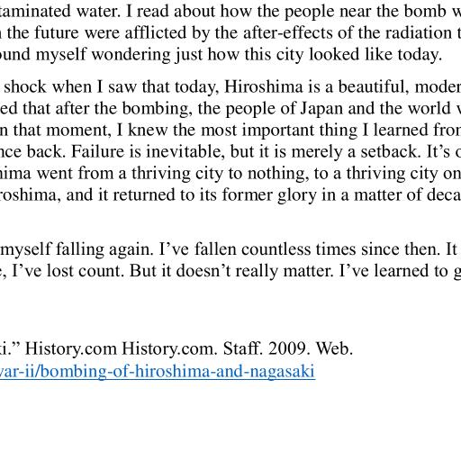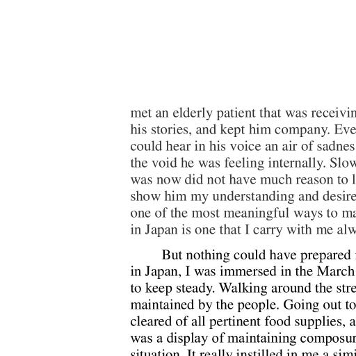 We finished our lunch and dessert and left to explore a ravaged park on the outskirts of the historical site. The buildings were strewn with glass and sharp objects, with walls riddled with holes. What struck me was the destruction left by the earthquake and tsunami---there, and in regions I had visited all throughout Kamaishi; the once vibrant communities were reduced, in most places, to desolation. In that moment, I truly realized the importance of finding my place in rebuilding the world. This disaster in such a beautiful tranquil place will forever mark what sparked my passion for environmental advocacy moving forward.