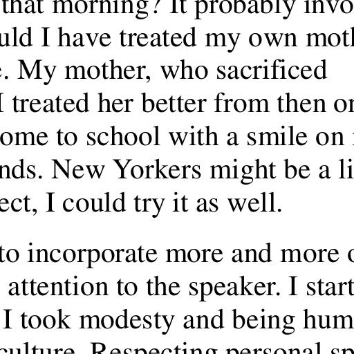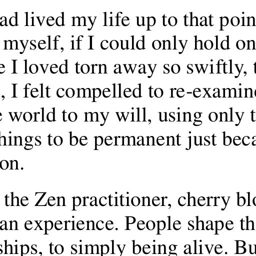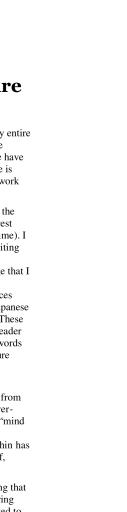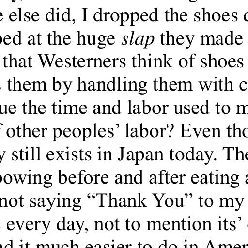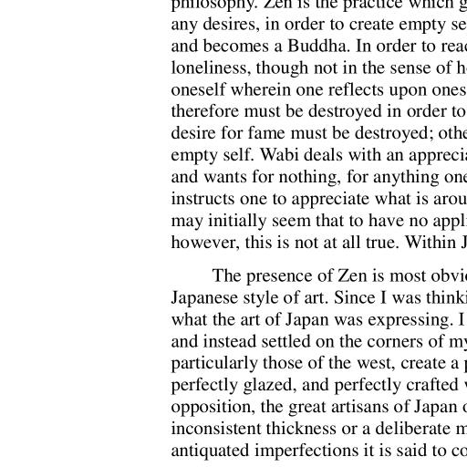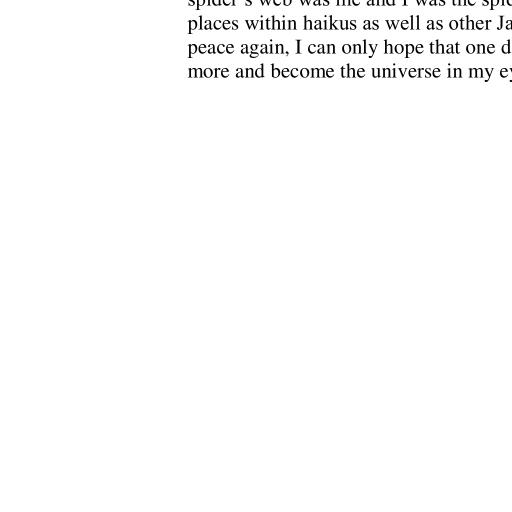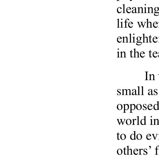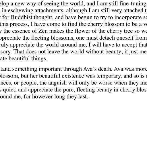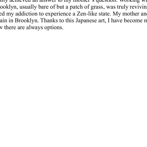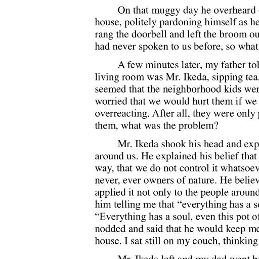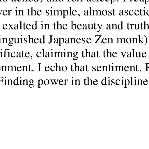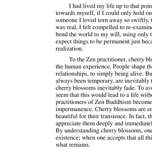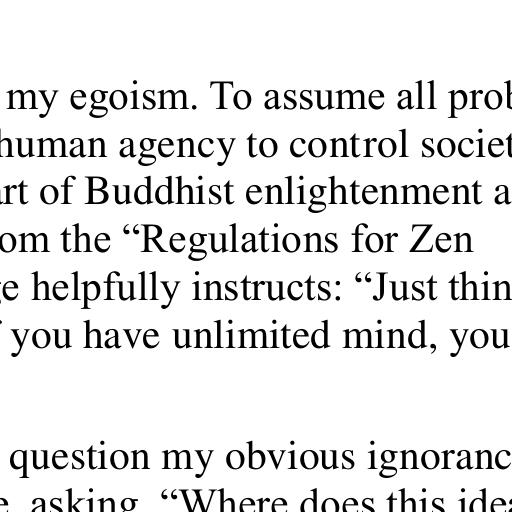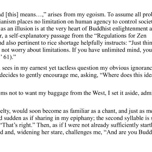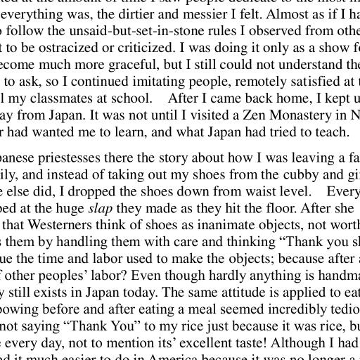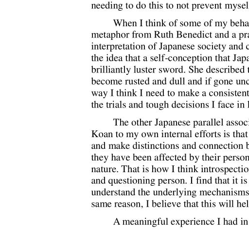 I realized that I had decided to metaphorically sit at the feet of Sensei and confess that I truly couldn’t answer the question. Even when a lively discussion ensued that raised issues I felt strongly about, I didn’t feel the urge to join in. I was rewarded when Sensei settled the question. It wasn’t about protesting the government for nuking Russia, or realizing that Americans are, in fact, apathetic people. You should see everyone as your mother and father, she said, and realize that their evilness is a reflection of your own, and therefore, blame yourself. Satisfaction grew in my chest at my reticence to make a decision, and at understanding the nature of the question and then stopped cold. Jinen Honi. I realized I had been profoundly wrong.