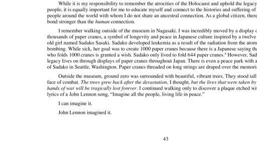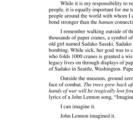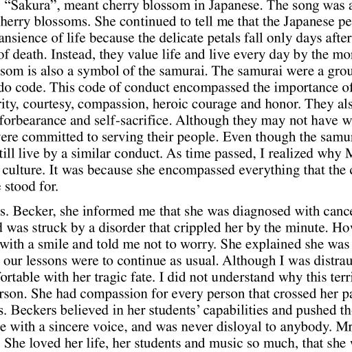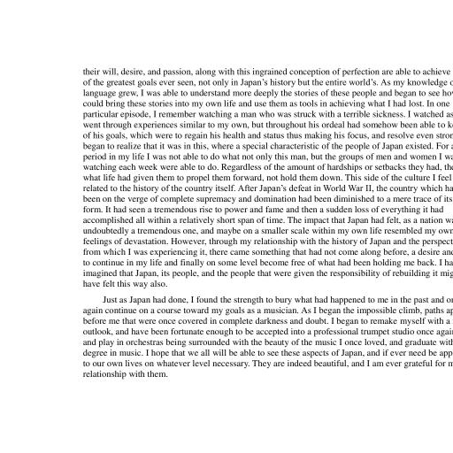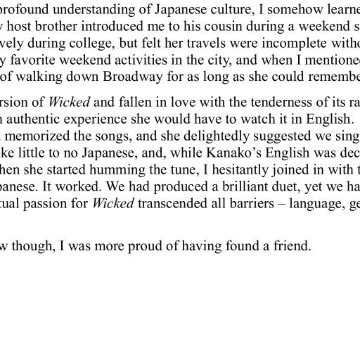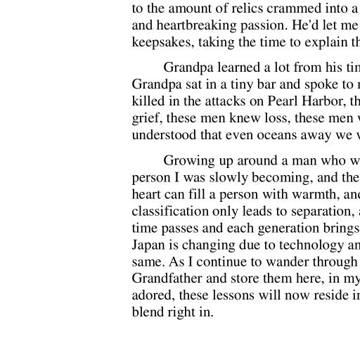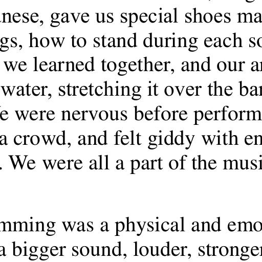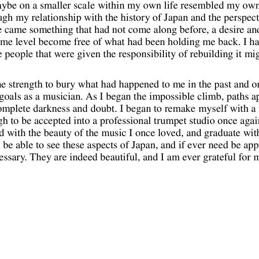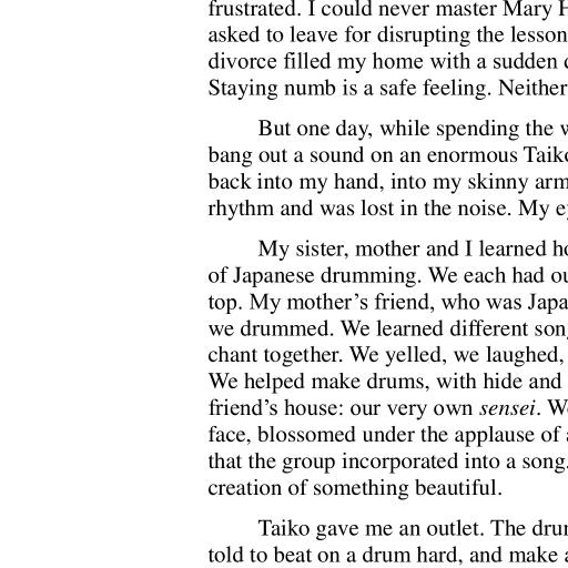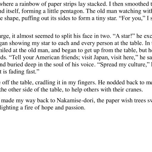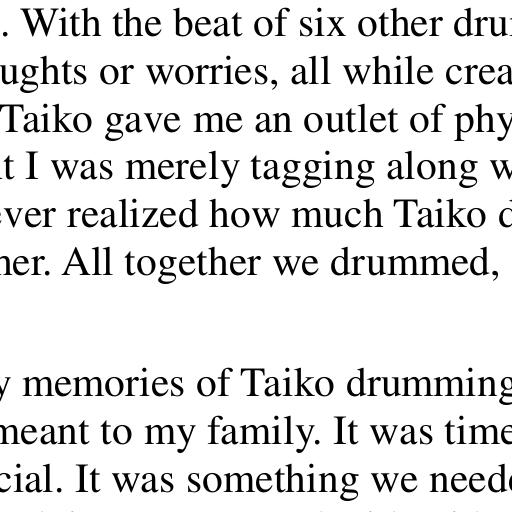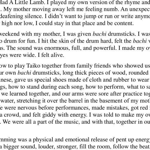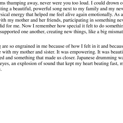 The music we learned and played throughout Japan taught me the power of spreading positivity, as loud as a wadaiko drum roar. I vowed to practice spreading love and virtue when I returned back to the states, and always in my life. At the end of the night, we left remarks in the shop owner’s guestbook. “Arigatou gozaimasu,” I wrote, showing my gratitude, hoping that peace could be returned to her life, as I finally, with new eyes, started to begin mine.