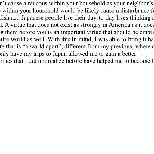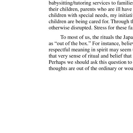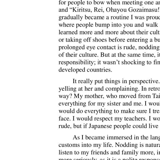 Every time my family visits Japan, I would go to the graves to pay respect for my ancestors. Frequently visiting, I would notice the graves were clean and free of dirt. Throughout my work at the temple, I realized that monks toil to condition the graves to be presentable. From the many stories I heard from the monk, I learned how Buddhism is deeply integrated in Japanese culture (i.e. the holiday Obon, which celebrates dead ancestors); thus, it is imperative for monks to pass on the teachings. My experience at the Kaifuku-in taught me how monks humbly support the everyday life of Japanese people without much acclaim.