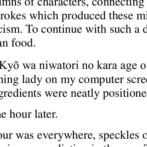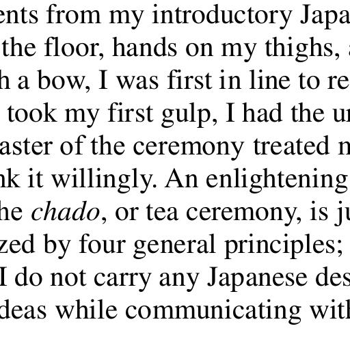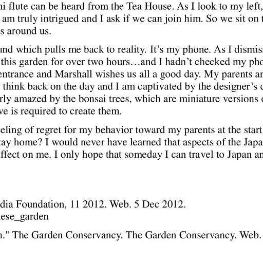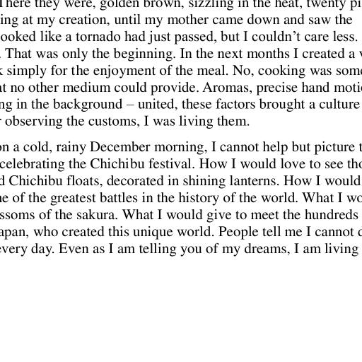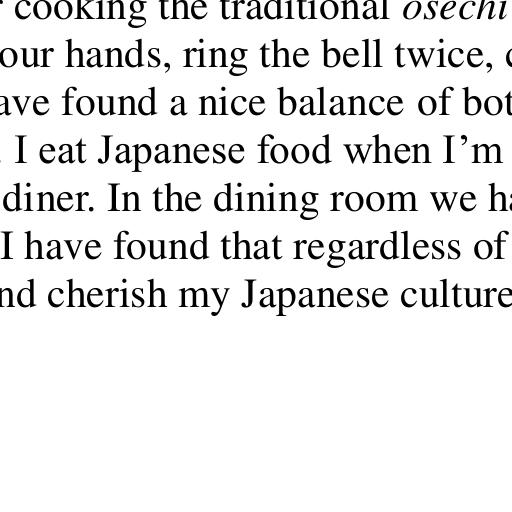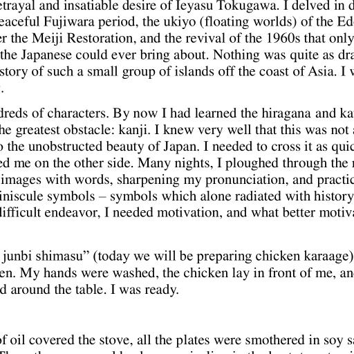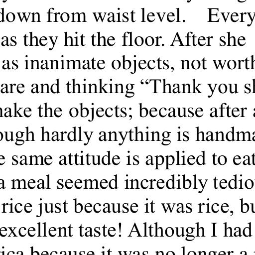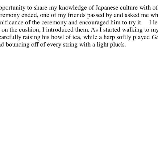 The following morning began at 4:30 am when the monks rang a bell, called Bonsho, which vibrated throughout Myoshin-ji; the monk began praying as I washed the walls and floors throughout the temple with a wet rag. The labor was exhausting, and I was out of breath by breakfast. Before we began eating, the monk would recite a prayer, which I learned to memorize by the end of the week. After delivering the prayer, we were allowed to begin eating. Because of the monk’s diet, my meal also lacked meat; the meal, called Shojin Ryori, consisted of vegetables such as eggplants, mushrooms and tofu. The monk would talk about the history of Buddhism and his experience as a monk; the stories were entertaining and I enjoyed learning about the temple. At first I disliked eating; yet, as time passed, I began to eagerly await the meals.