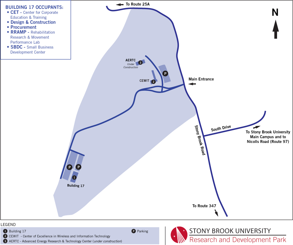 • Travel one mile (passing the CEWIT Building on the right) and Building 17 will be